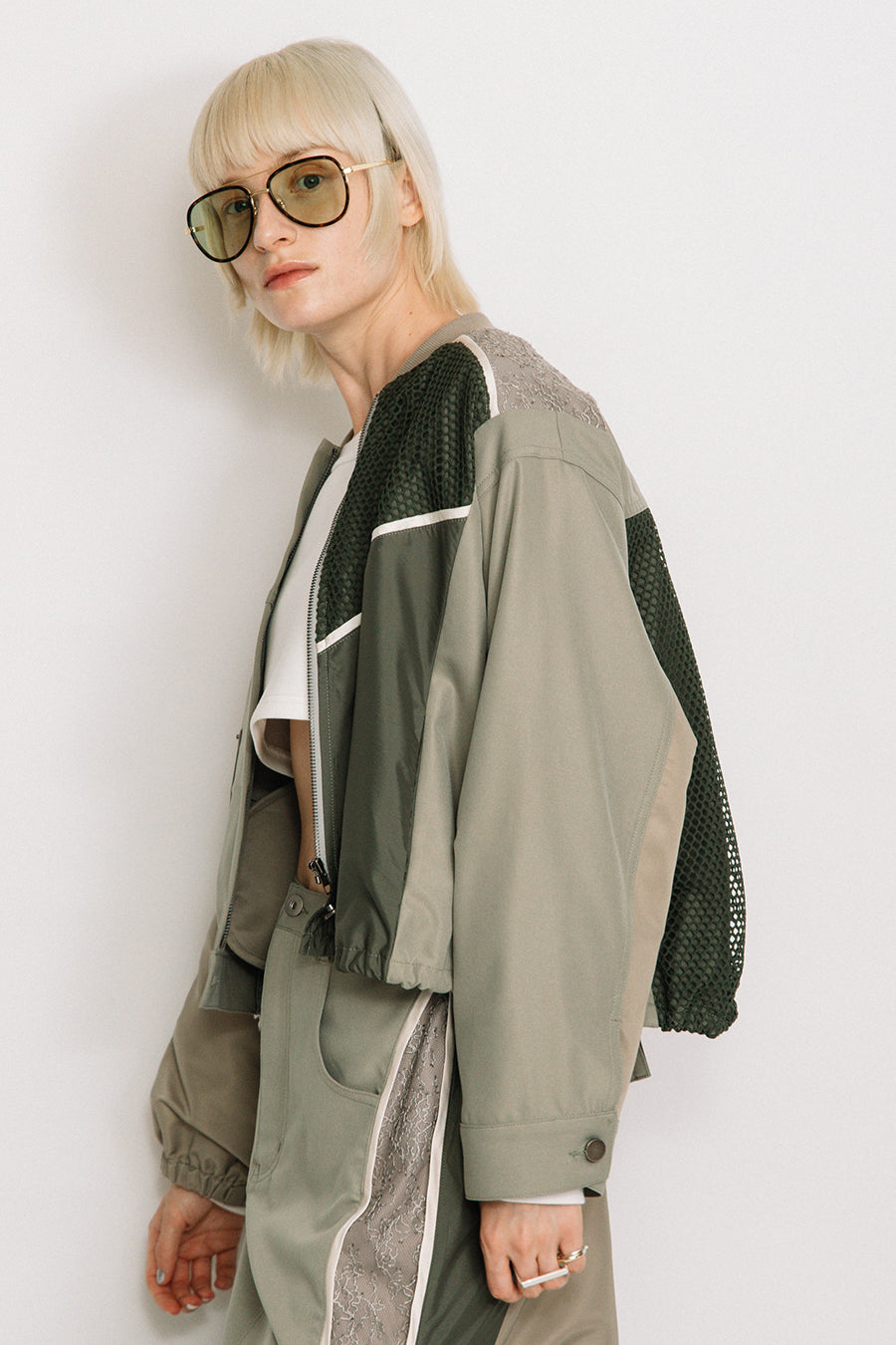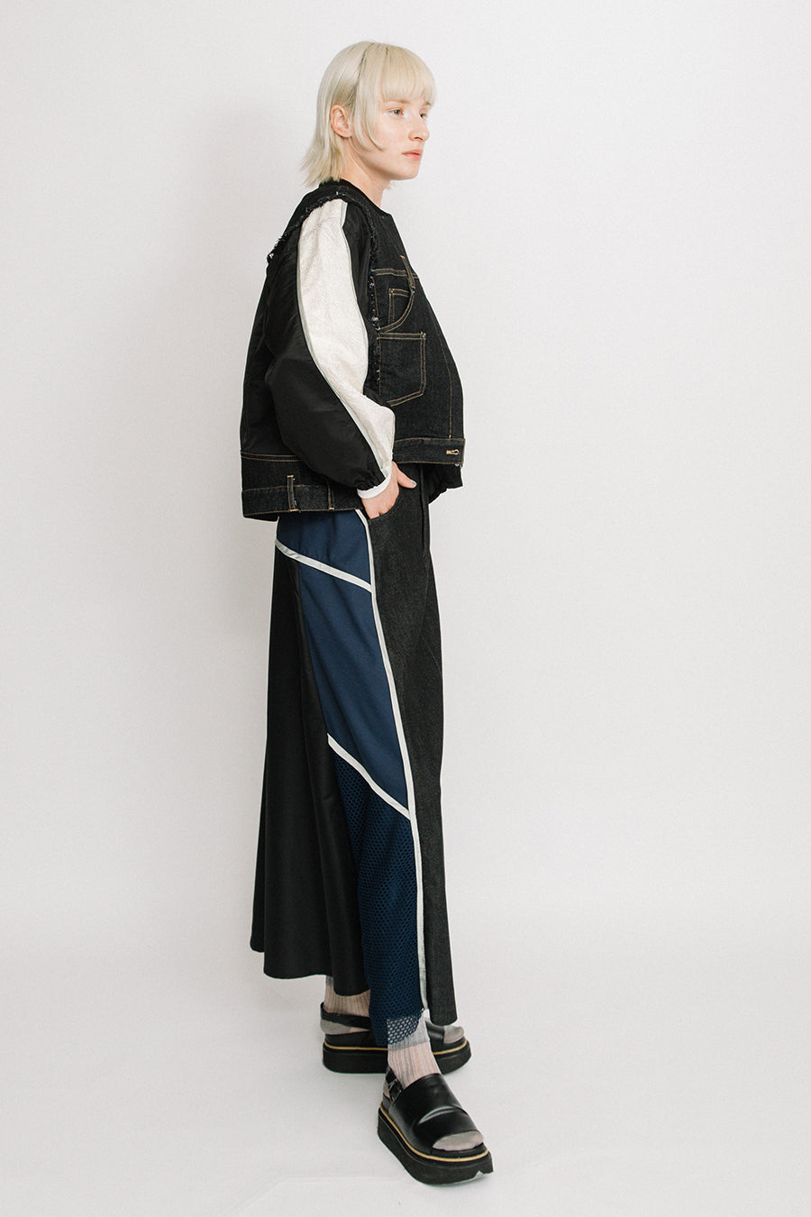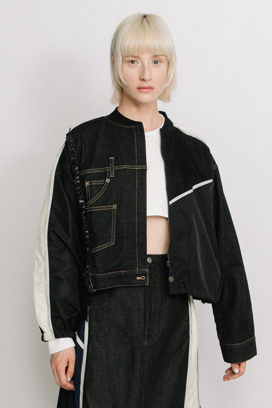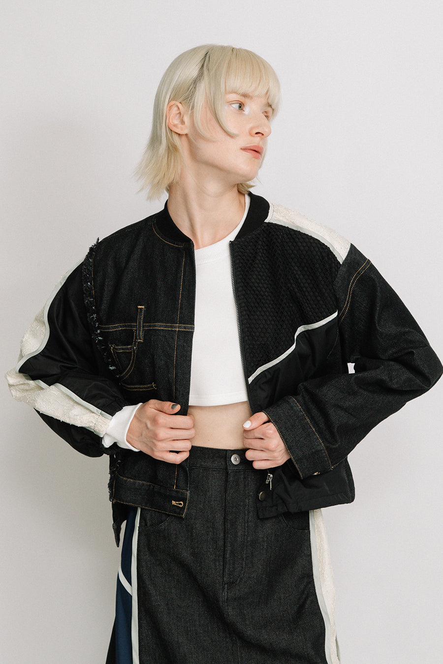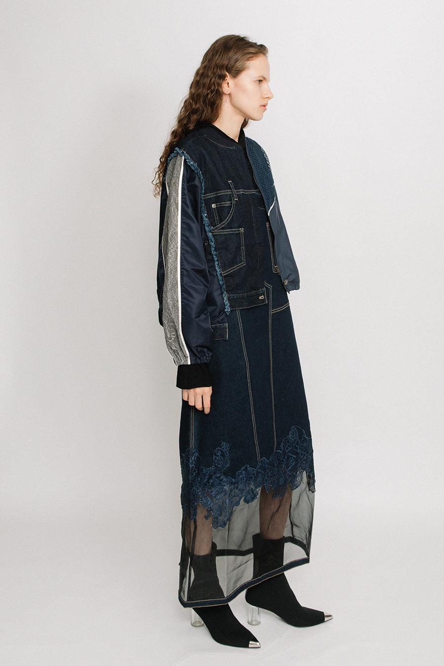 デニム、コットンポリエステルツイル、2色のタフタ、メッシュ、レース、サテン、ナイロンツイルの7種類の素材を使用し、32パーツに切り替えたマルチデザインの春アウター。