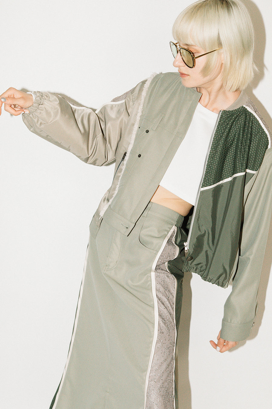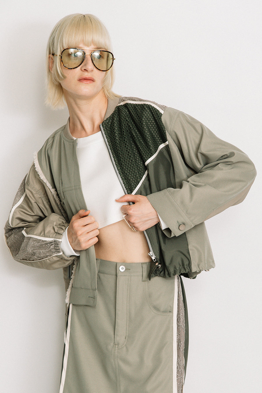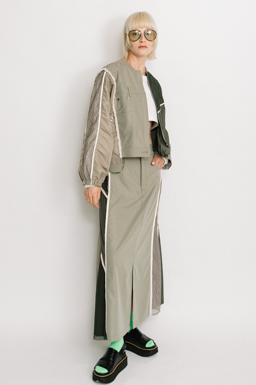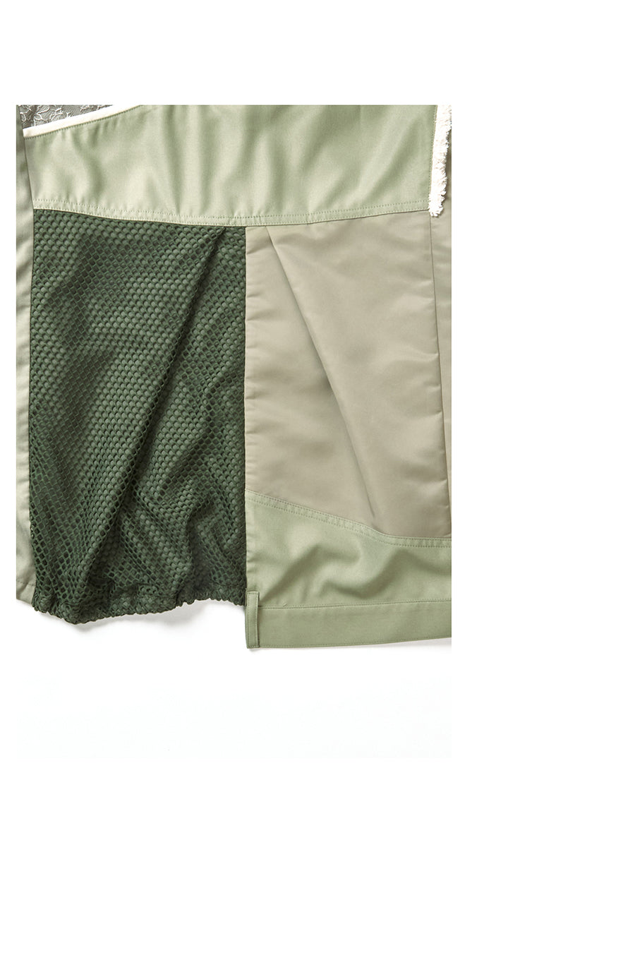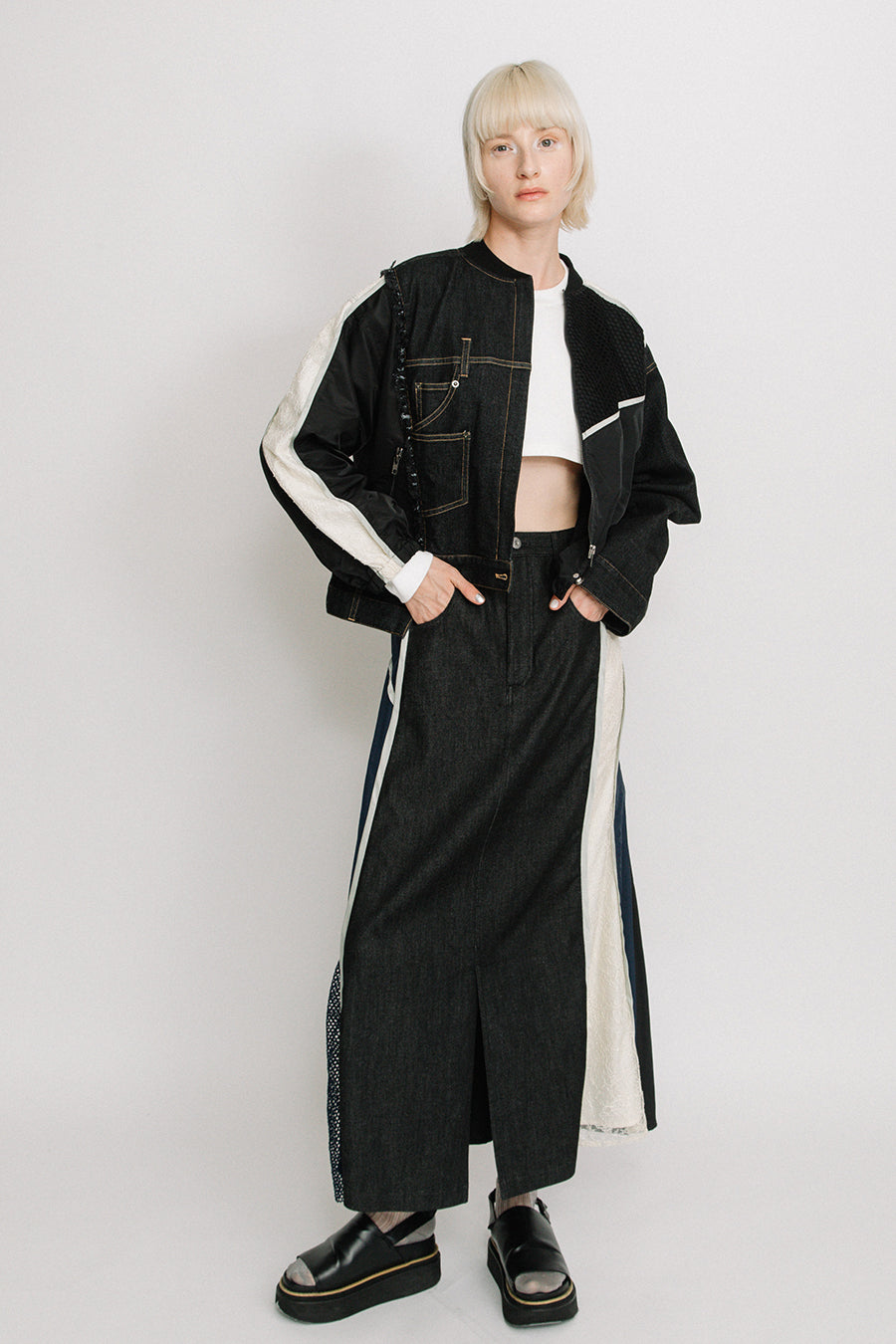 デニム、コットンポリエステルツイル、2色のタフタ、メッシュ、レース、サテン、ナイロンツイルの7種類の素材を使用し、32パーツに切り替えたマルチデザインの春アウター。