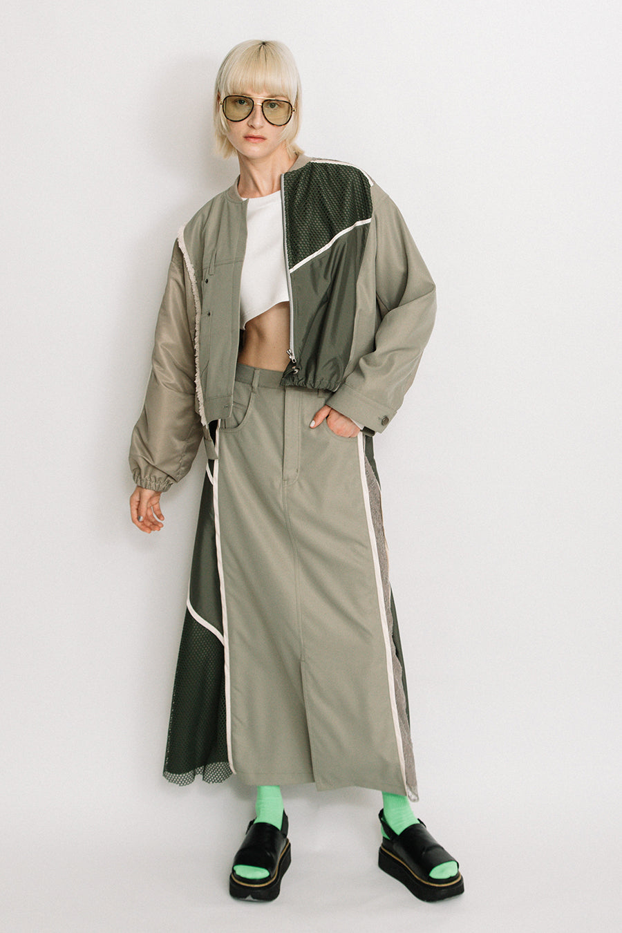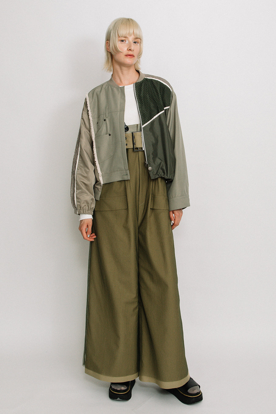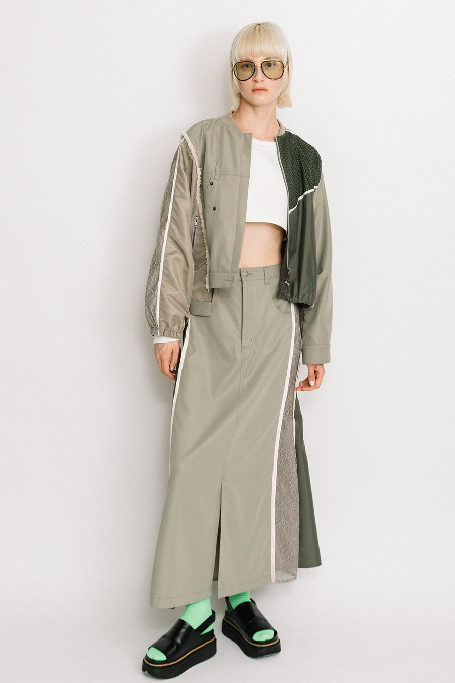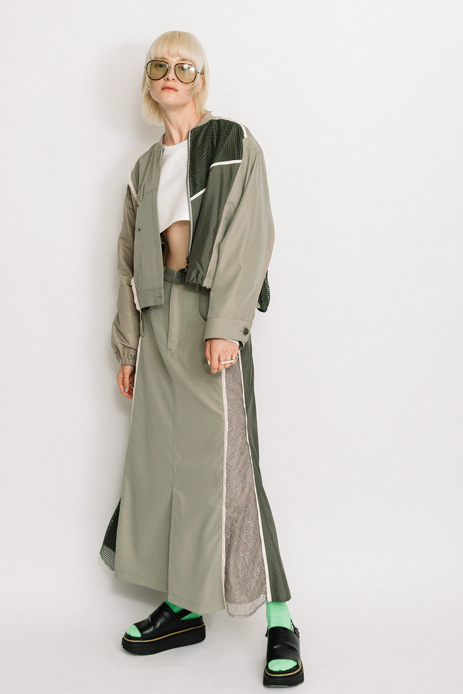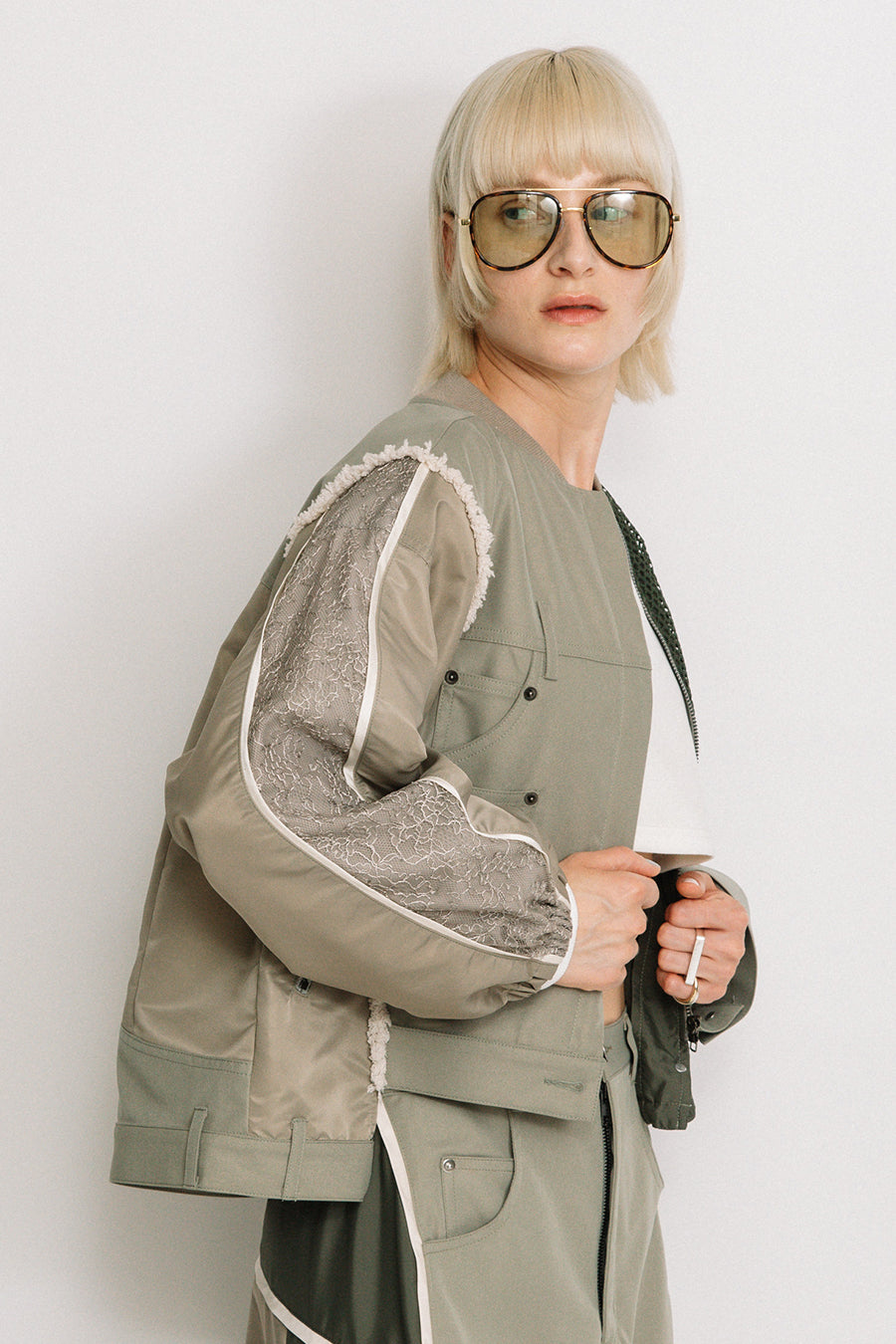 デニム、コットンポリエステルツイル、2色のタフタ、メッシュ、レース、サテン、ナイロンツイルの7種類の素材を使用し、32パーツに切り替えたマルチデザインの春アウター。