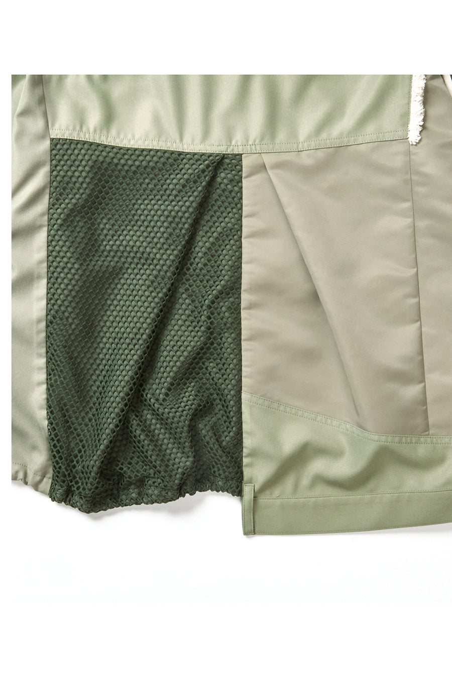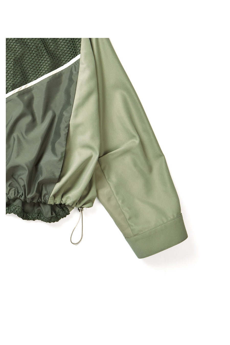 フロントは着脱し易いジップアップ、左裾はドロスト仕様で、絞ると膨らむシルエットに。