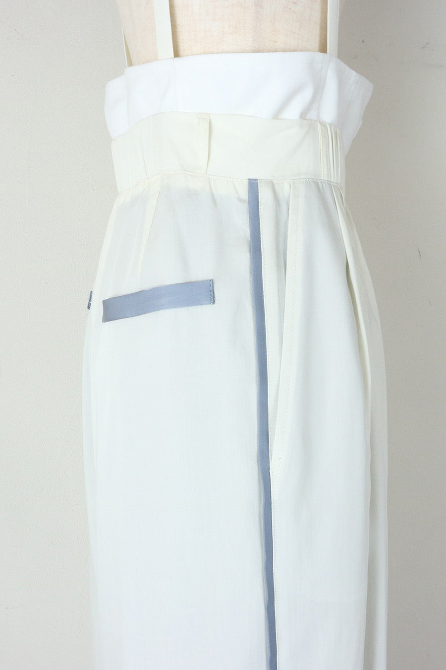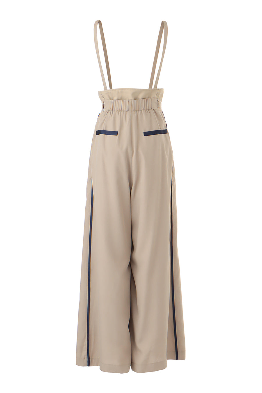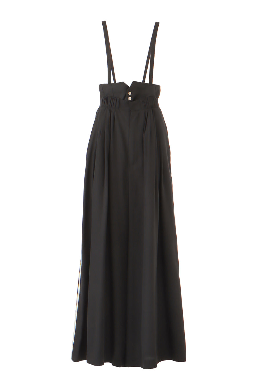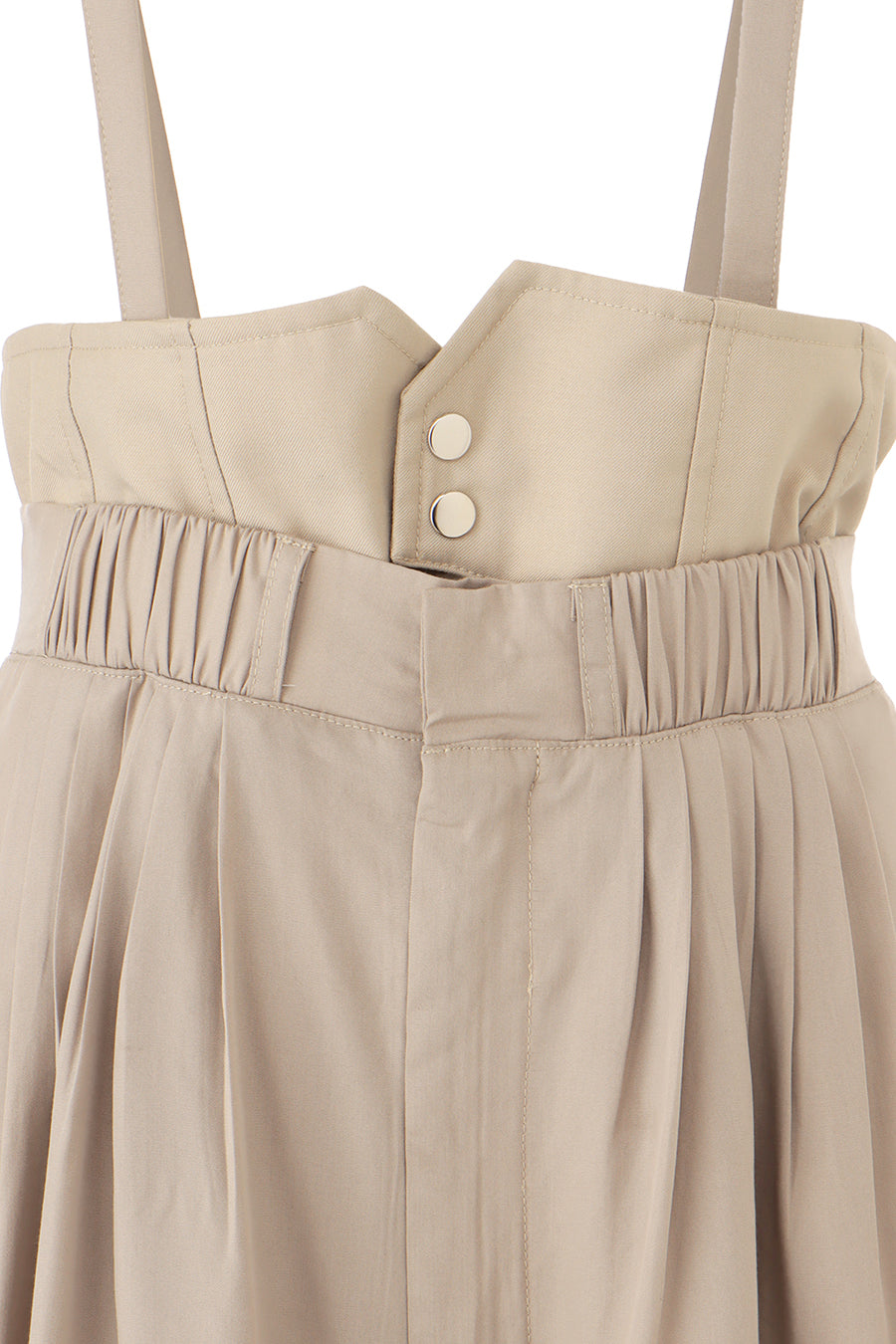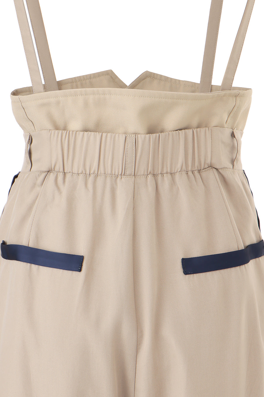 配色サテンのサイドパイピングや、後ろポケットもデザインポイント。ウエストは後ろゴム仕様でストレスフリーで着用可能。レイヤードされたツイル素材のウエストコルセットは取り外し可能で、肩紐も取り外し可能なのでスタイリングに合わせたカスタムを楽しめます。肩紐の長さは3段階調節可能。裏地付き。ポケットあり。