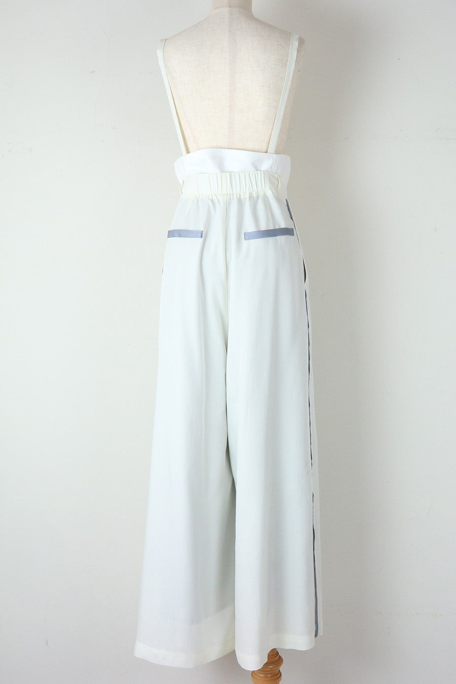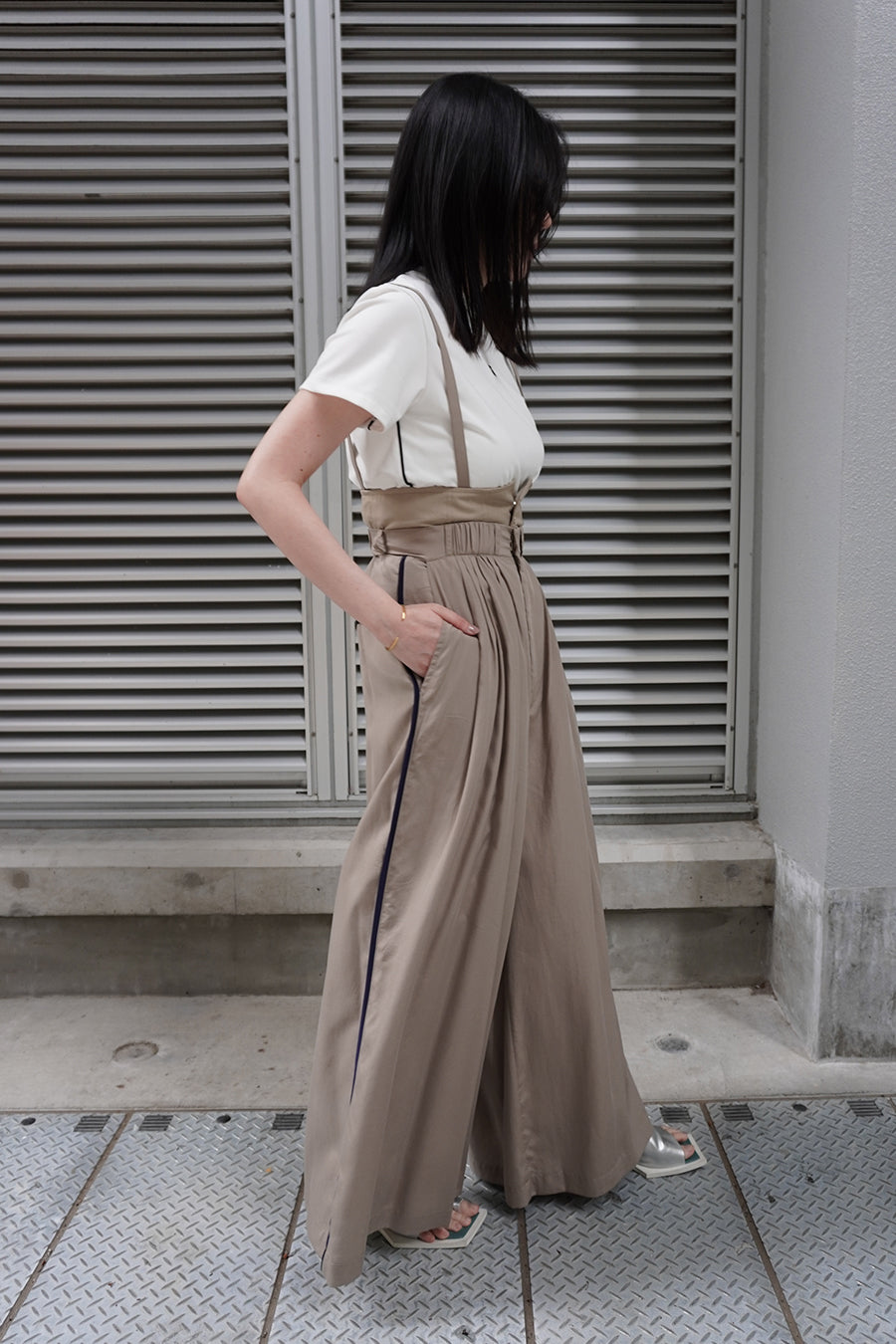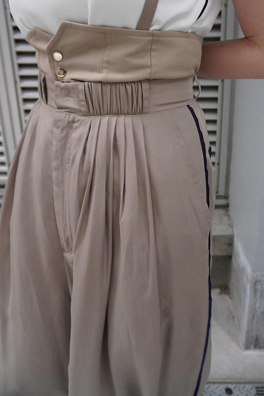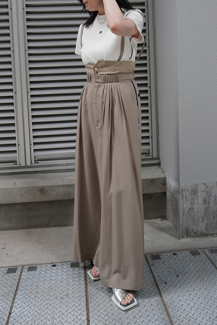 配色サテンのサイドパイピングや、後ろポケットもデザインポイント。ウエストは後ろゴム仕様でストレスフリーで着用可能。レイヤードされたツイル素材のウエストコルセットは取り外し可能で、肩紐も取り外し可能なのでスタイリングに合わせたカスタムを楽しめます。肩紐の長さは3段階調節可能。裏地付き。ポケットあり。