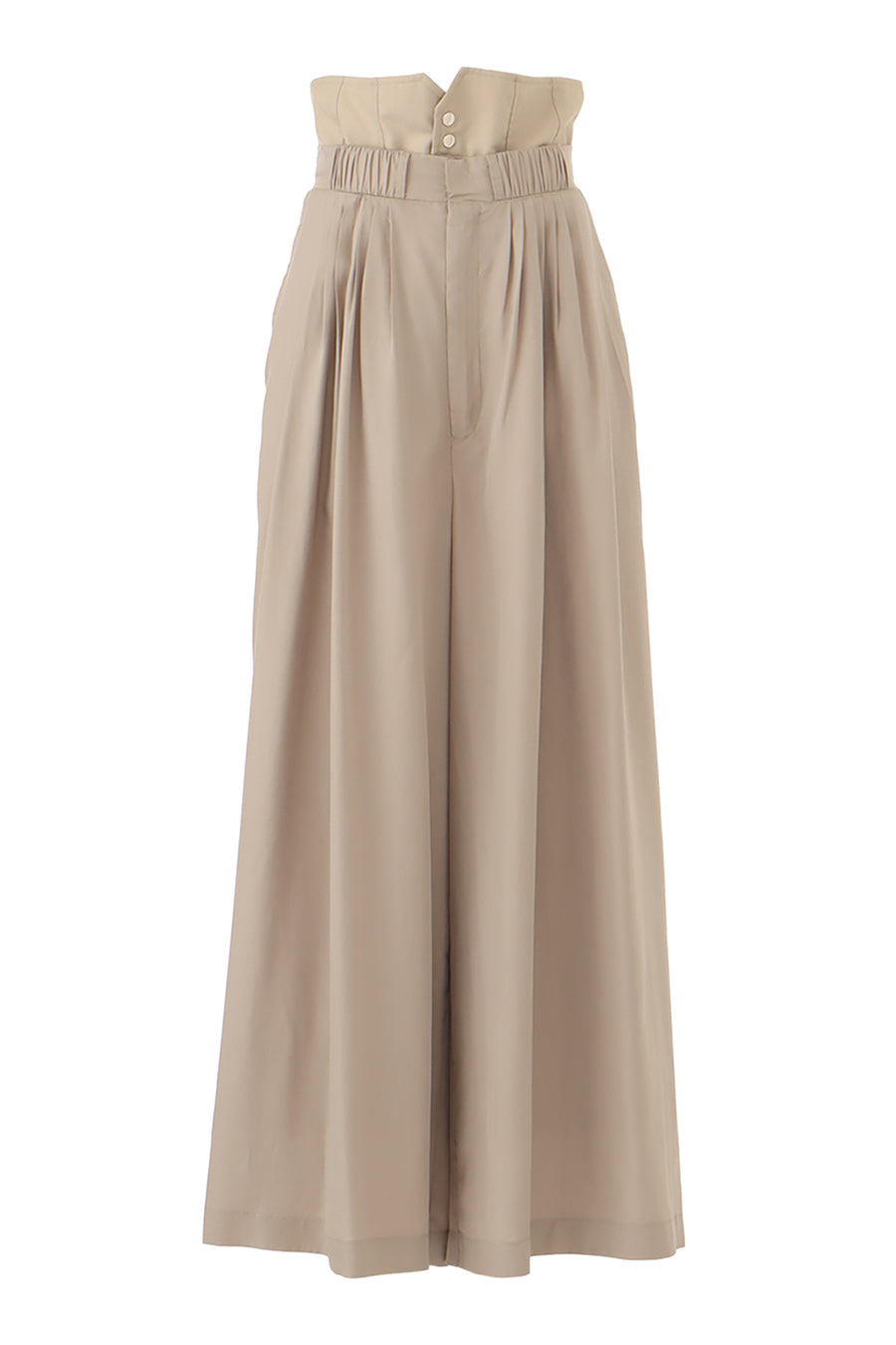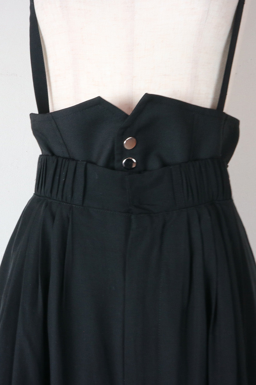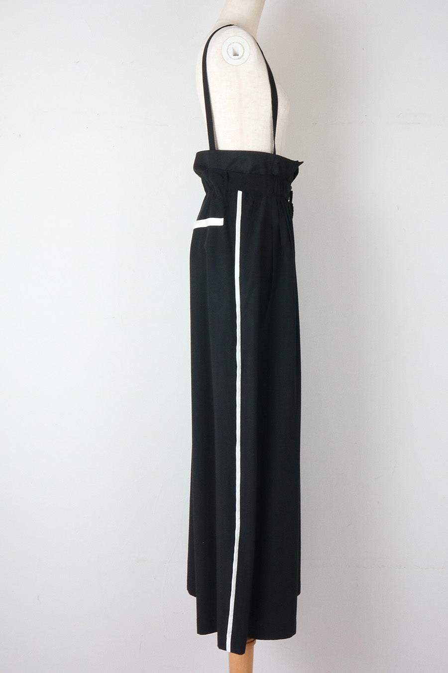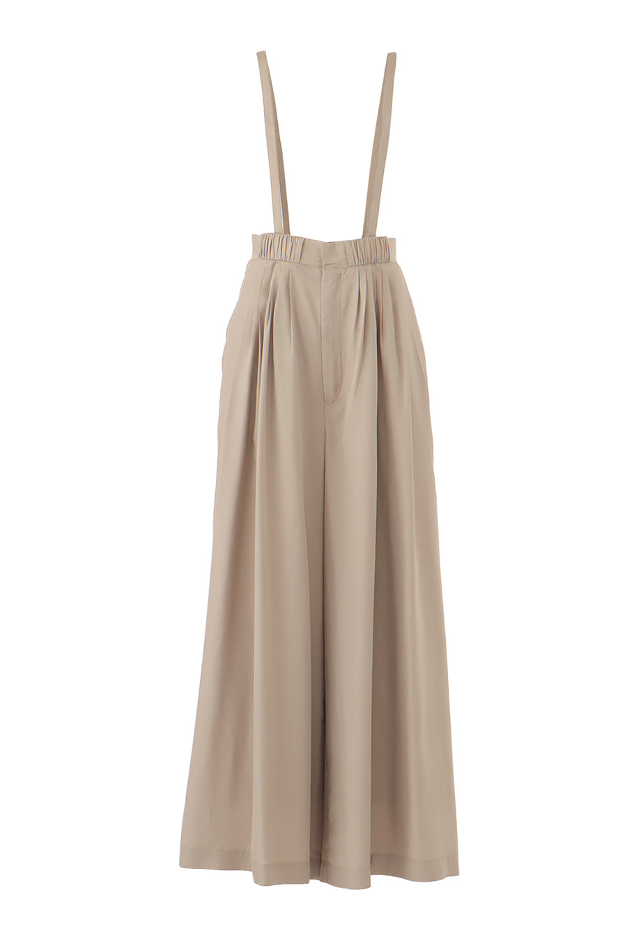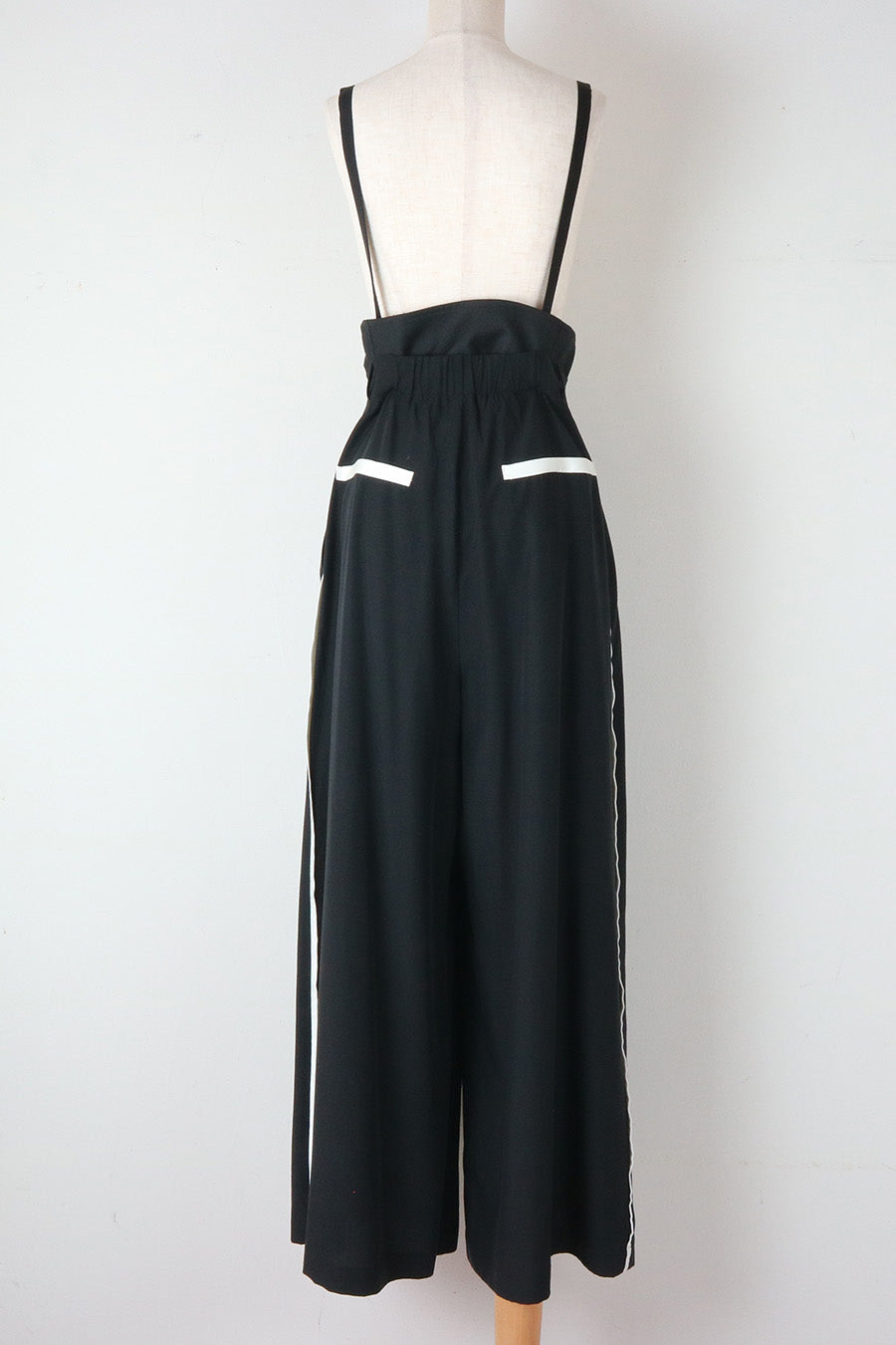 配色サテンのサイドパイピングや、後ろポケットもデザインポイント。ウエストは後ろゴム仕様でストレスフリーで着用可能。レイヤードされたツイル素材のウエストコルセットは取り外し可能で、肩紐も取り外し可能なのでスタイリングに合わせたカスタムを楽しめます。肩紐の長さは3段階調節可能。裏地付き。ポケットあり。