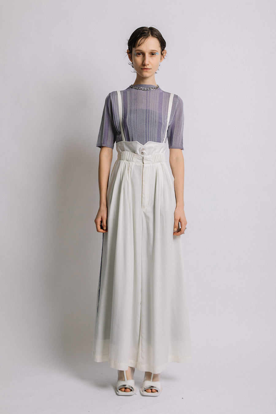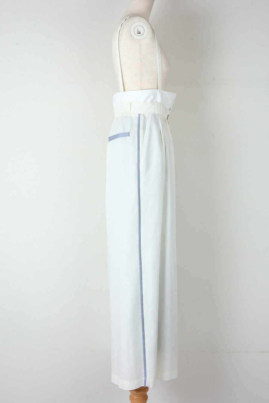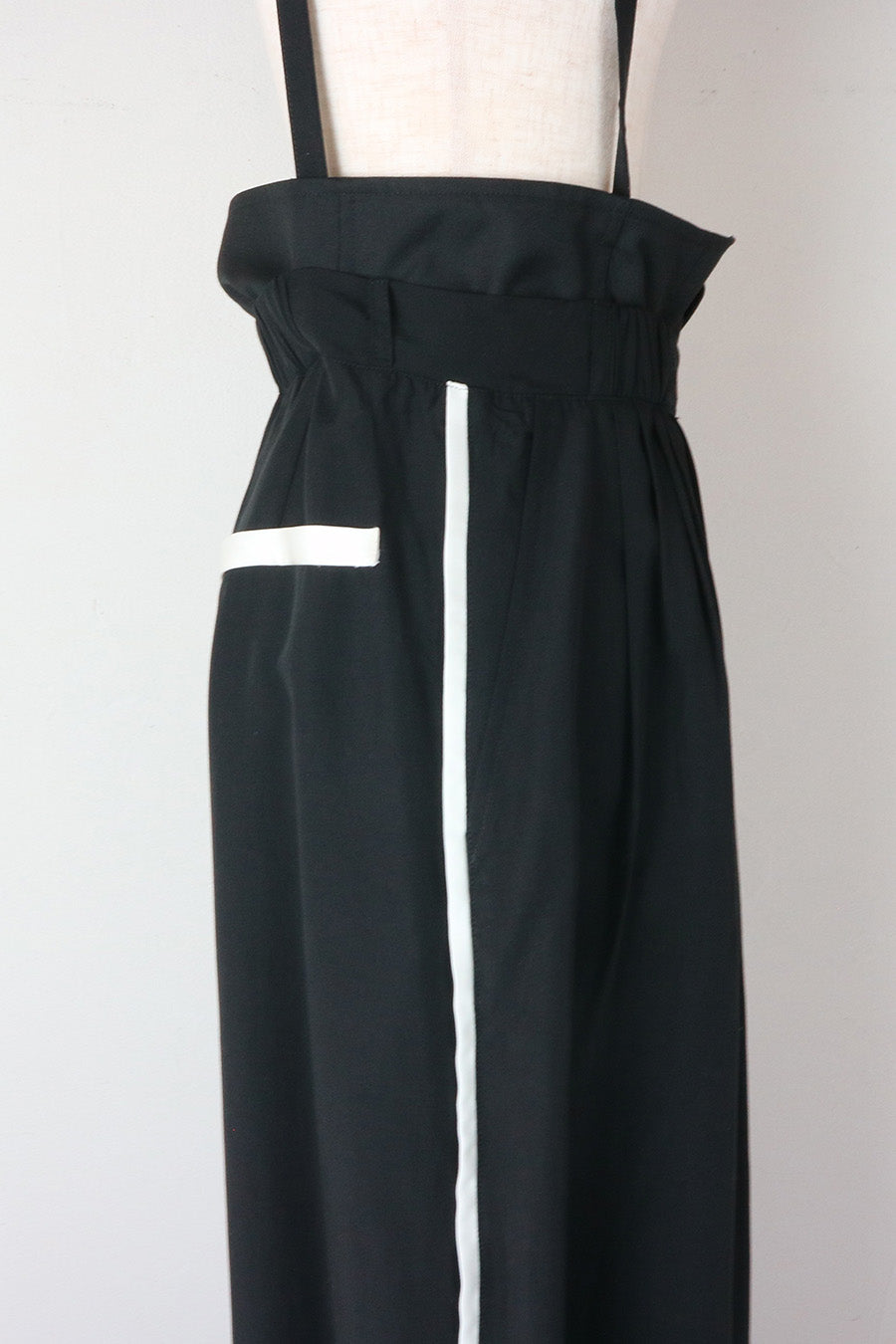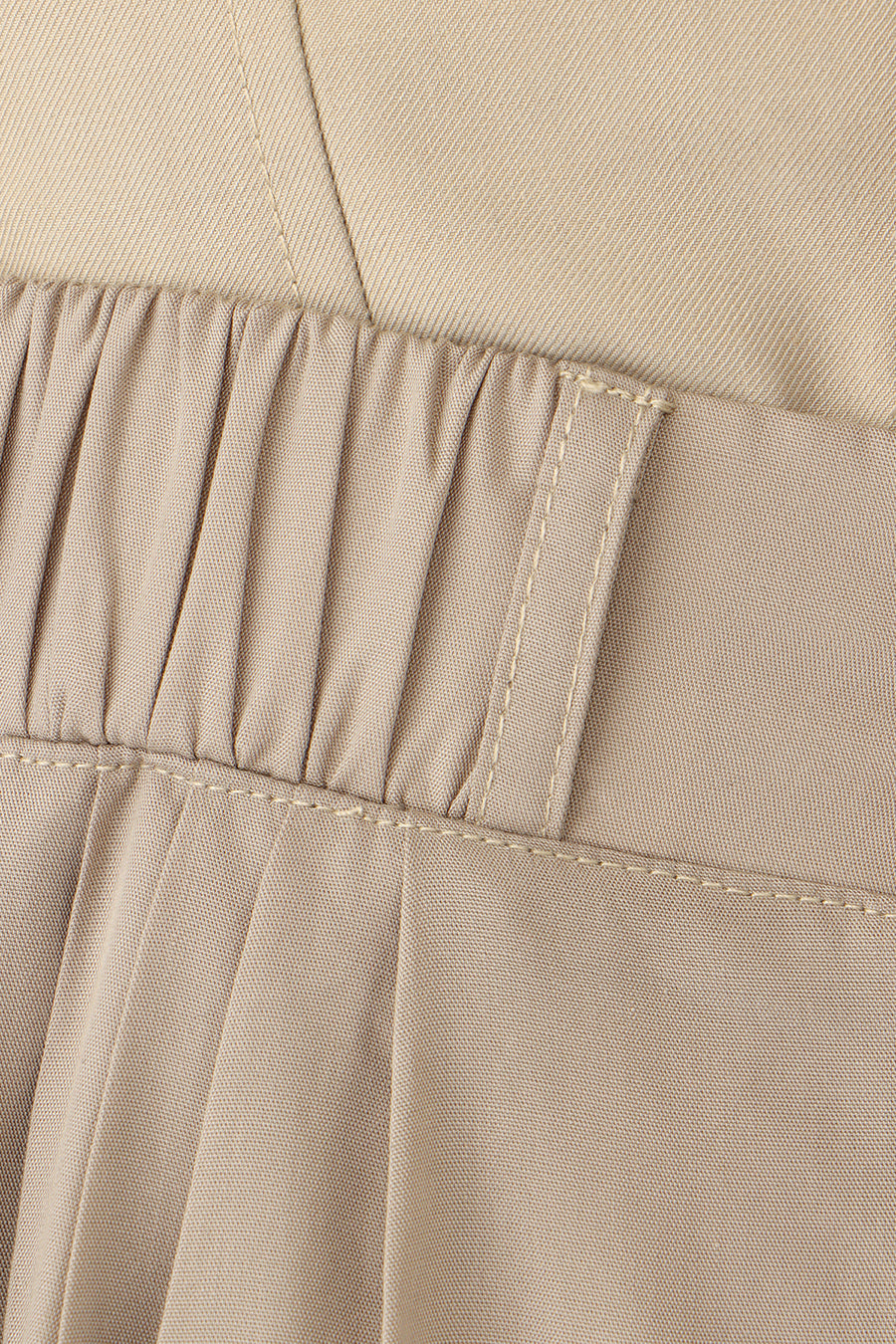 配色サテンのサイドパイピングや、後ろポケットもデザインポイント。ウエストは後ろゴム仕様でストレスフリーで着用可能。レイヤードされたツイル素材のウエストコルセットは取り外し可能で、肩紐も取り外し可能なのでスタイリングに合わせたカスタムを楽しめます。肩紐の長さは3段階調節可能。裏地付き。ポケットあり。