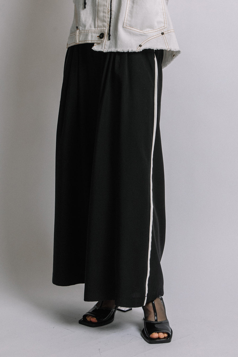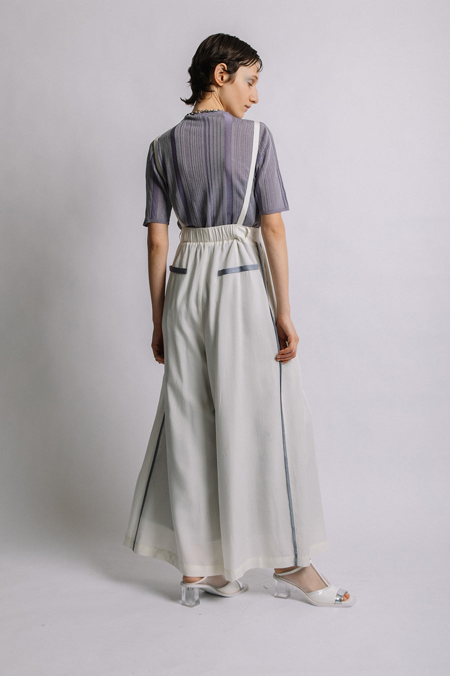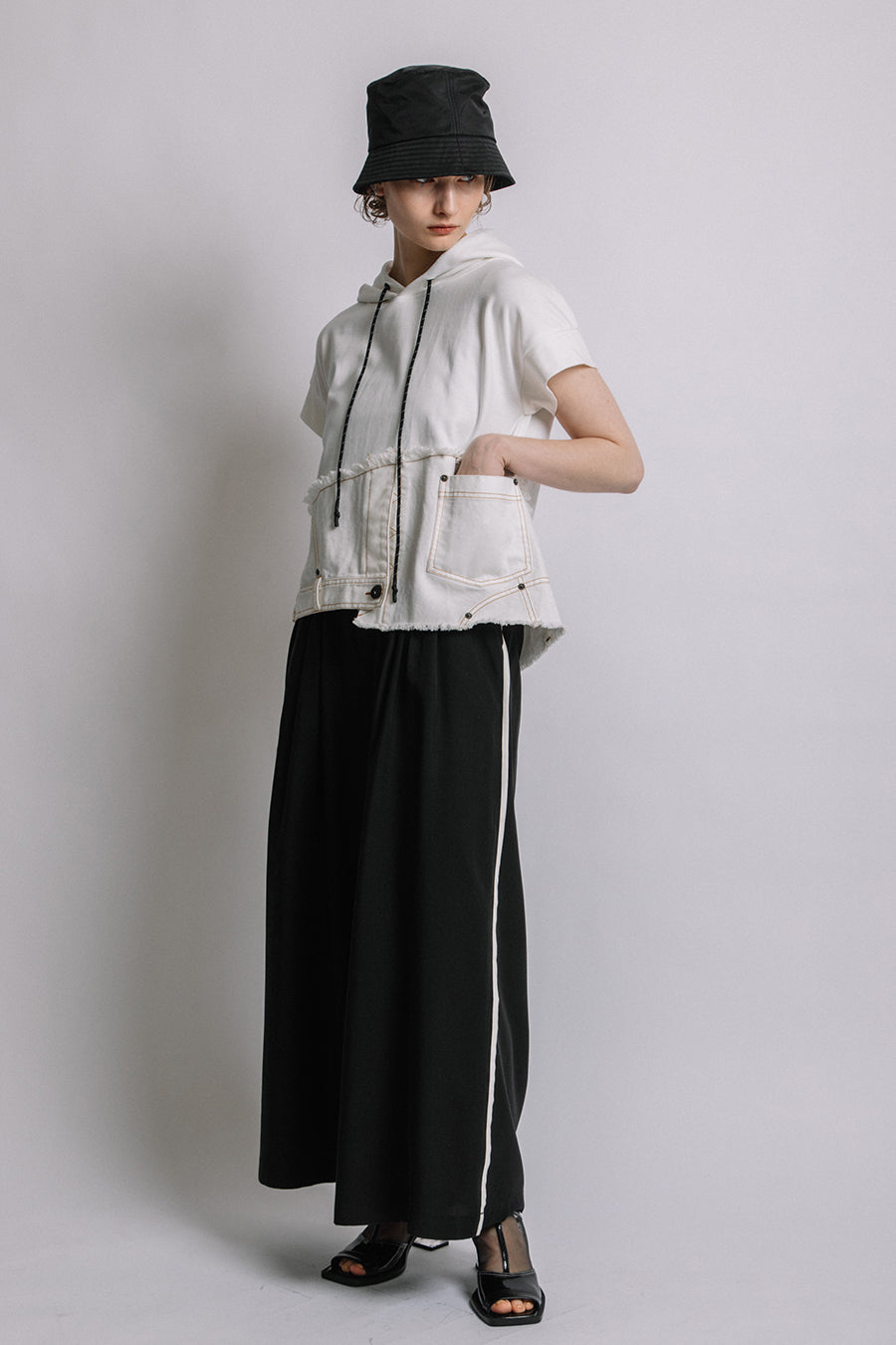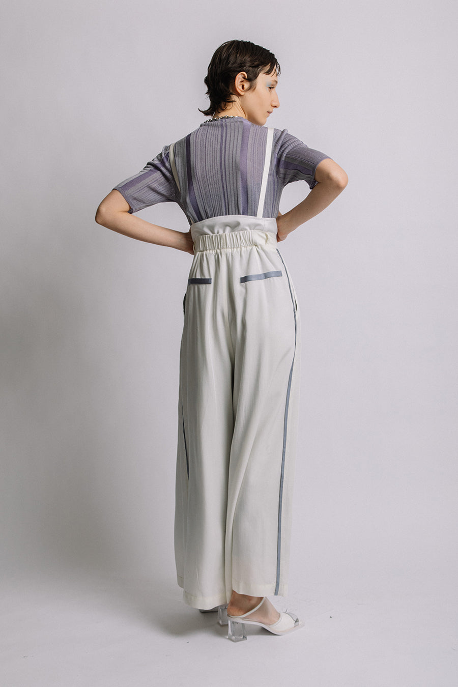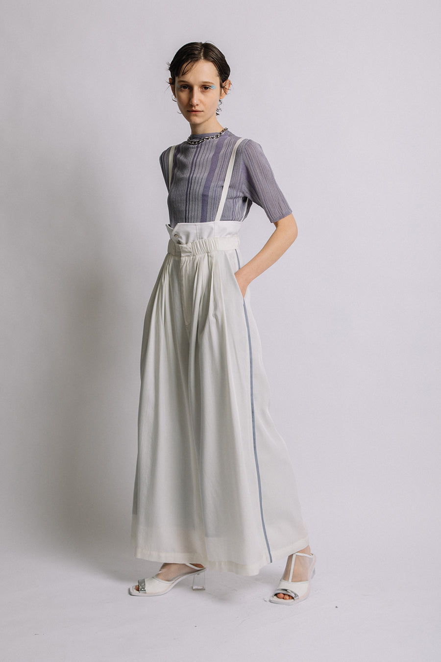 配色サテンのサイドパイピングや、後ろポケットもデザインポイント。ウエストは後ろゴム仕様でストレスフリーで着用可能。レイヤードされたツイル素材のウエストコルセットは取り外し可能で、肩紐も取り外し可能なのでスタイリングに合わせたカスタムを楽しめます。肩紐の長さは3段階調節可能。裏地付き。ポケットあり。