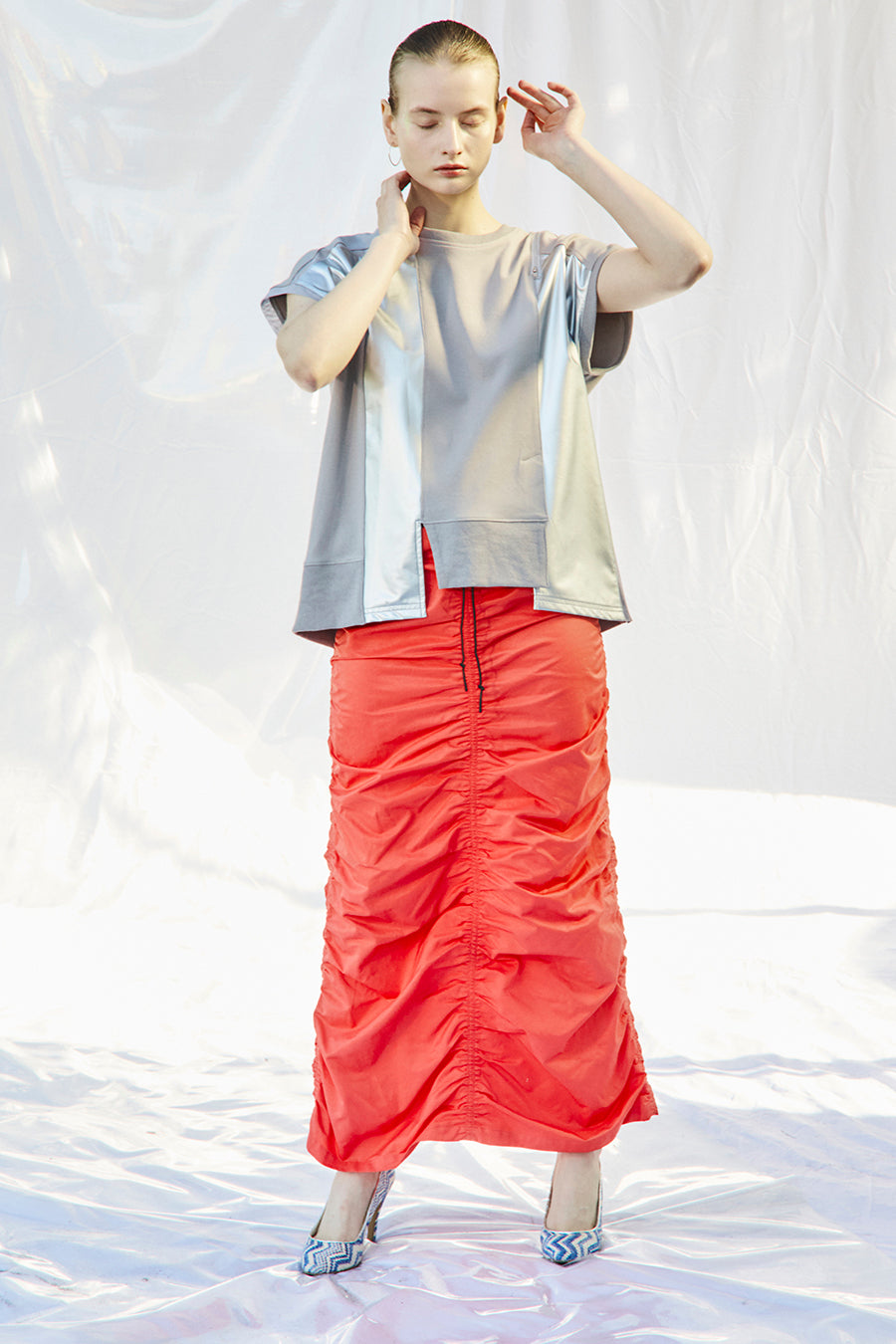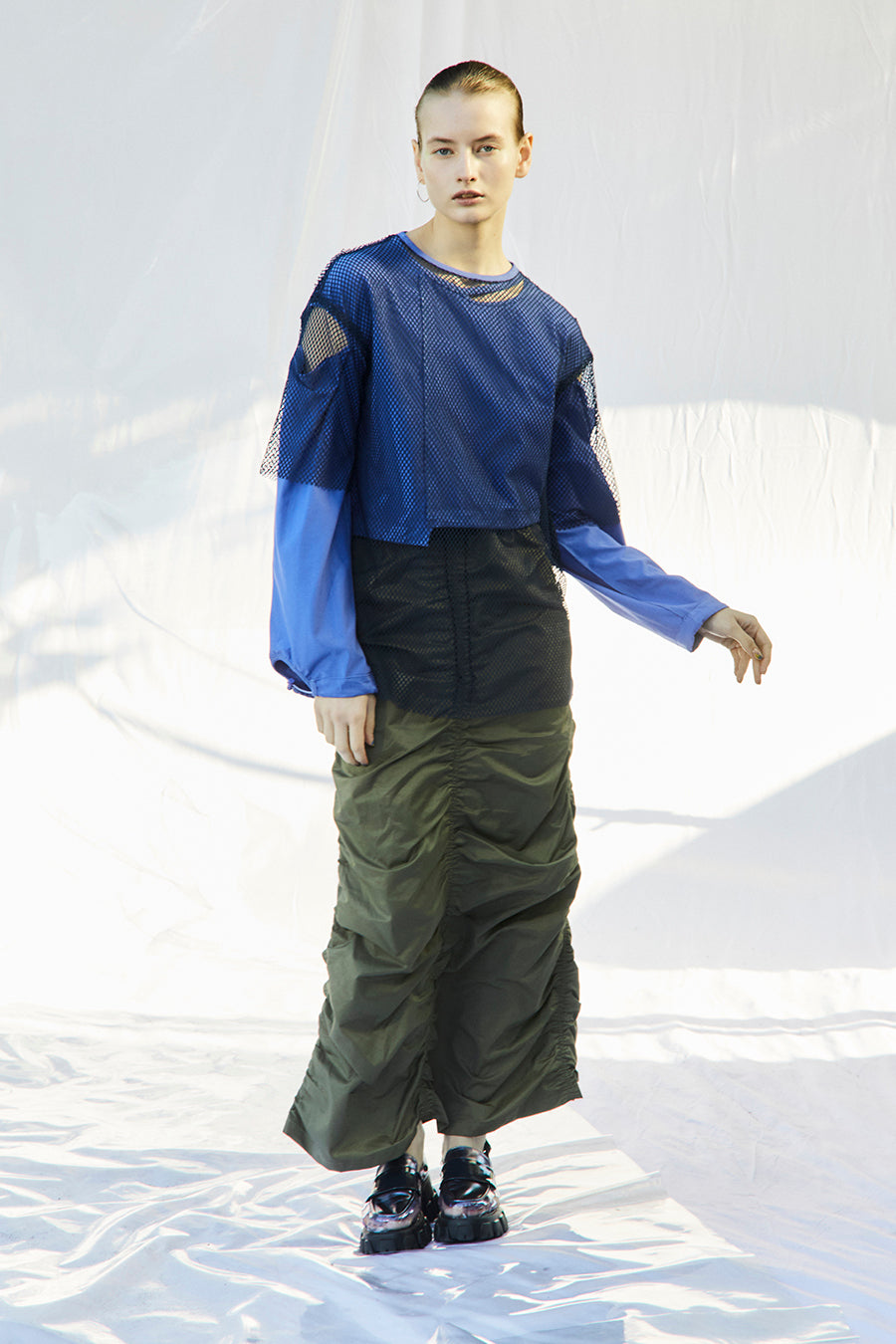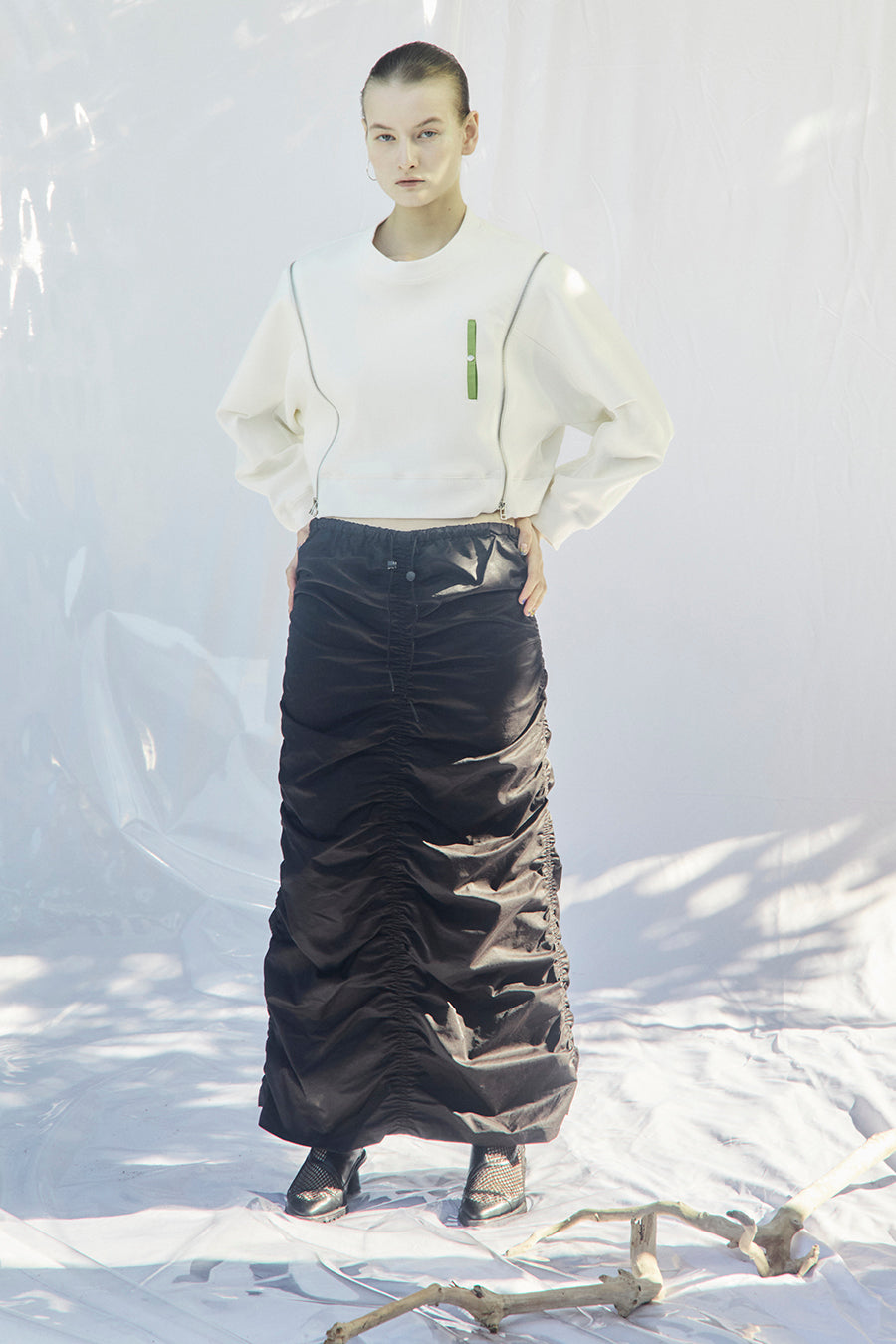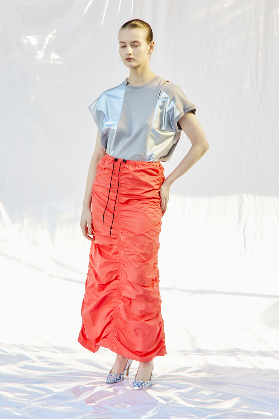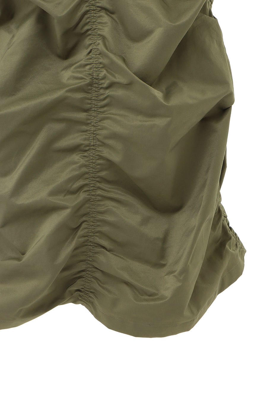 微光沢、張り感のあるナイロンコットンツイルを敢えて使用し、前後中心と両脇に大胆なシャーリングを寄せたデザインは、シルエットが縦長でありながらもボリュームのあるトレンド感いっぱいのアイテム。