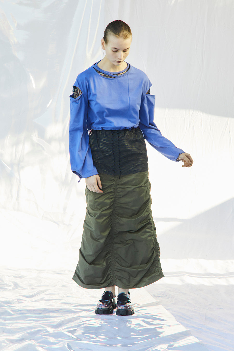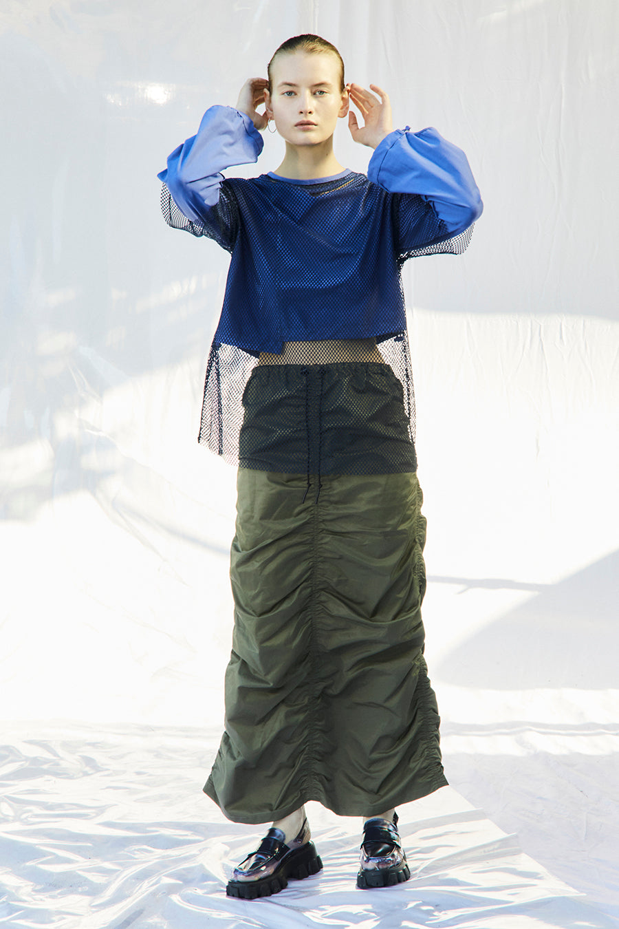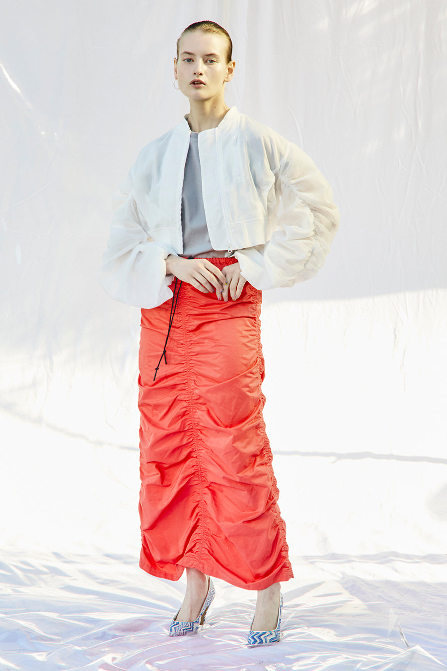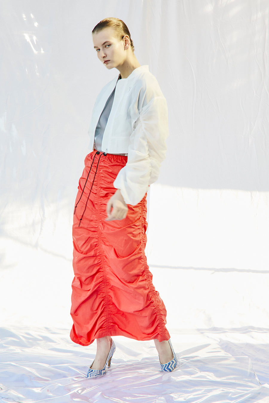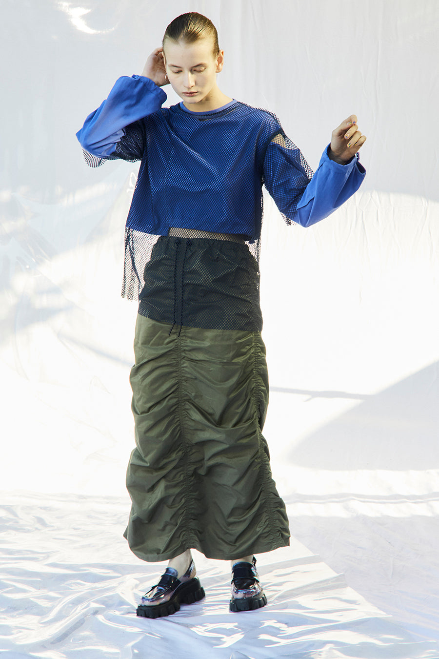 微光沢、張り感のあるナイロンコットンツイルを敢えて使用し、前後中心と両脇に大胆なシャーリングを寄せたデザインは、シルエットが縦長でありながらもボリュームのあるトレンド感いっぱいのアイテム。