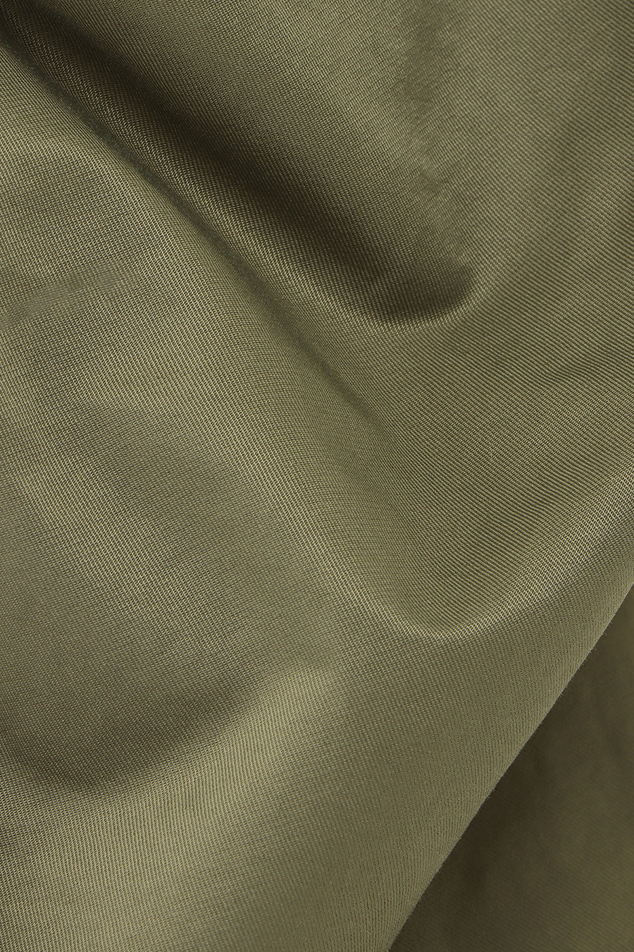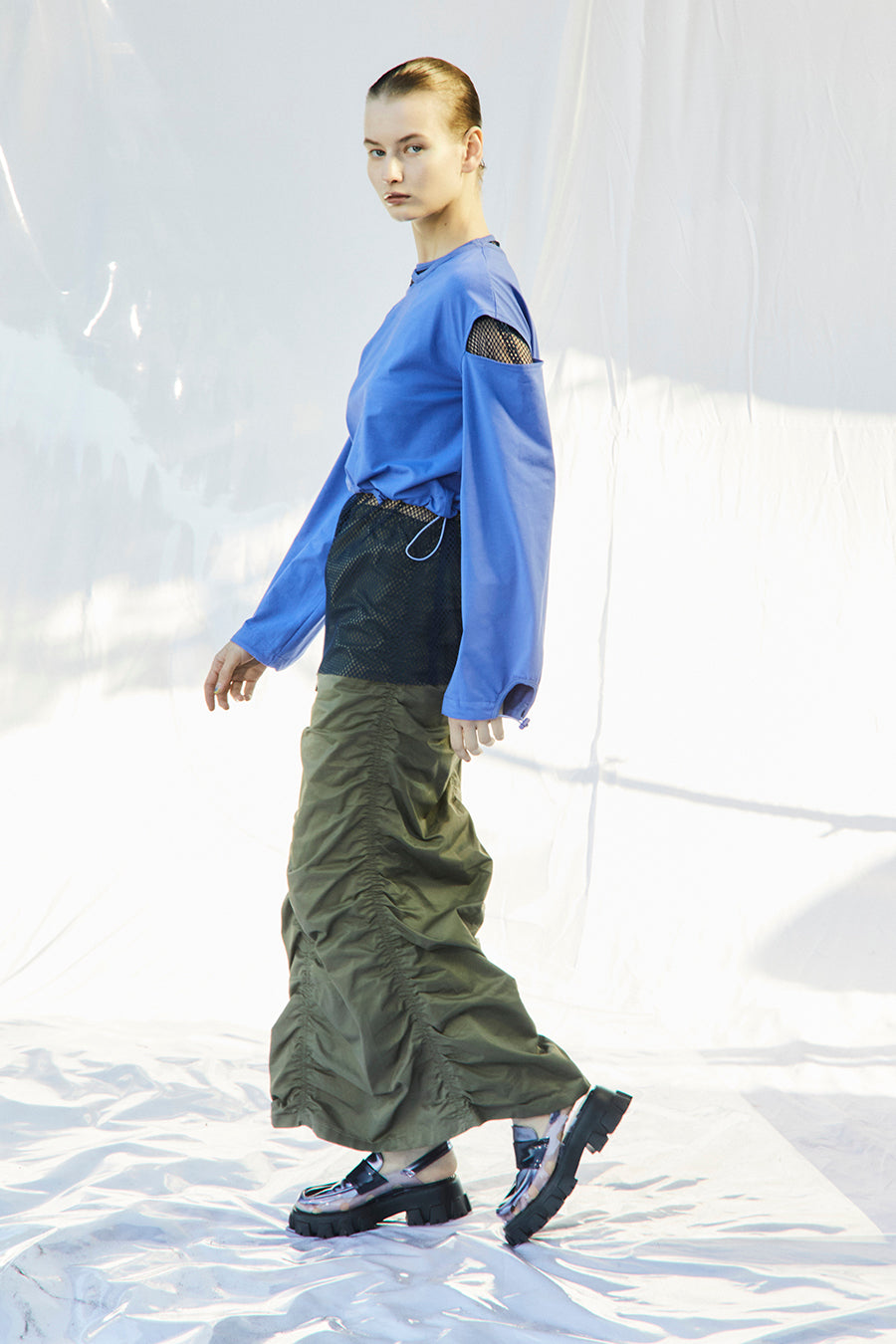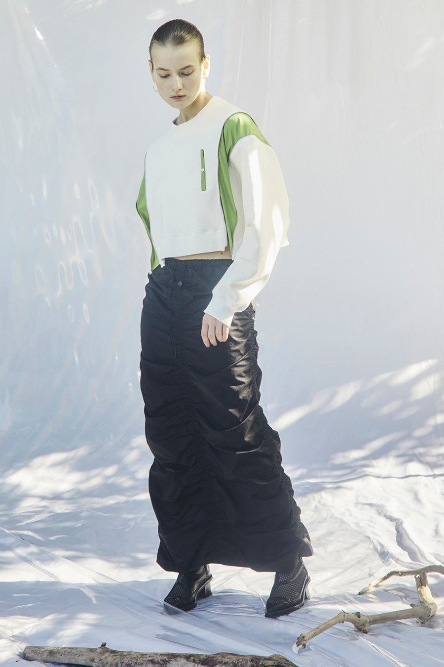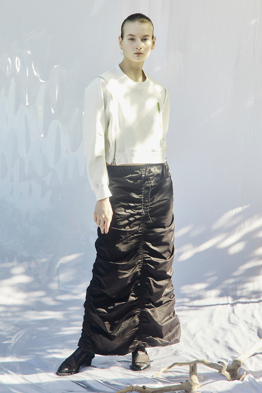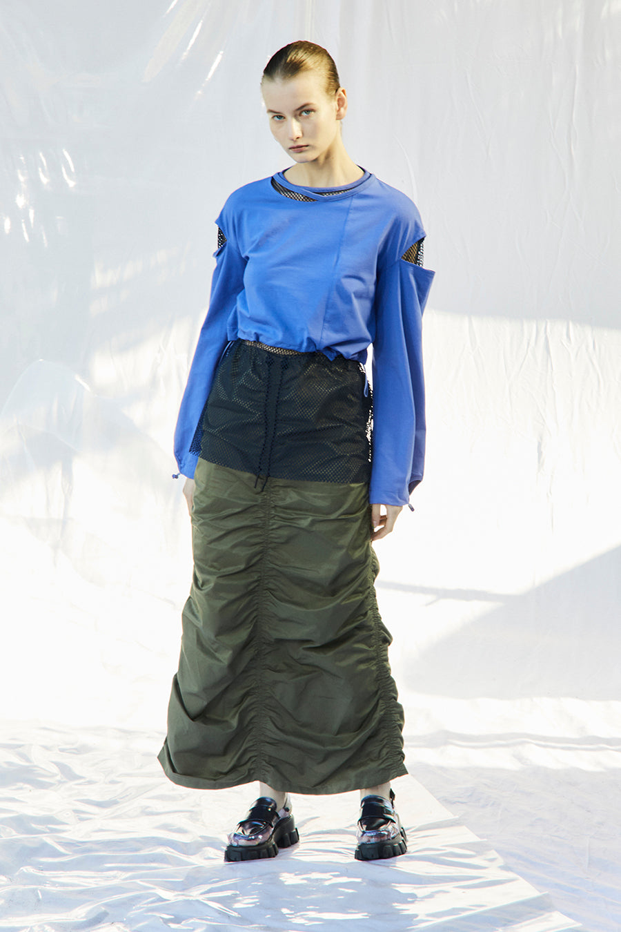 微光沢、張り感のあるナイロンコットンツイルを敢えて使用し、前後中心と両脇に大胆なシャーリングを寄せたデザインは、シルエットが縦長でありながらもボリュームのあるトレンド感いっぱいのアイテム。