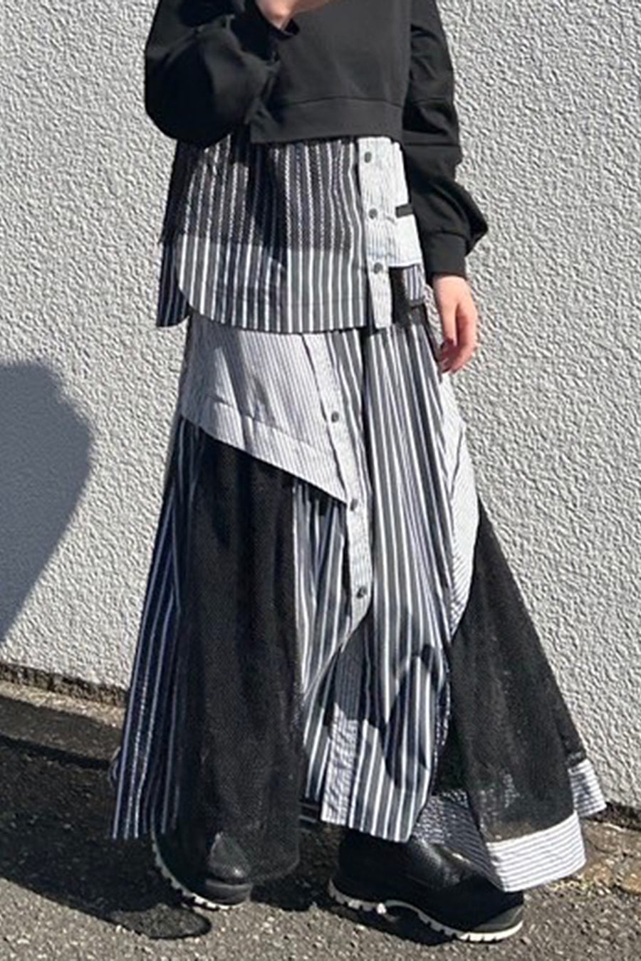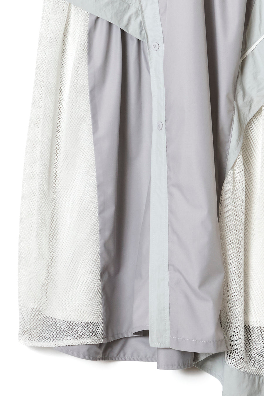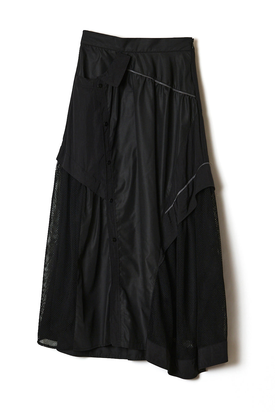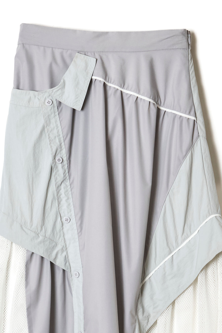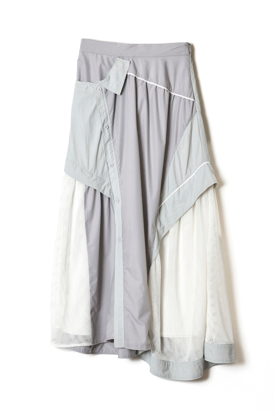 シャツのディティールを取り入れたデザインが立体的なフレアースカート。下パーツにはメッシュを切り替え、エッジをプラス。アウラアイラらしい異素材コンビで他には無いアイテム。前ヨークや左切り替えのパイピングもさりげないデザインポイント。右前の襟デザインはポケットになっており、実用性も◎