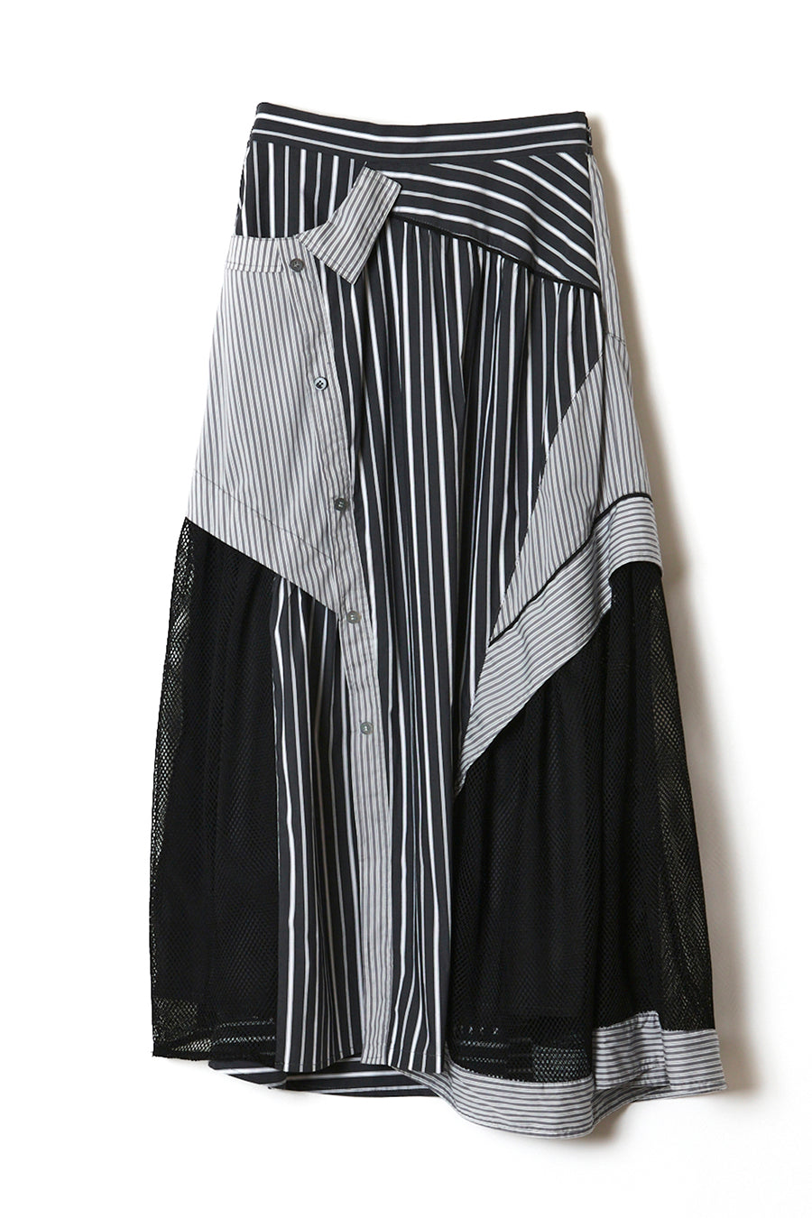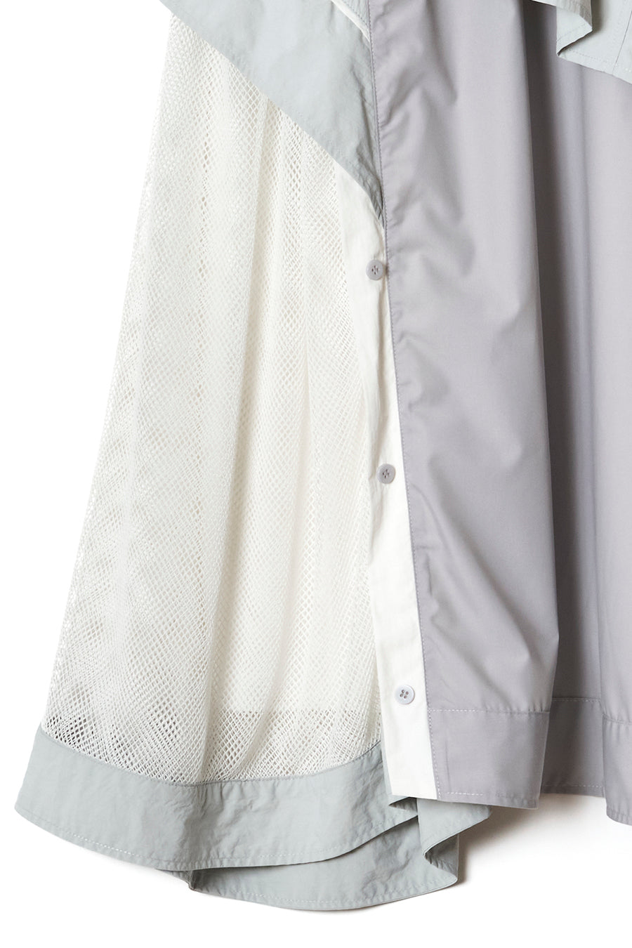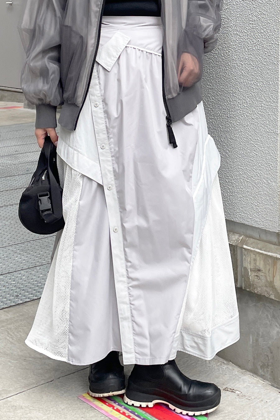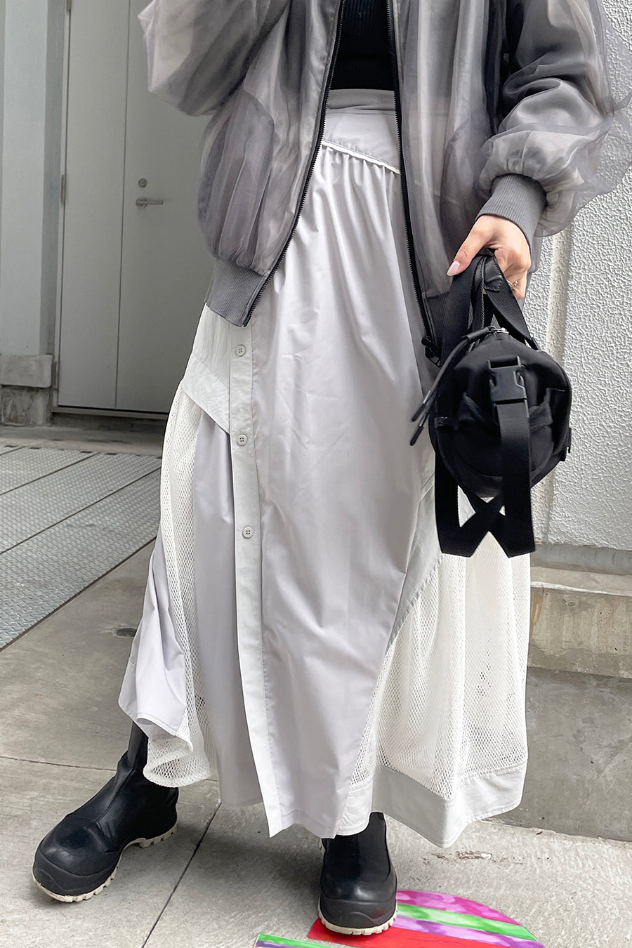 シャツのディティールを取り入れたデザインが立体的なフレアースカート。下パーツにはメッシュを切り替え、エッジをプラス。アウラアイラらしい異素材コンビで他には無いアイテム。前ヨークや左切り替えのパイピングもさりげないデザインポイント。右前の襟デザインはポケットになっており、実用性も◎