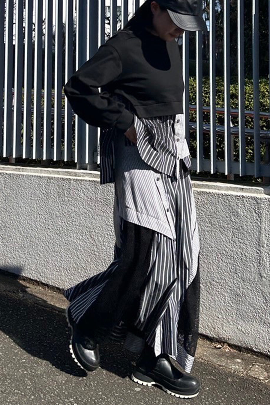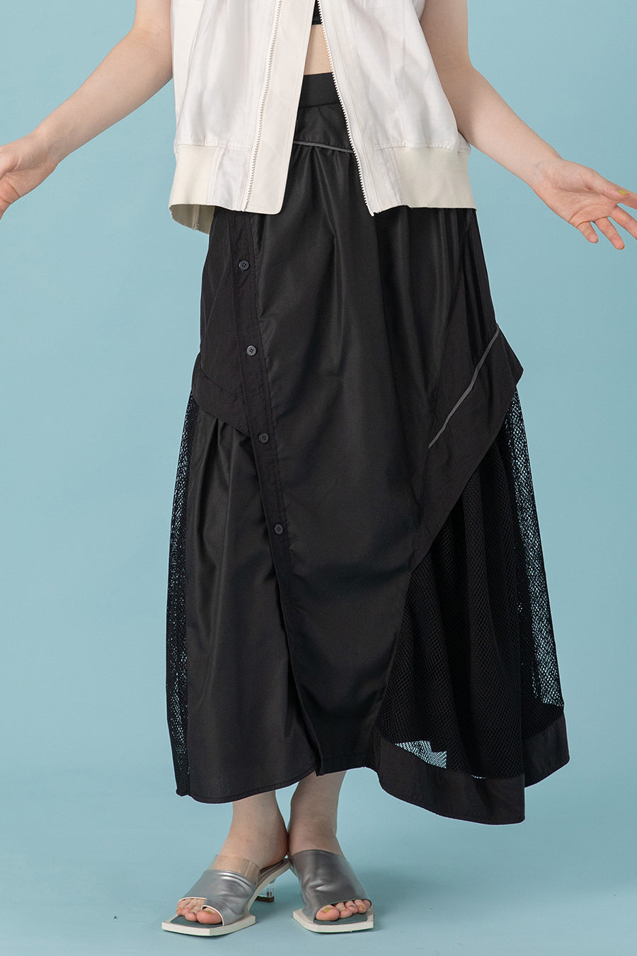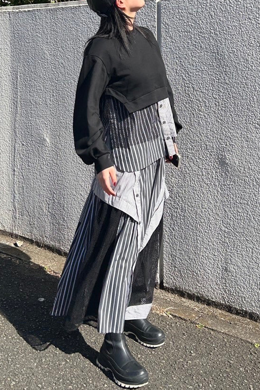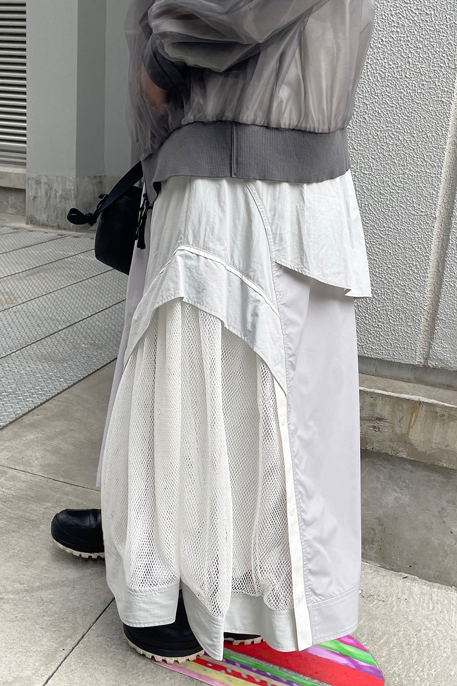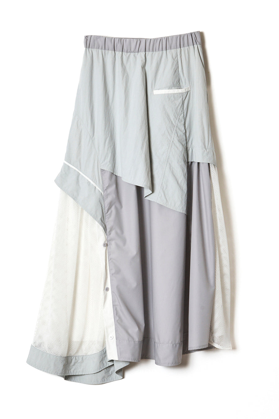 シャツのディティールを取り入れたデザインが立体的なフレアースカート。下パーツにはメッシュを切り替え、エッジをプラス。アウラアイラらしい異素材コンビで他には無いアイテム。前ヨークや左切り替えのパイピングもさりげないデザインポイント。右前の襟デザインはポケットになっており、実用性も◎