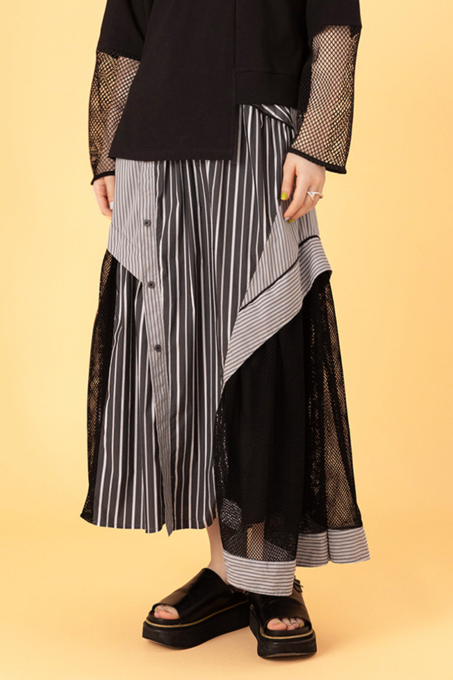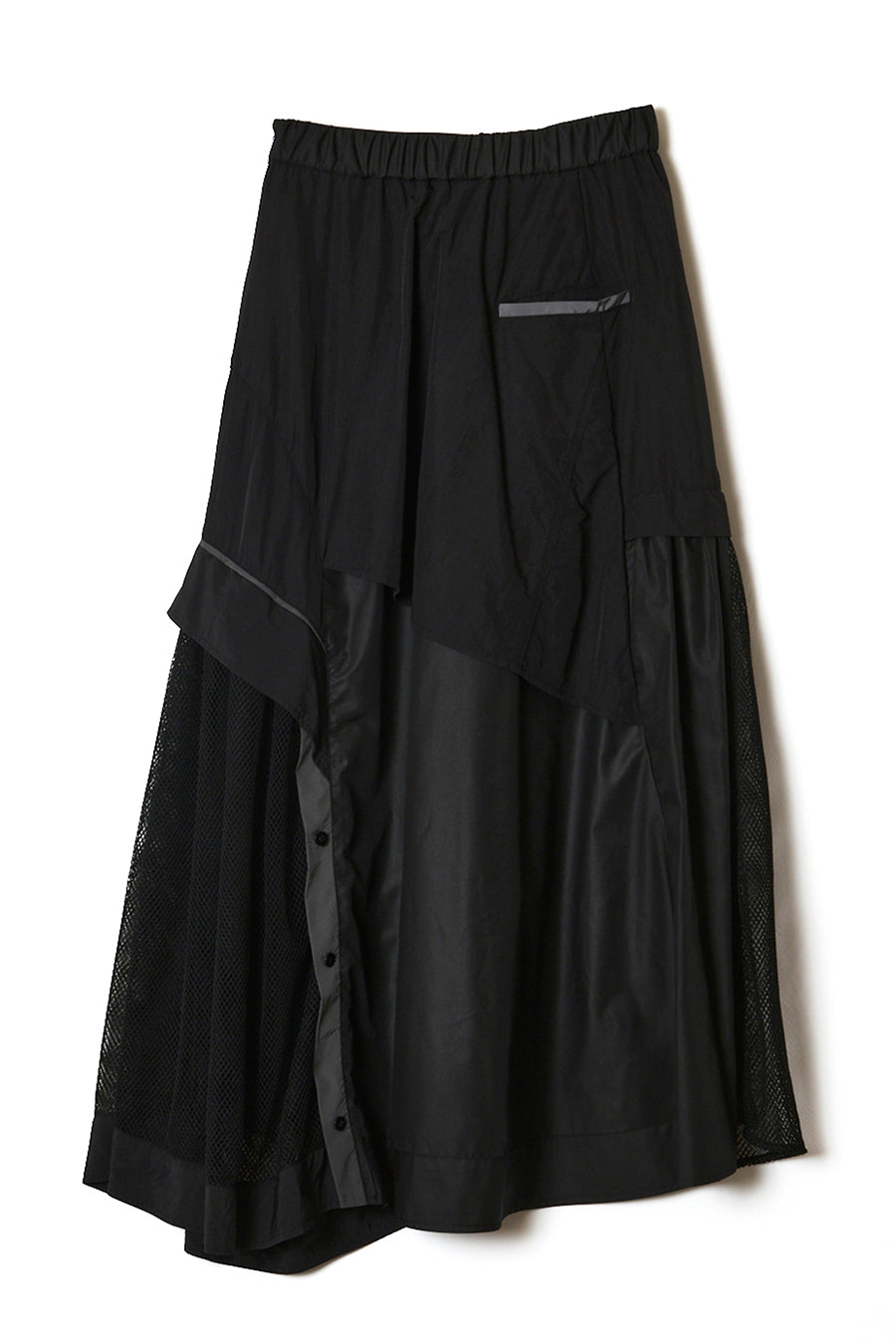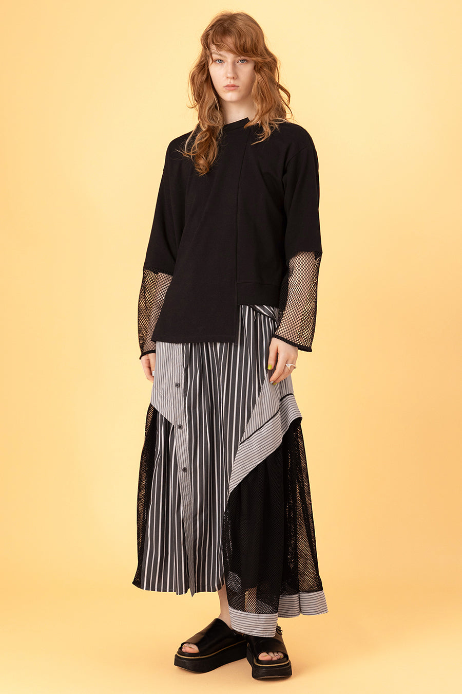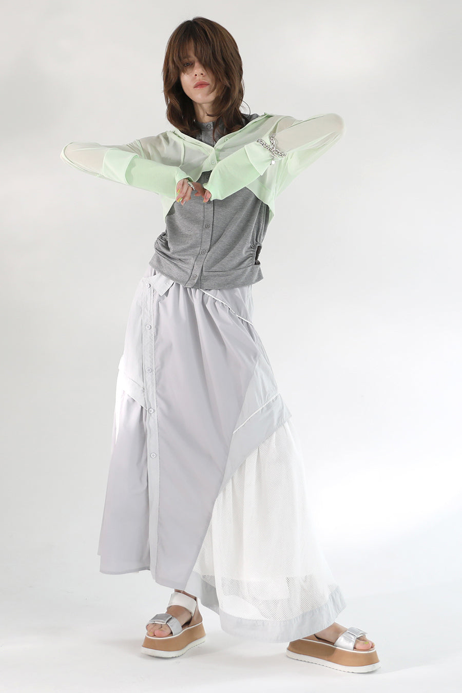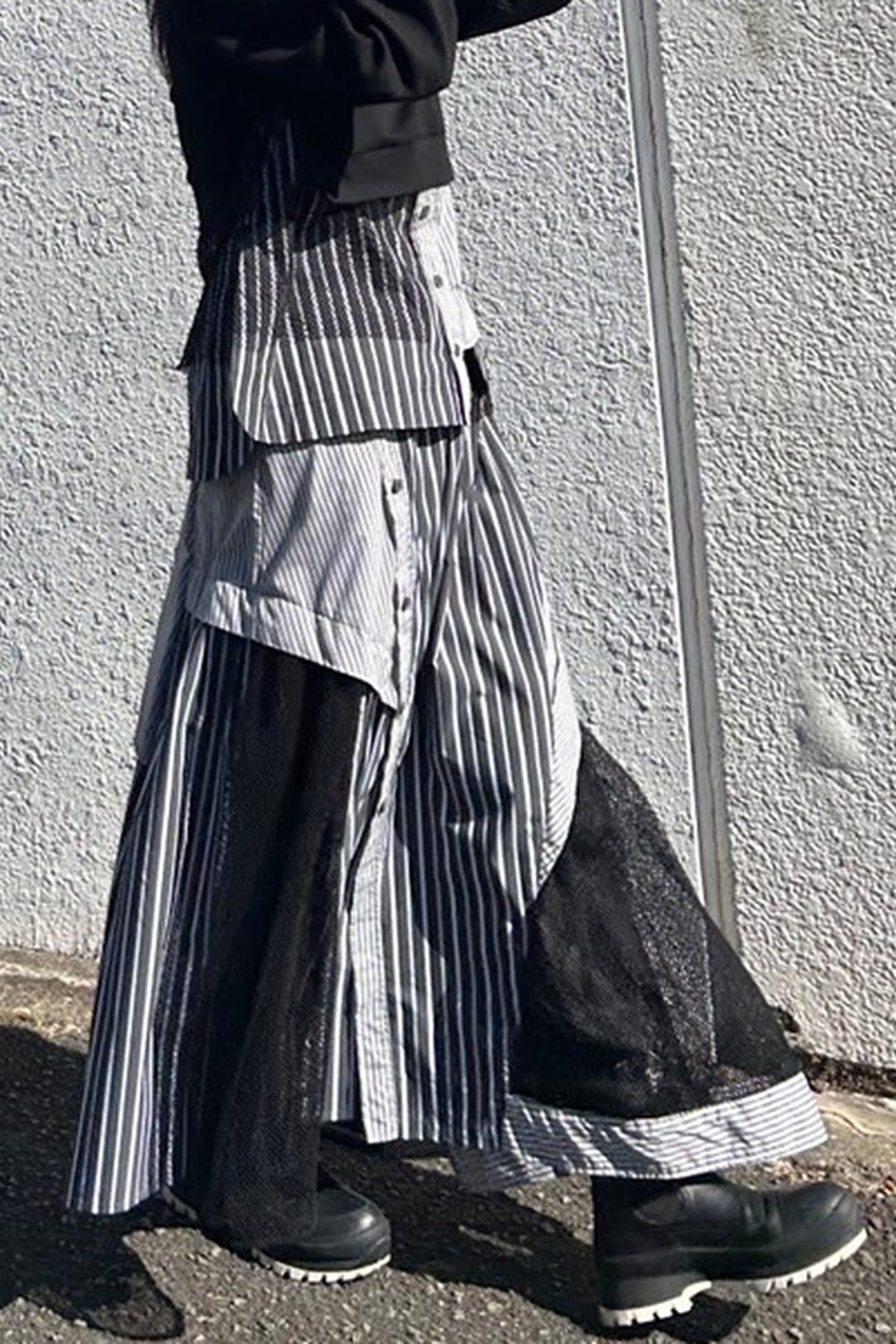 シャツのディティールを取り入れたデザインが立体的なフレアースカート。下パーツにはメッシュを切り替え、エッジをプラス。アウラアイラらしい異素材コンビで他には無いアイテム。前ヨークや左切り替えのパイピングもさりげないデザインポイント。右前の襟デザインはポケットになっており、実用性も◎