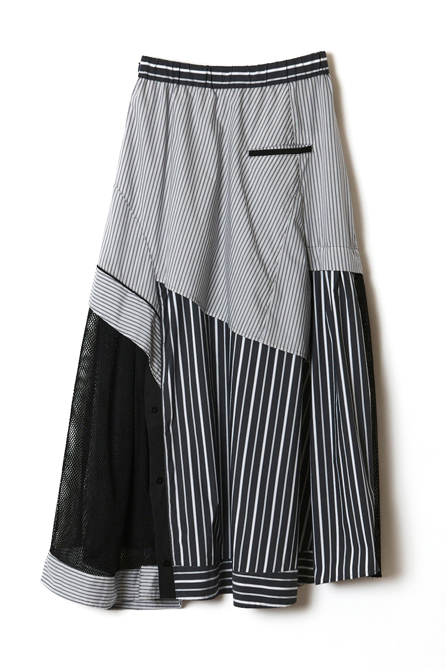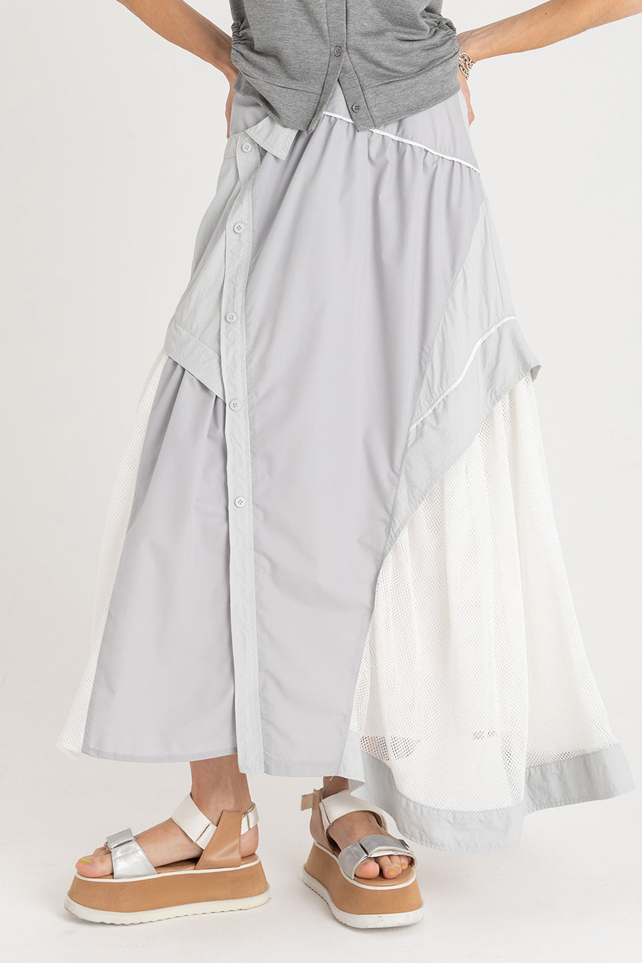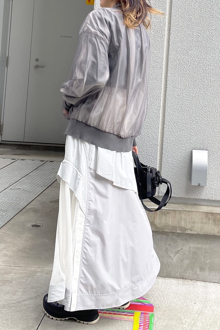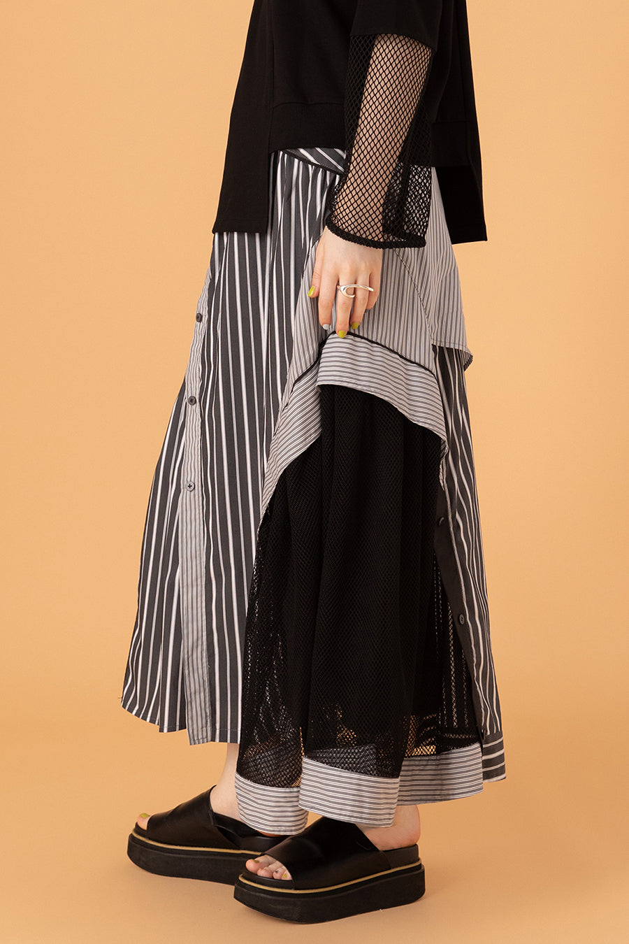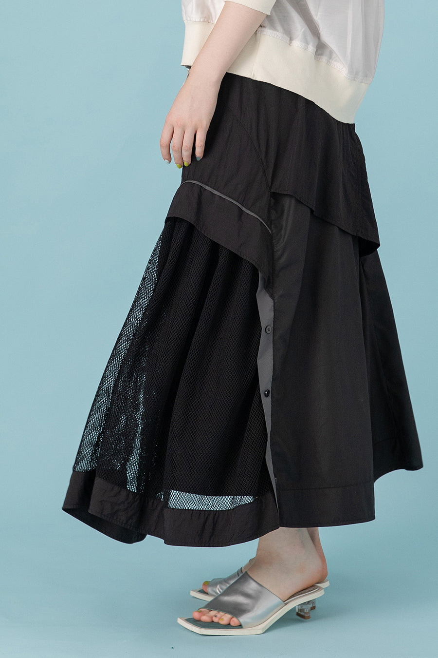 シャツのディティールを取り入れたデザインが立体的なフレアースカート。下パーツにはメッシュを切り替え、エッジをプラス。アウラアイラらしい異素材コンビで他には無いアイテム。前ヨークや左切り替えのパイピングもさりげないデザインポイント。右前の襟デザインはポケットになっており、実用性も◎