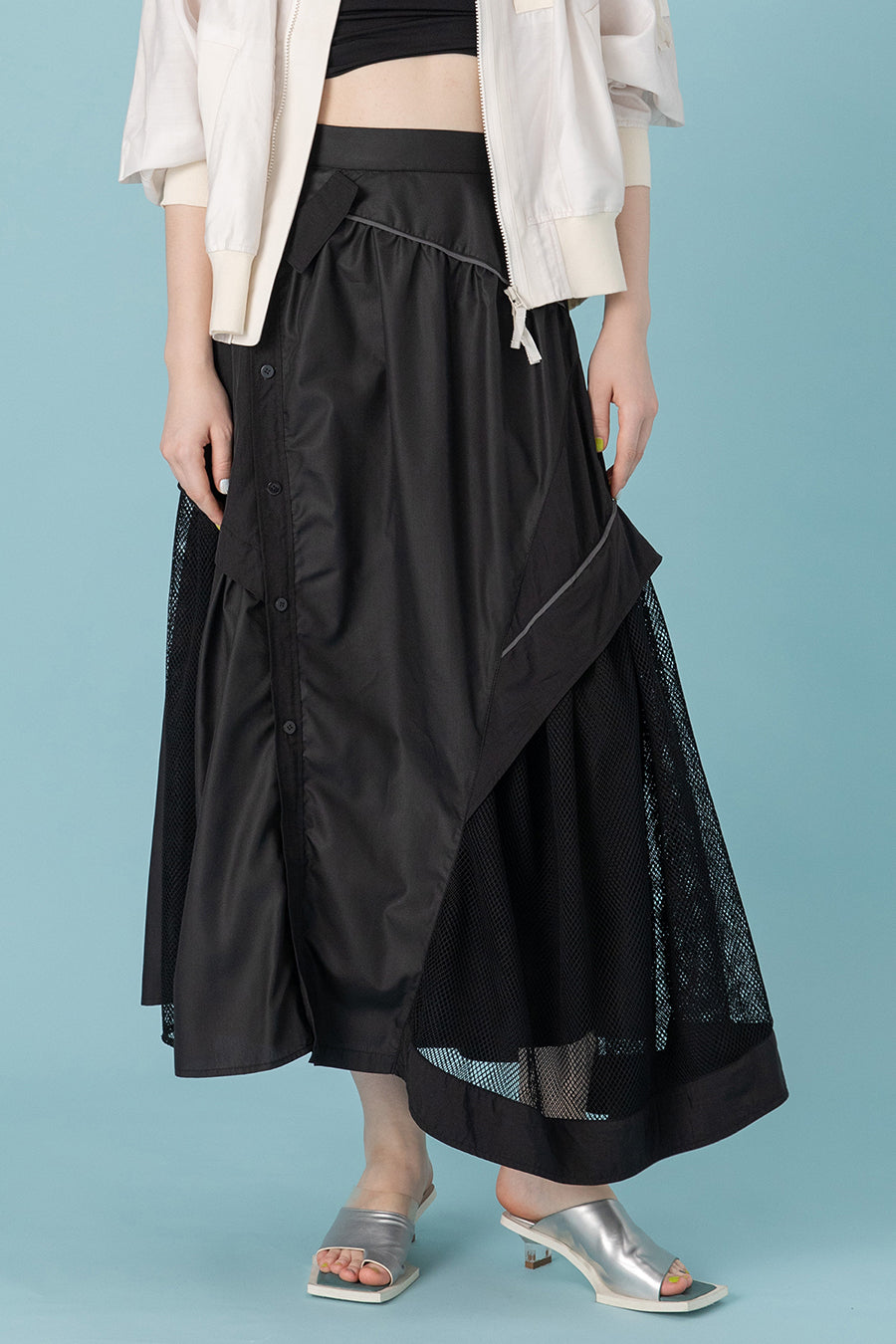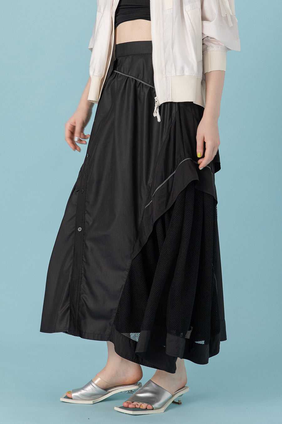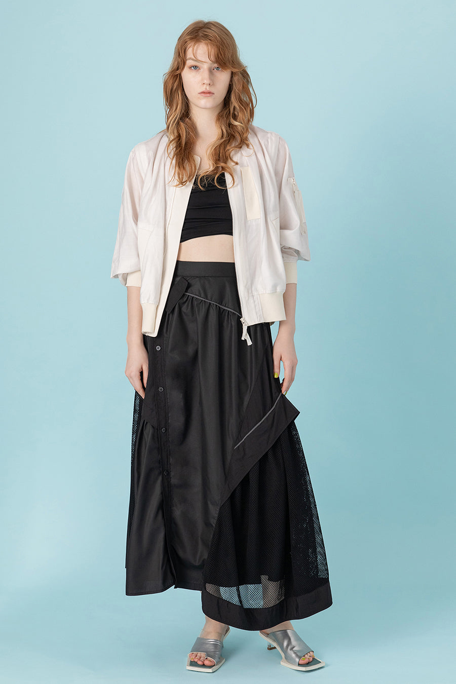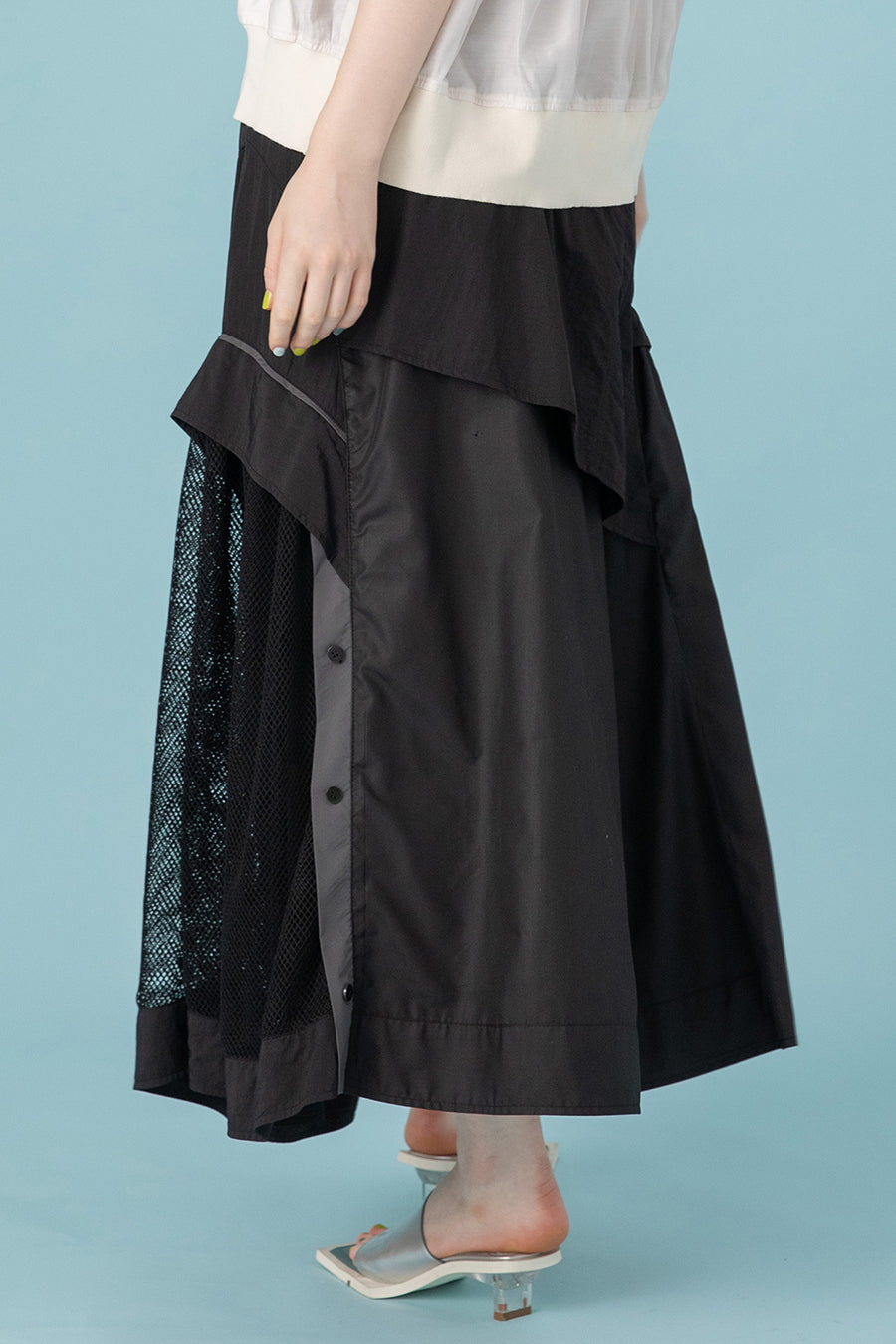 シャツのディティールを取り入れたデザインが立体的なフレアースカート。下パーツにはメッシュを切り替え、エッジをプラス。アウラアイラらしい異素材コンビで他には無いアイテム。前ヨークや左切り替えのパイピングもさりげないデザインポイント。右前の襟デザインはポケットになっており、実用性も◎