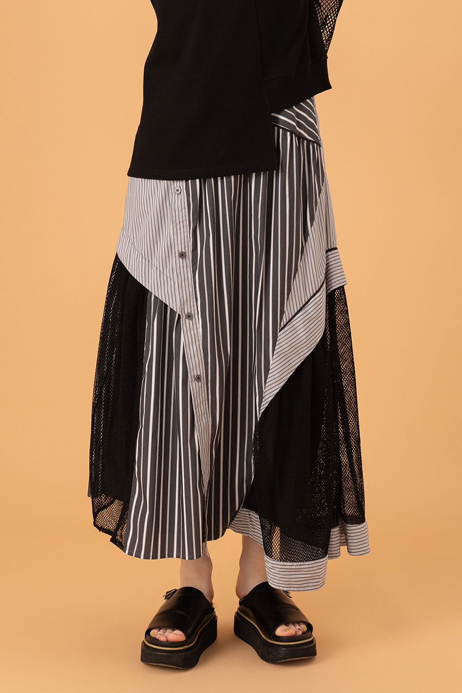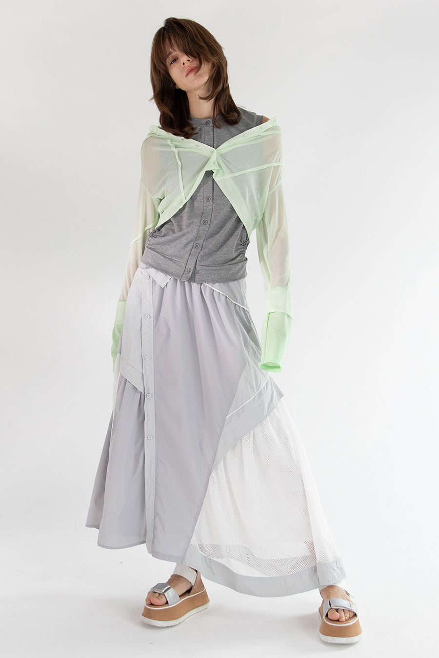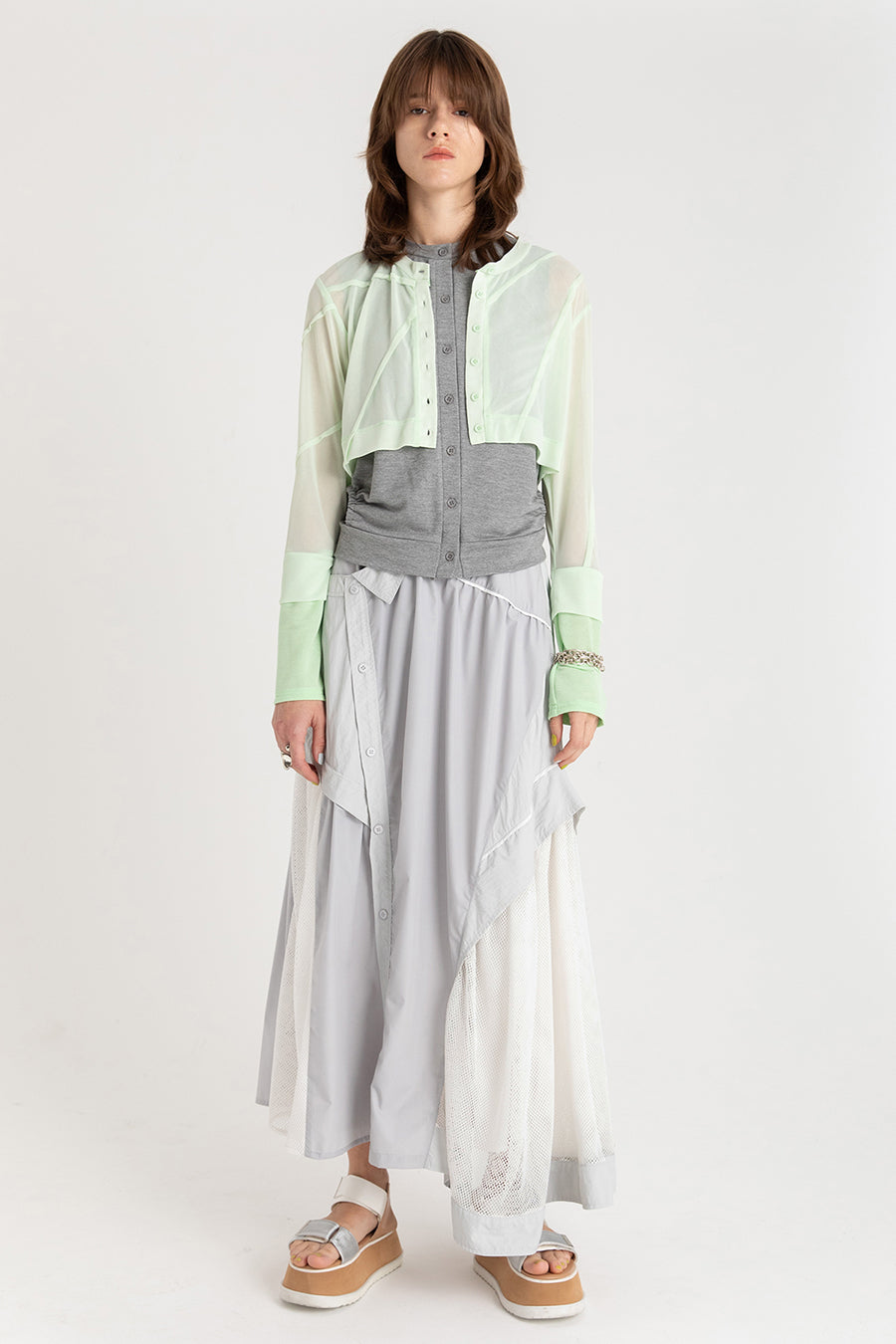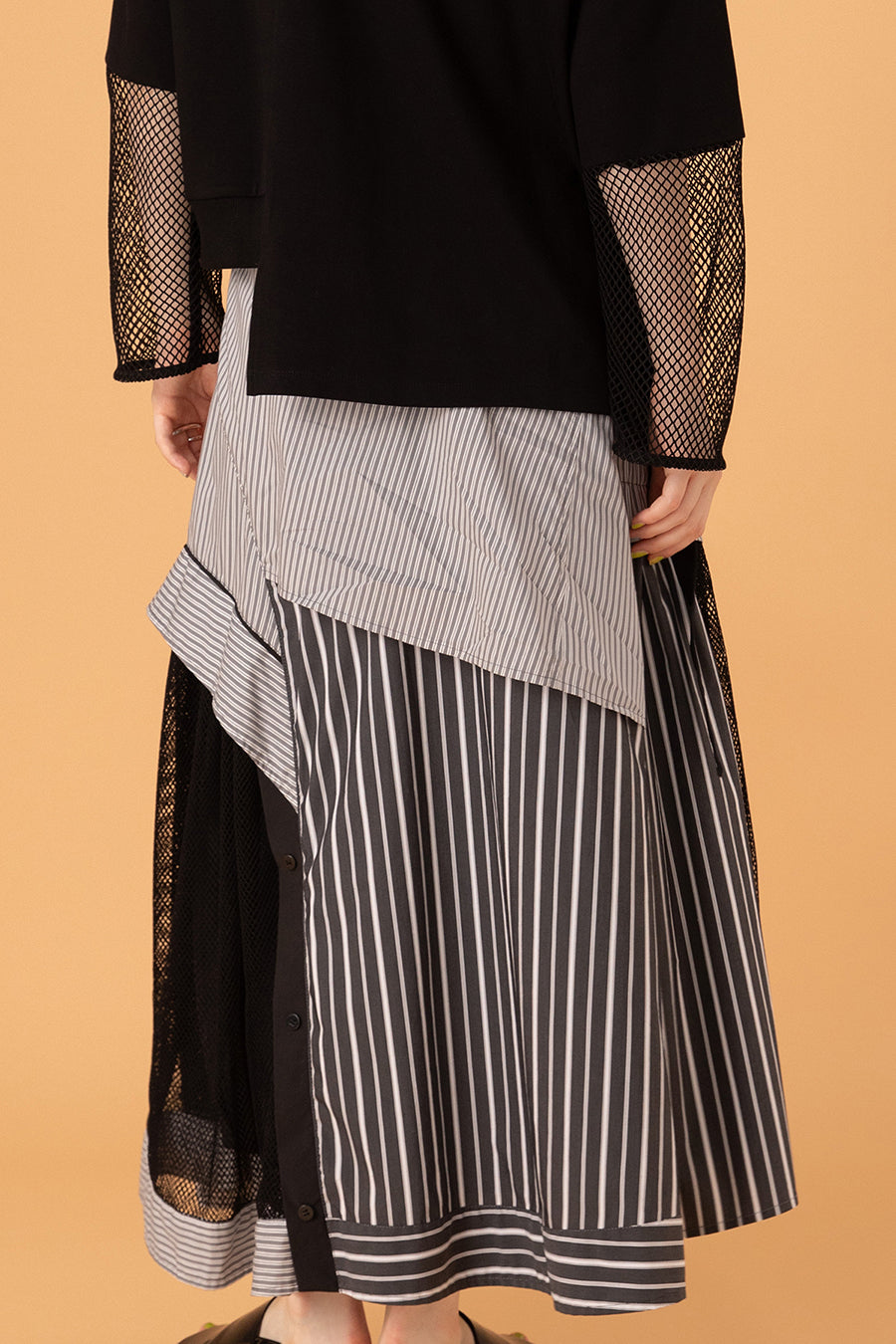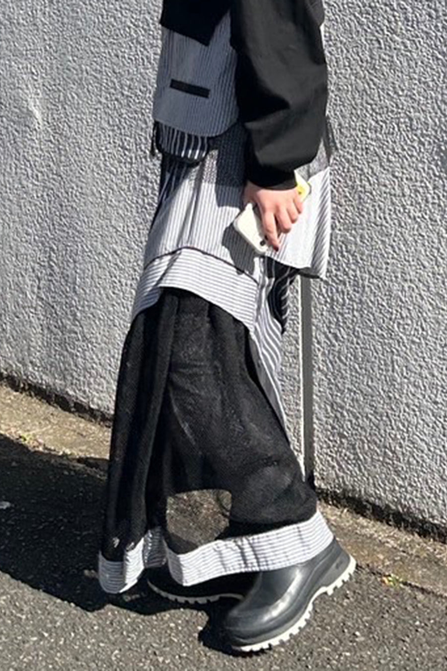 シャツのディティールを取り入れたデザインが立体的なフレアースカート。下パーツにはメッシュを切り替え、エッジをプラス。アウラアイラらしい異素材コンビで他には無いアイテム。前ヨークや左切り替えのパイピングもさりげないデザインポイント。右前の襟デザインはポケットになっており、実用性も◎