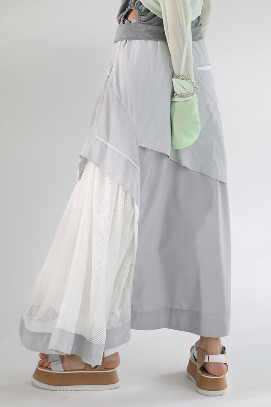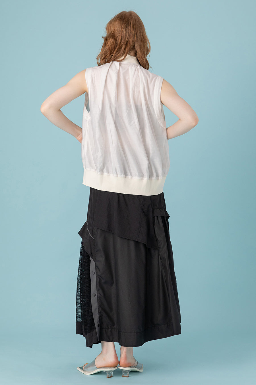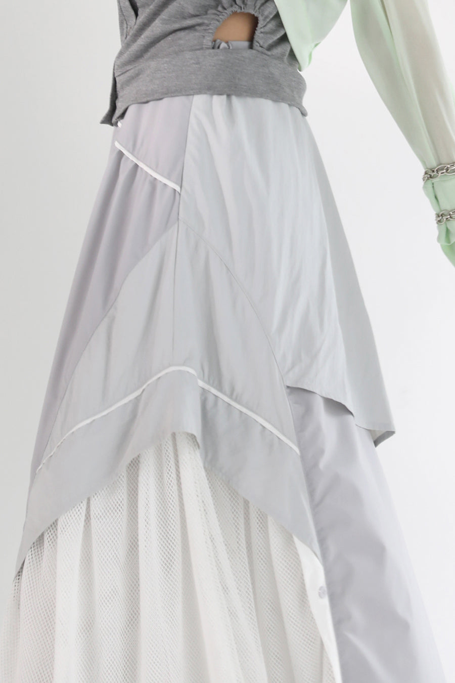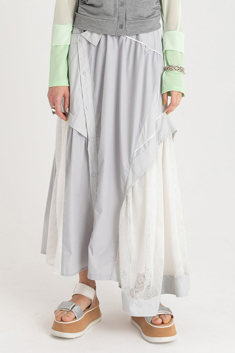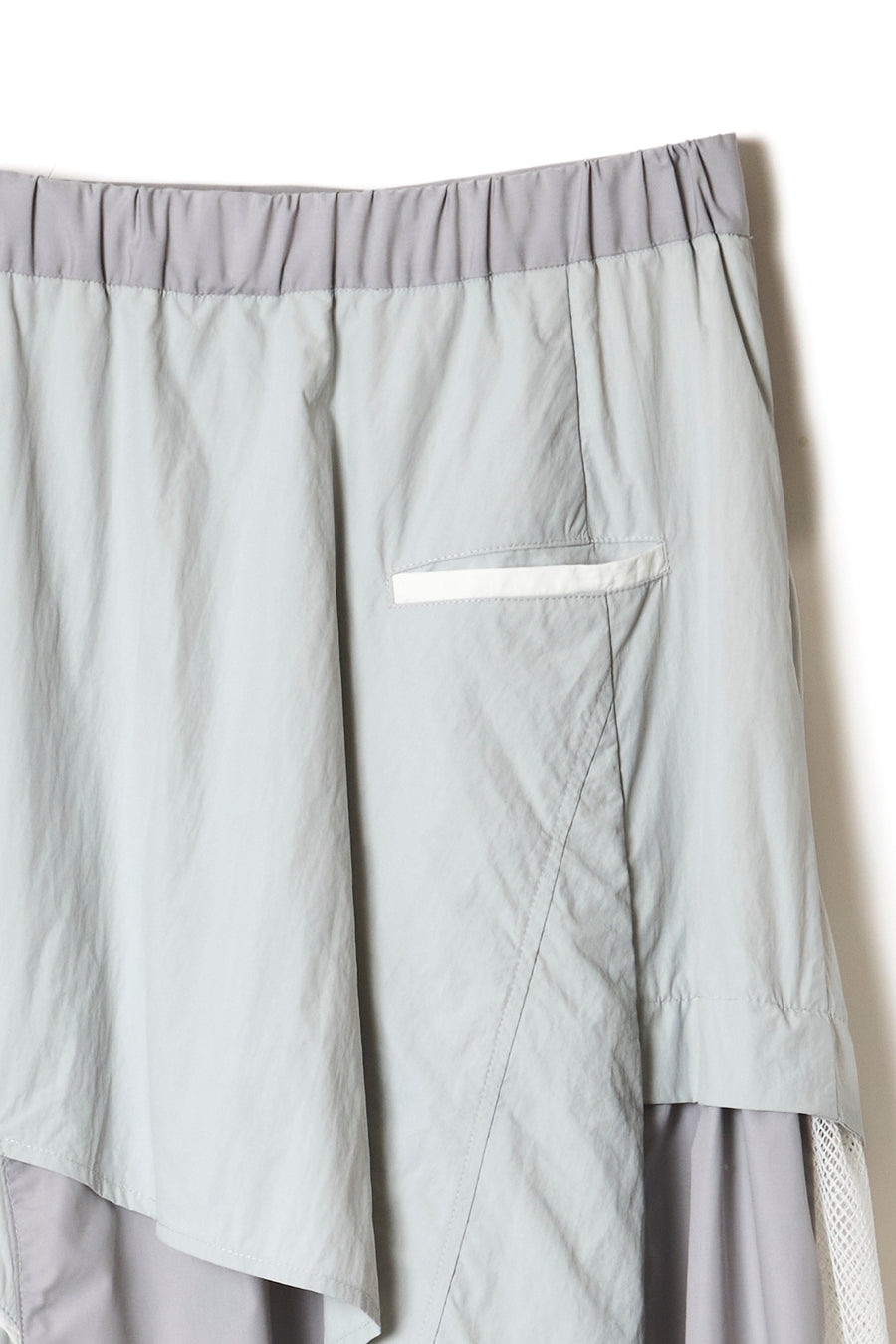 シャツのディティールを取り入れたデザインが立体的なフレアースカート。下パーツにはメッシュを切り替え、エッジをプラス。アウラアイラらしい異素材コンビで他には無いアイテム。前ヨークや左切り替えのパイピングもさりげないデザインポイント。右前の襟デザインはポケットになっており、実用性も◎