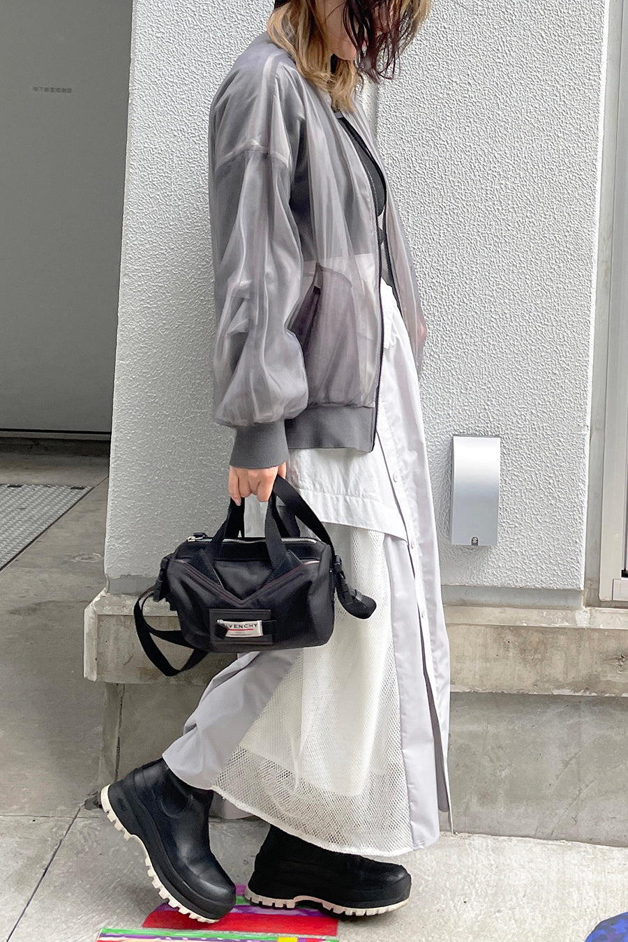 無地:綿混のシャツ地とナイロンタフタの組み合わせ。同系色の生地なのでスタイリングに合わせやすく、マットなナイロンタフタのコンビネーションがモードな印象。