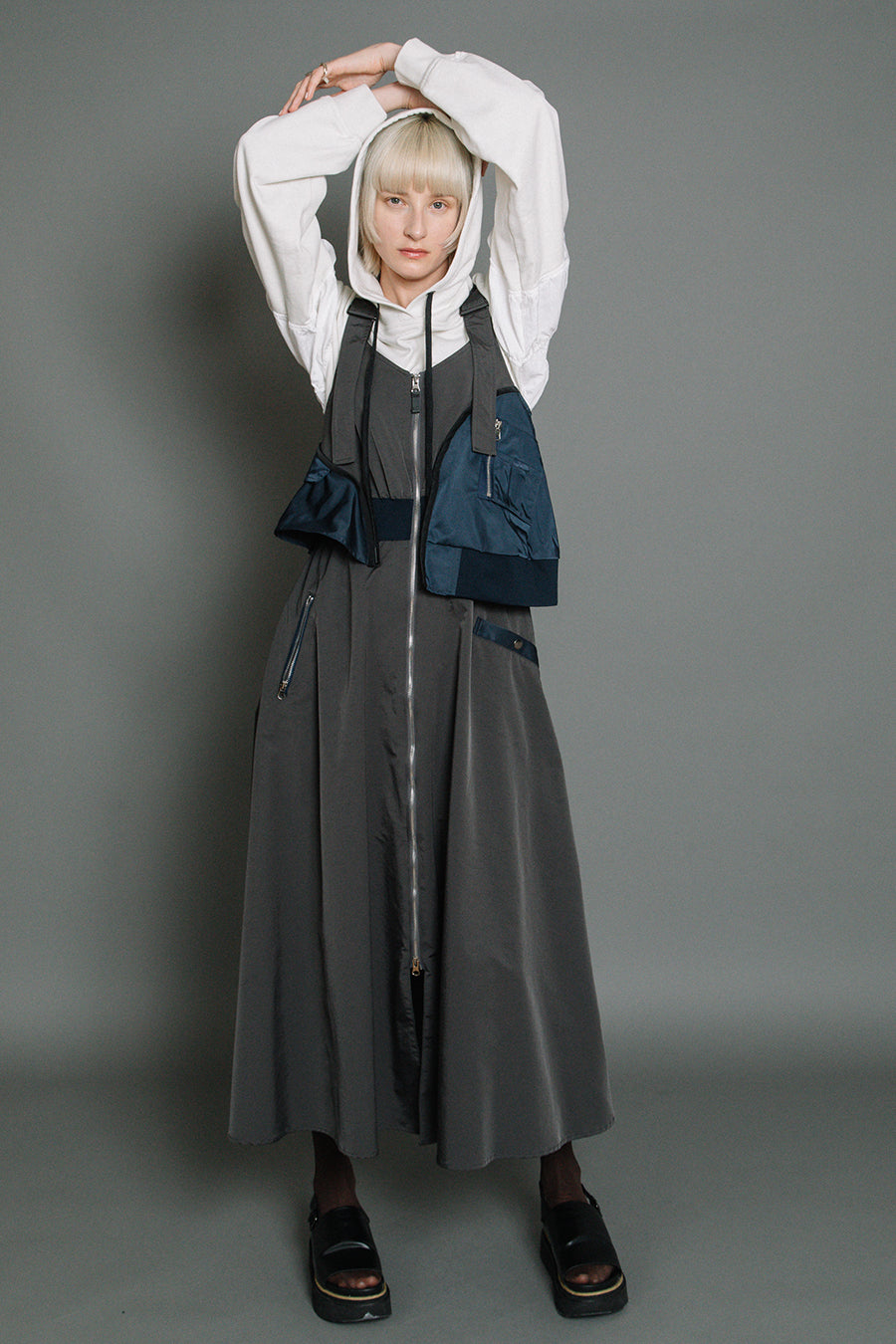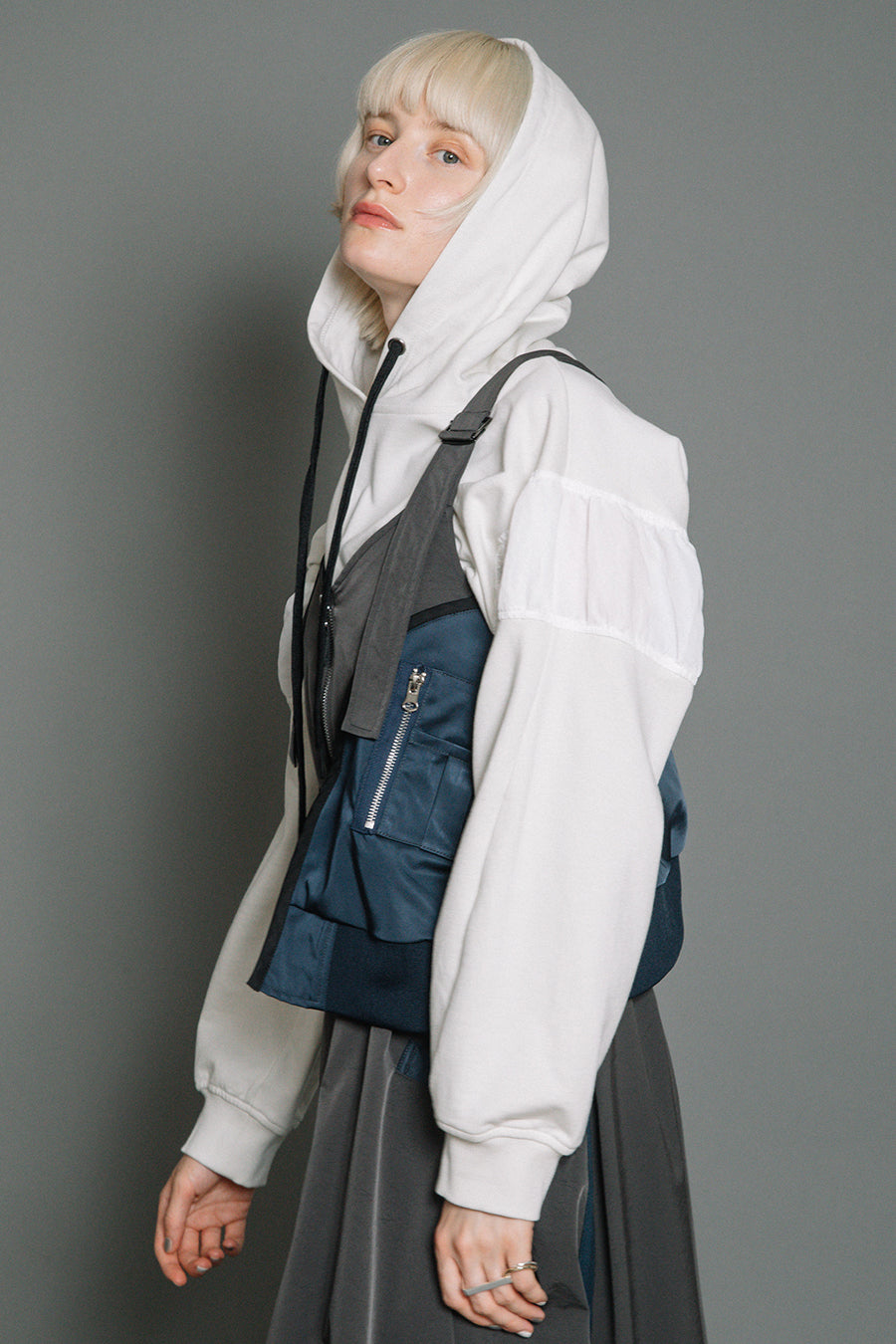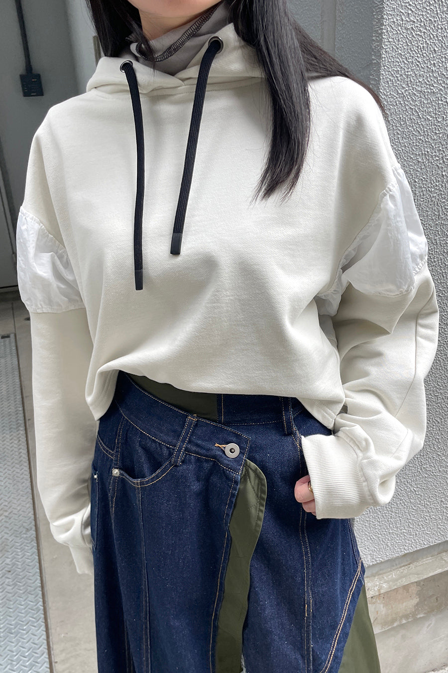 フードから覗く配色のブラックコードもポイント。