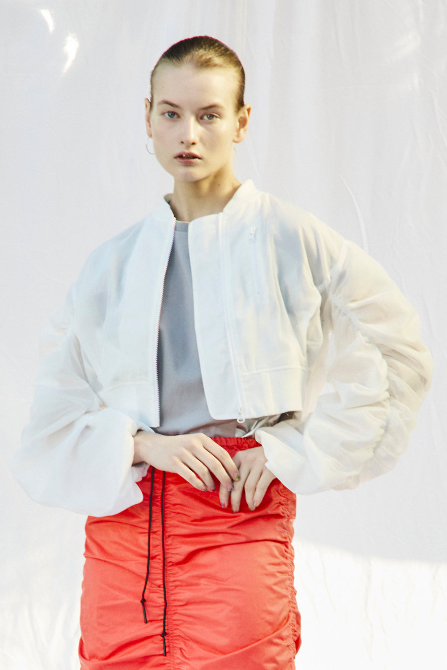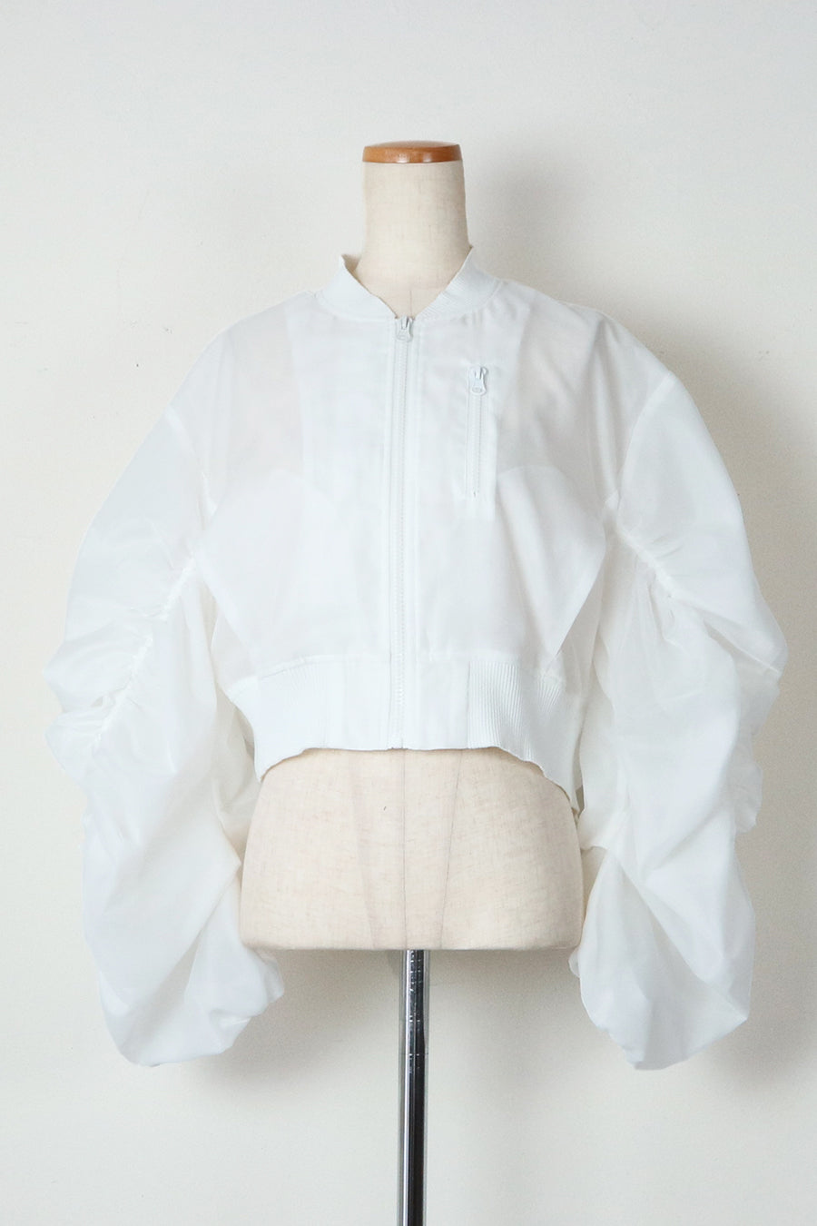 袖と背中にたっぷり寄せたギャザーでトレンド感のあるシアーショートブルゾン。