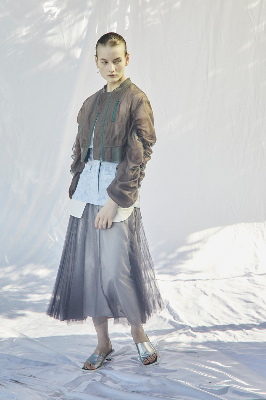 表はチュール、内側はソフトオーガンジーの2枚仕立てで立体感があり、フェミニンな雰囲気がありながらもリブや太ジップのカジュアルディテールをミックスしたお洒落アイテム。