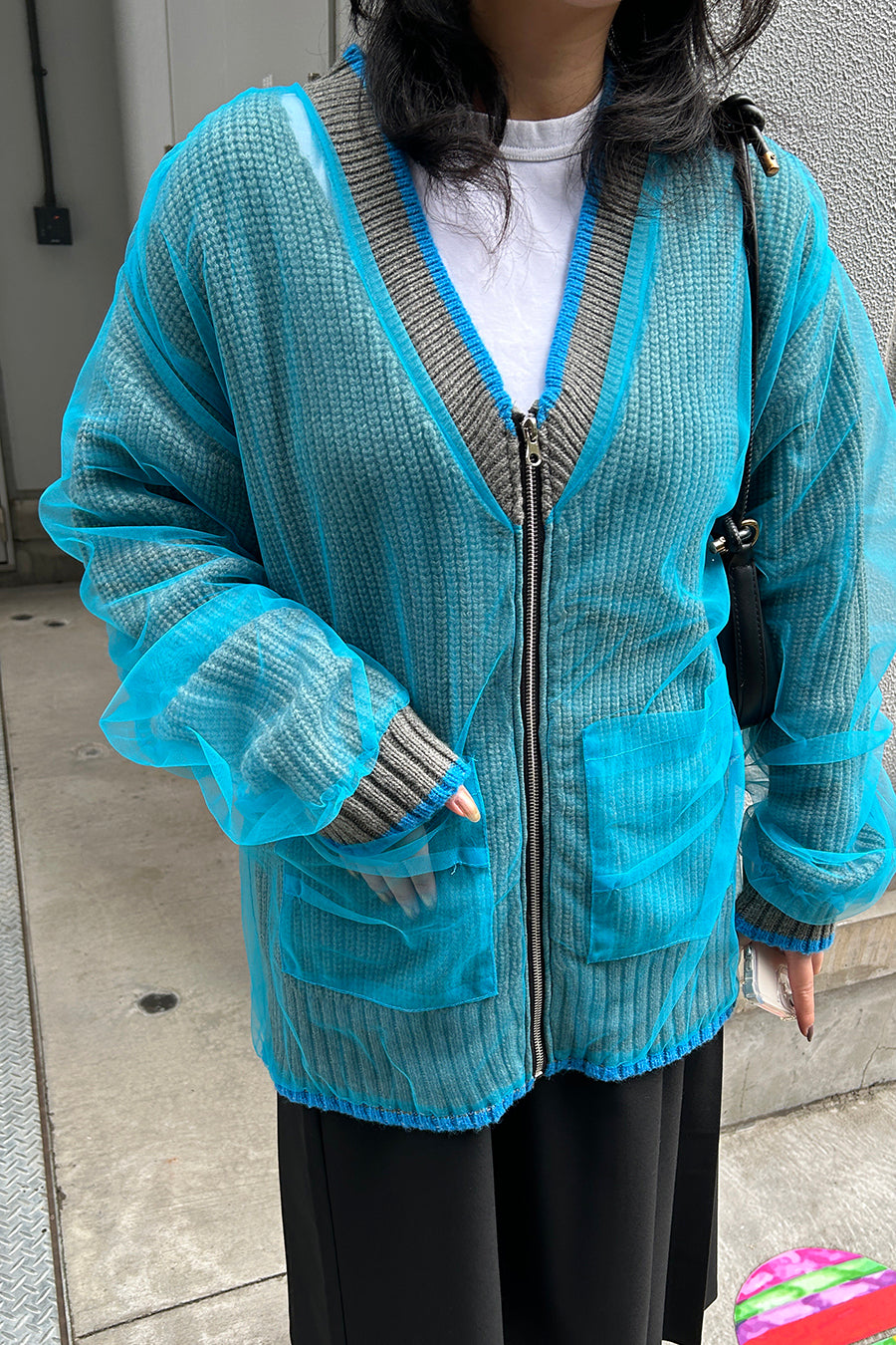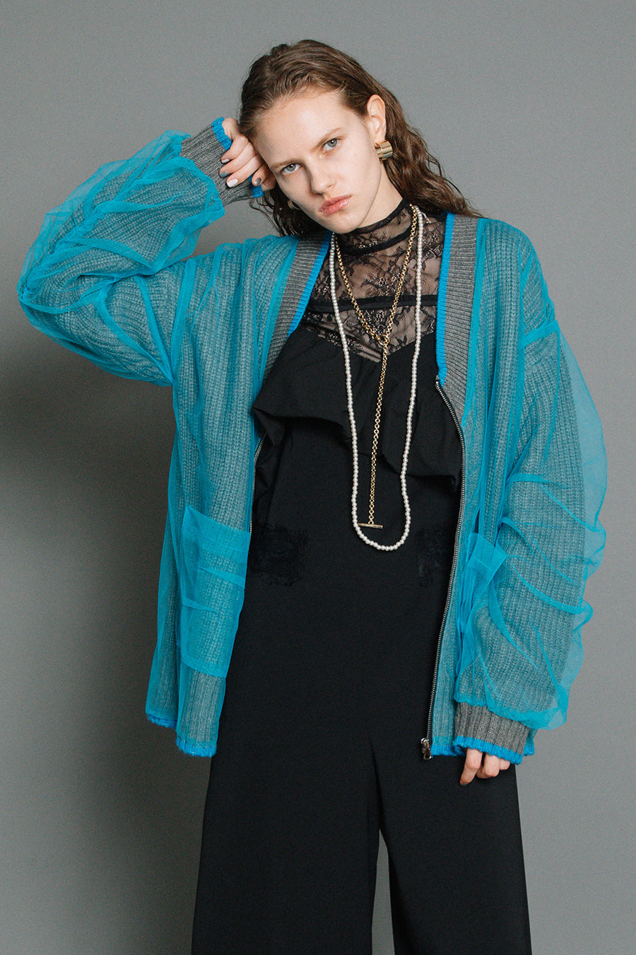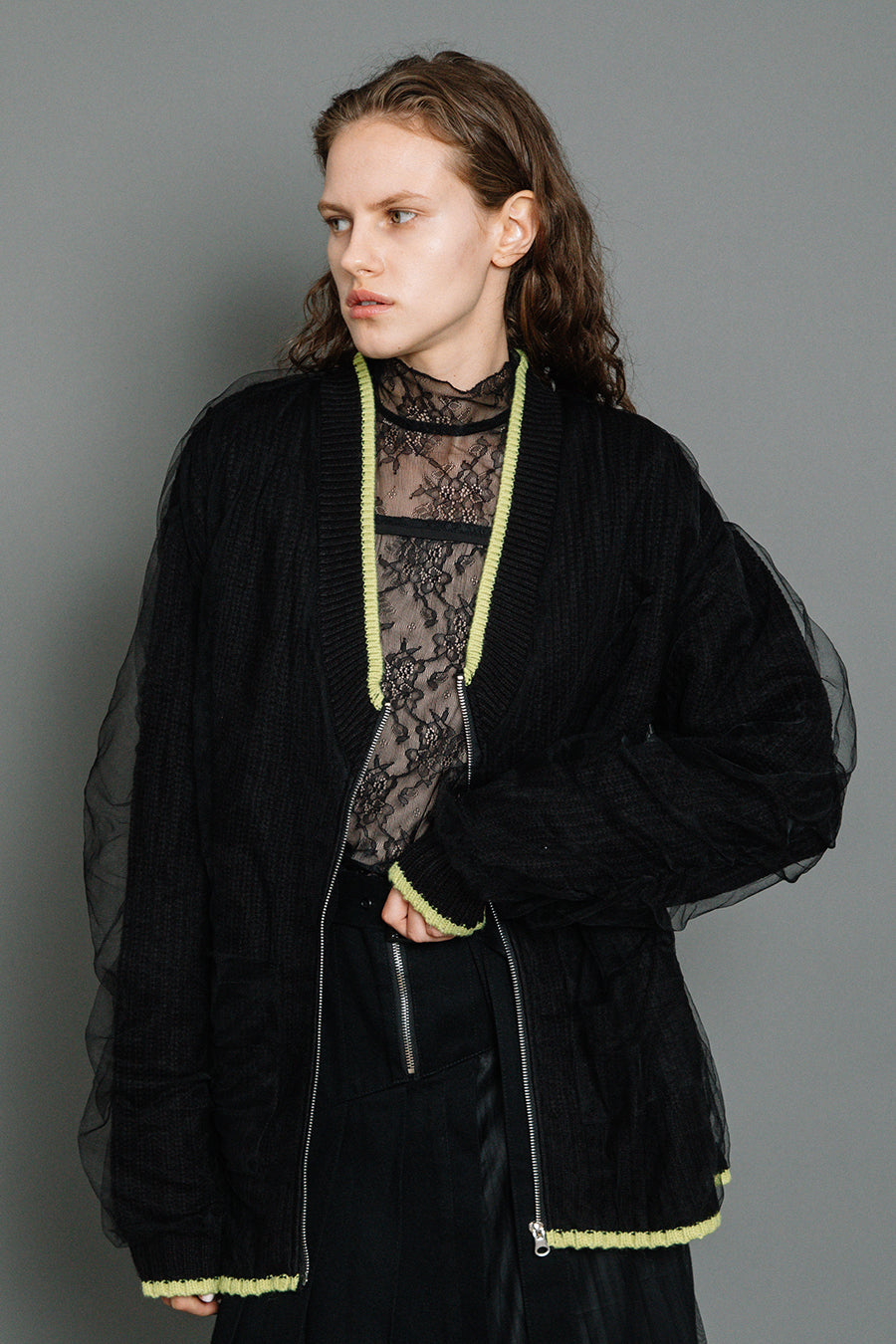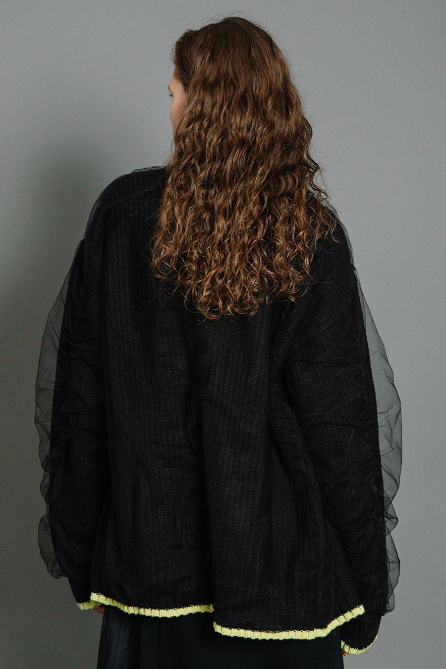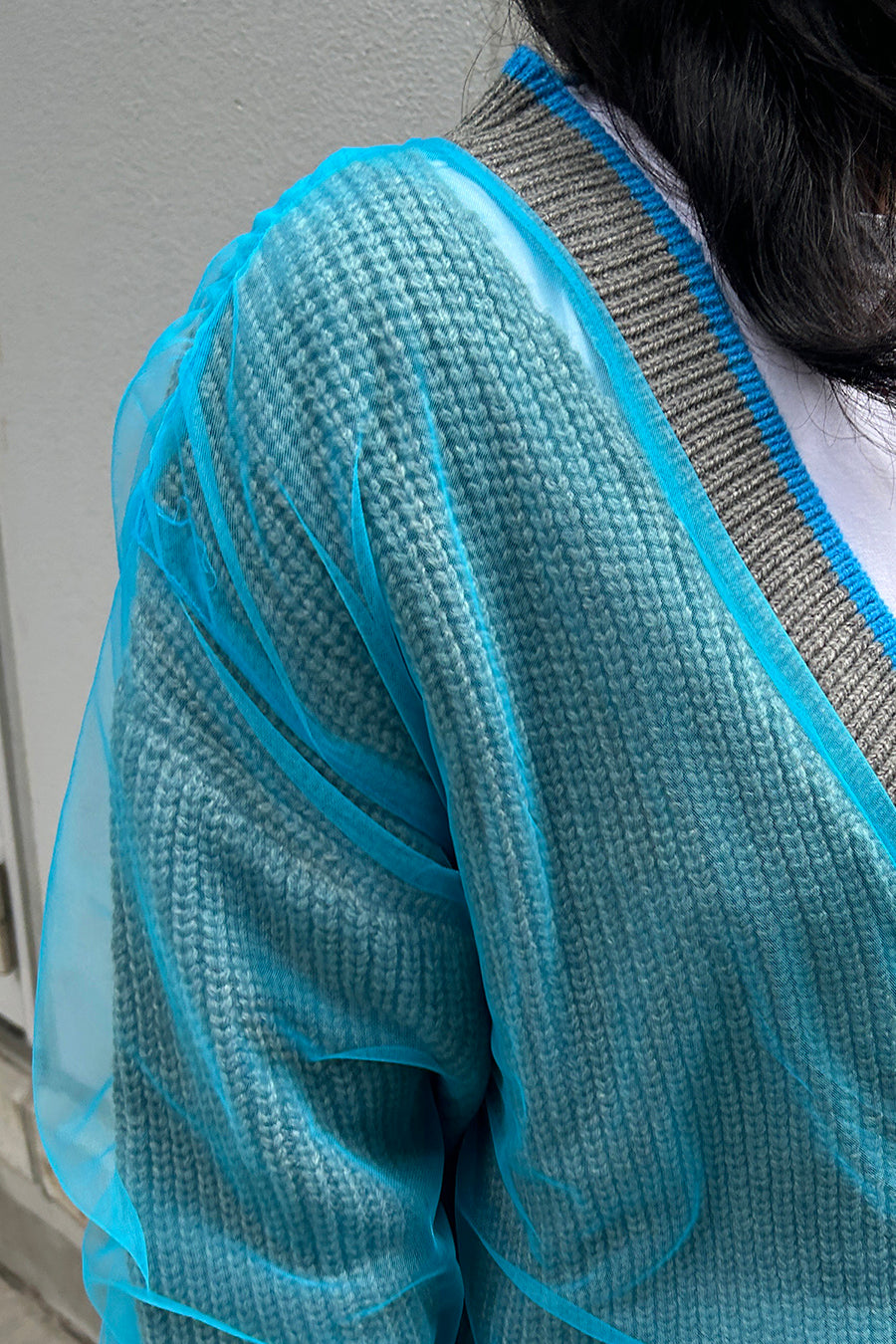 ローゲージでざっくりと編み上げたウール混ニットに、ソフトな肌触りのチュールを重ねたカーディガン。
