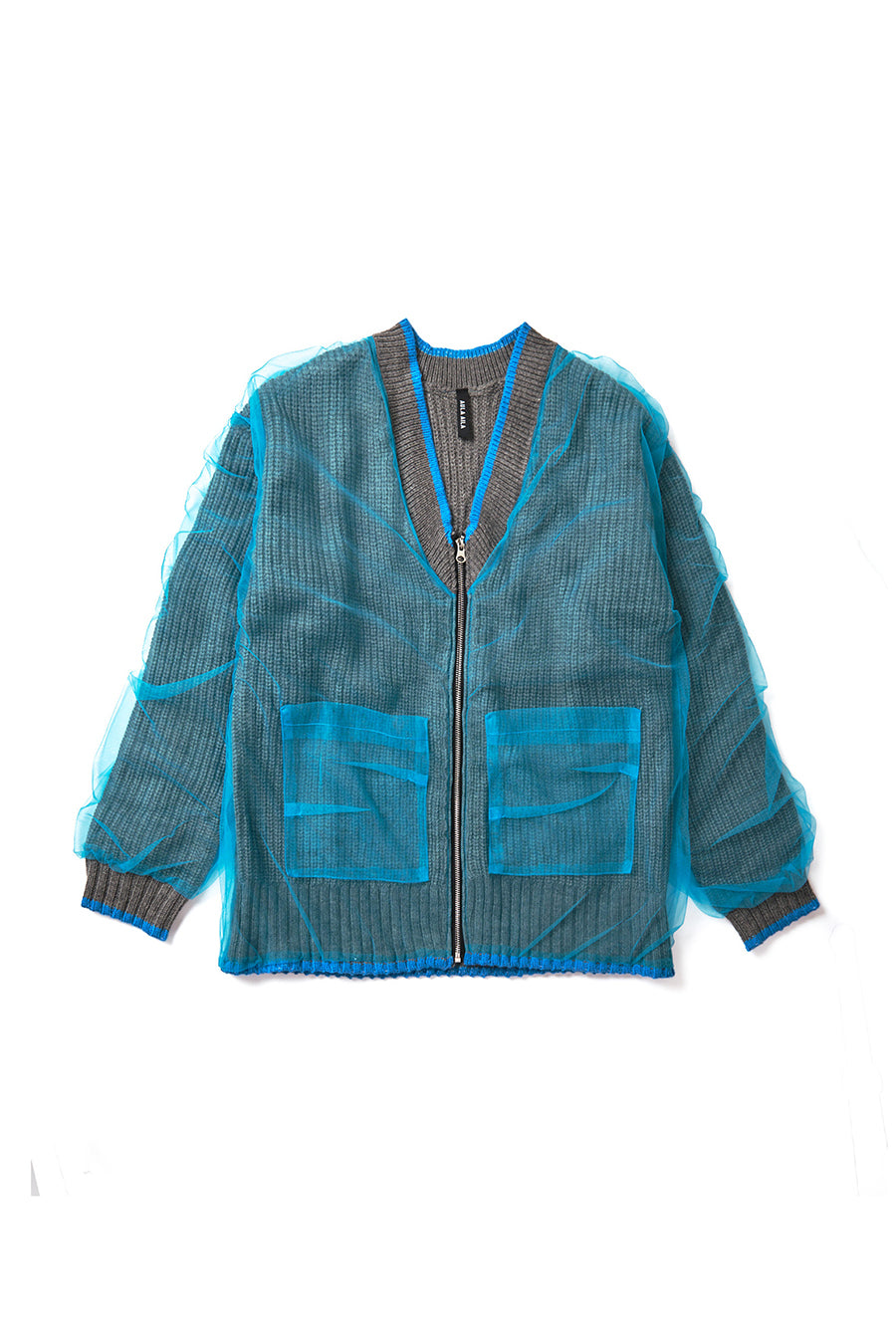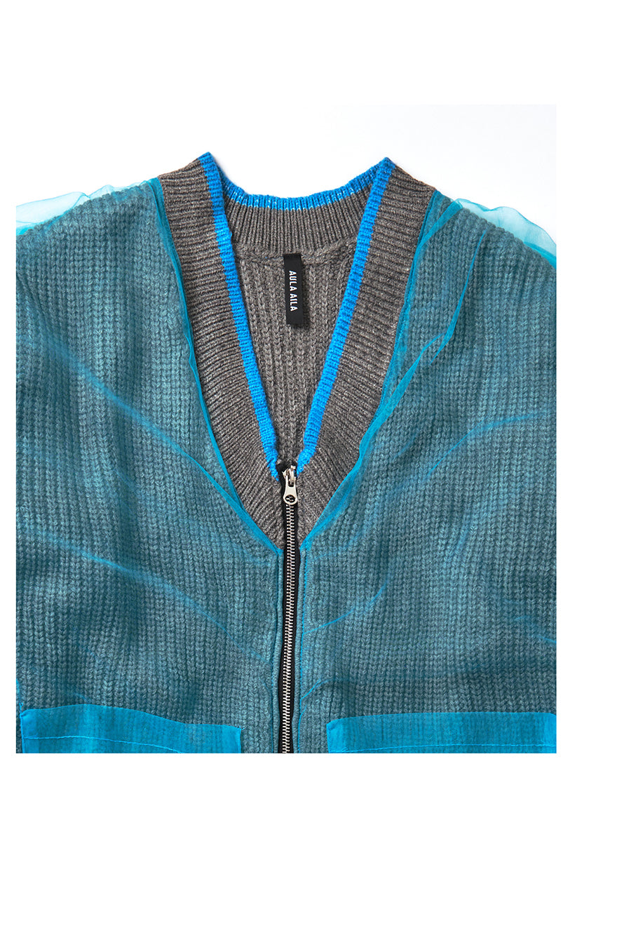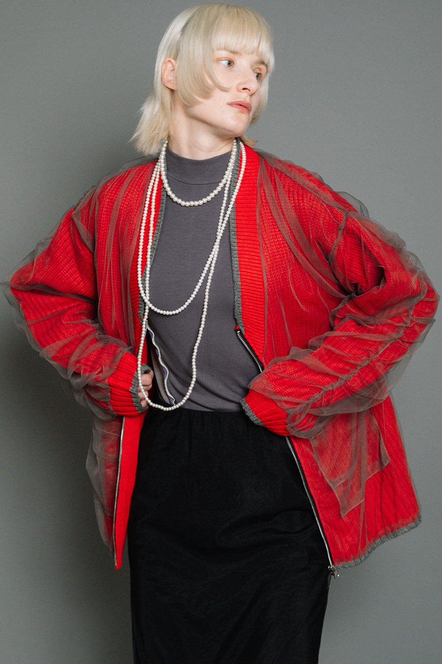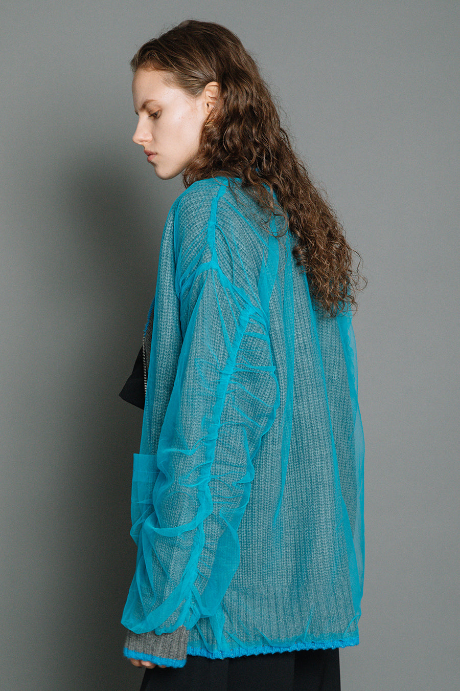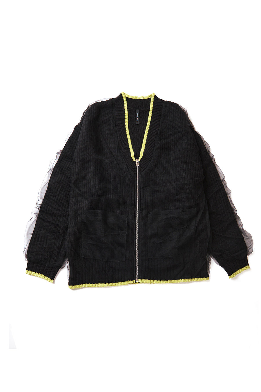 ローゲージでざっくりと編み上げたウール混ニットに、ソフトな肌触りのチュールを重ねたカーディガン。