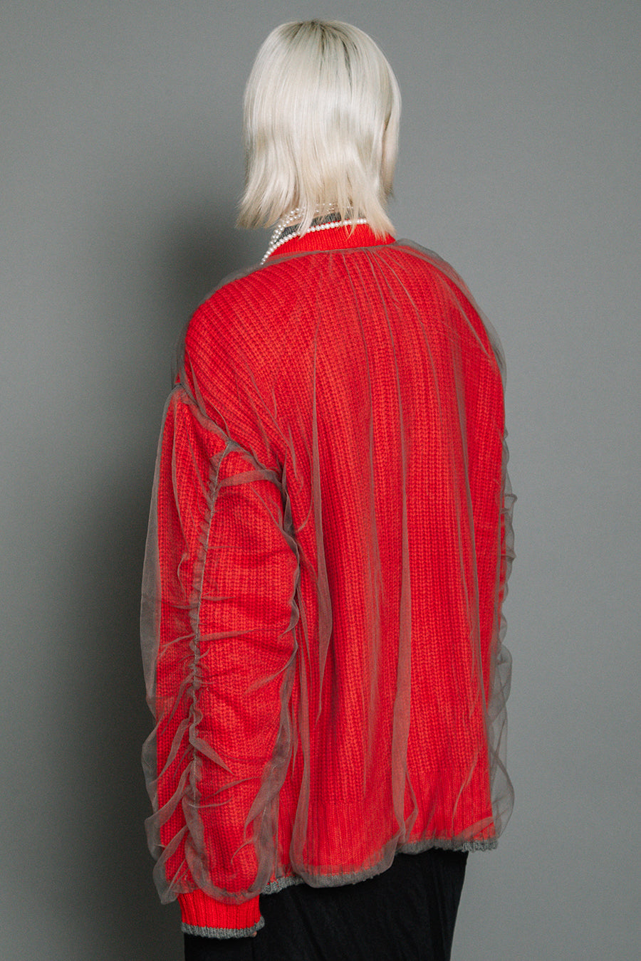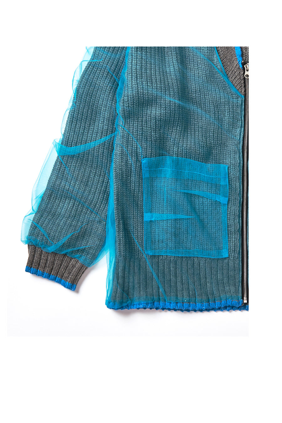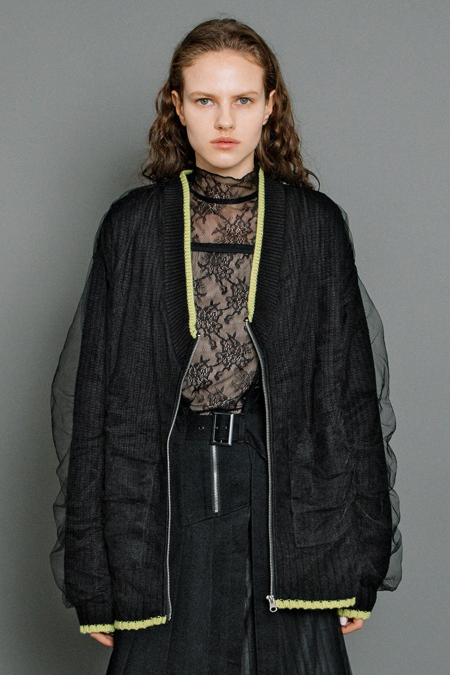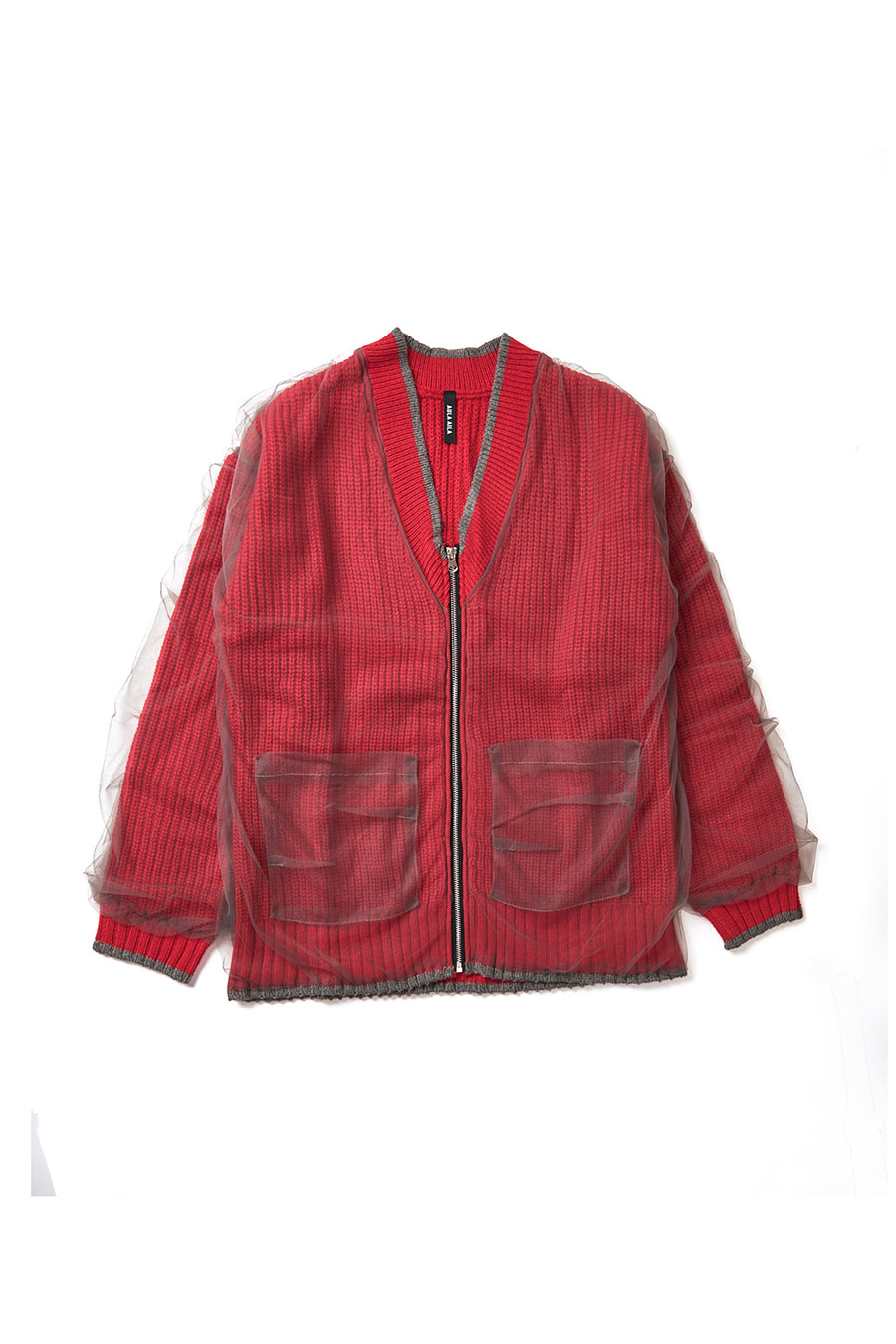 ローゲージでざっくりと編み上げたウール混ニットに、ソフトな肌触りのチュールを重ねたカーディガン。