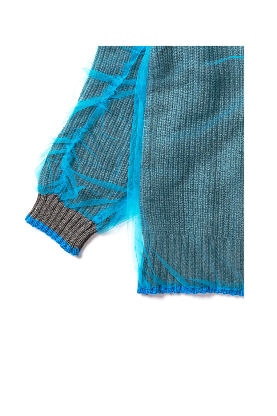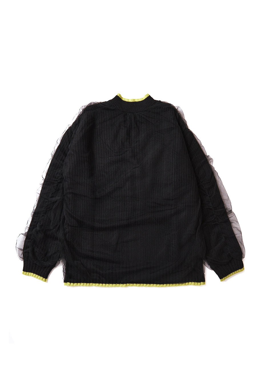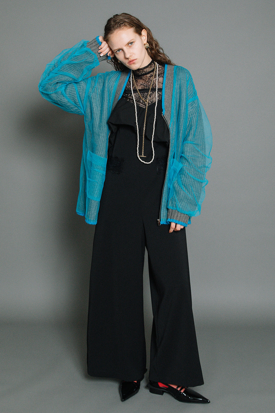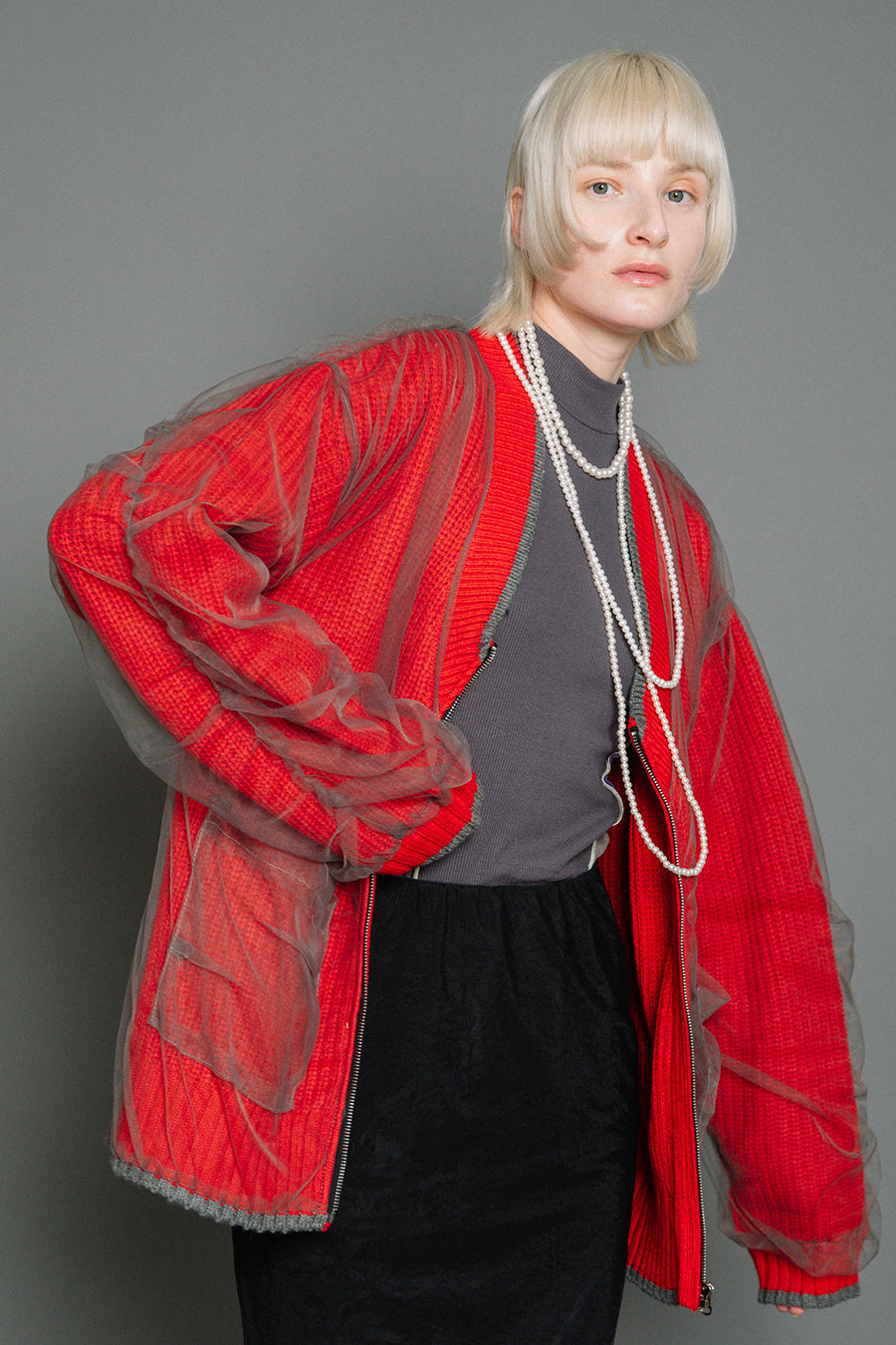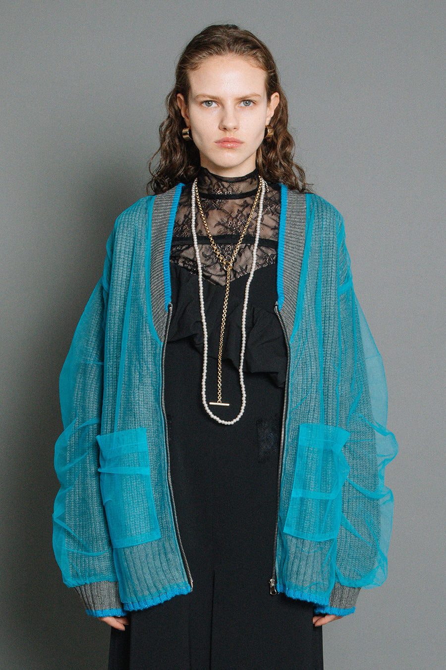 ローゲージでざっくりと編み上げたウール混ニットに、ソフトな肌触りのチュールを重ねたカーディガン。