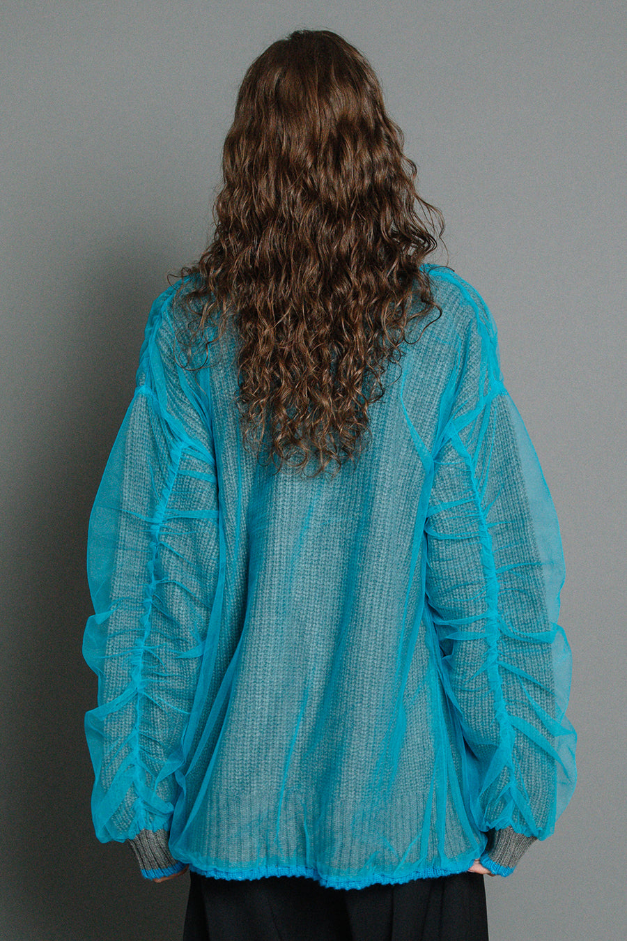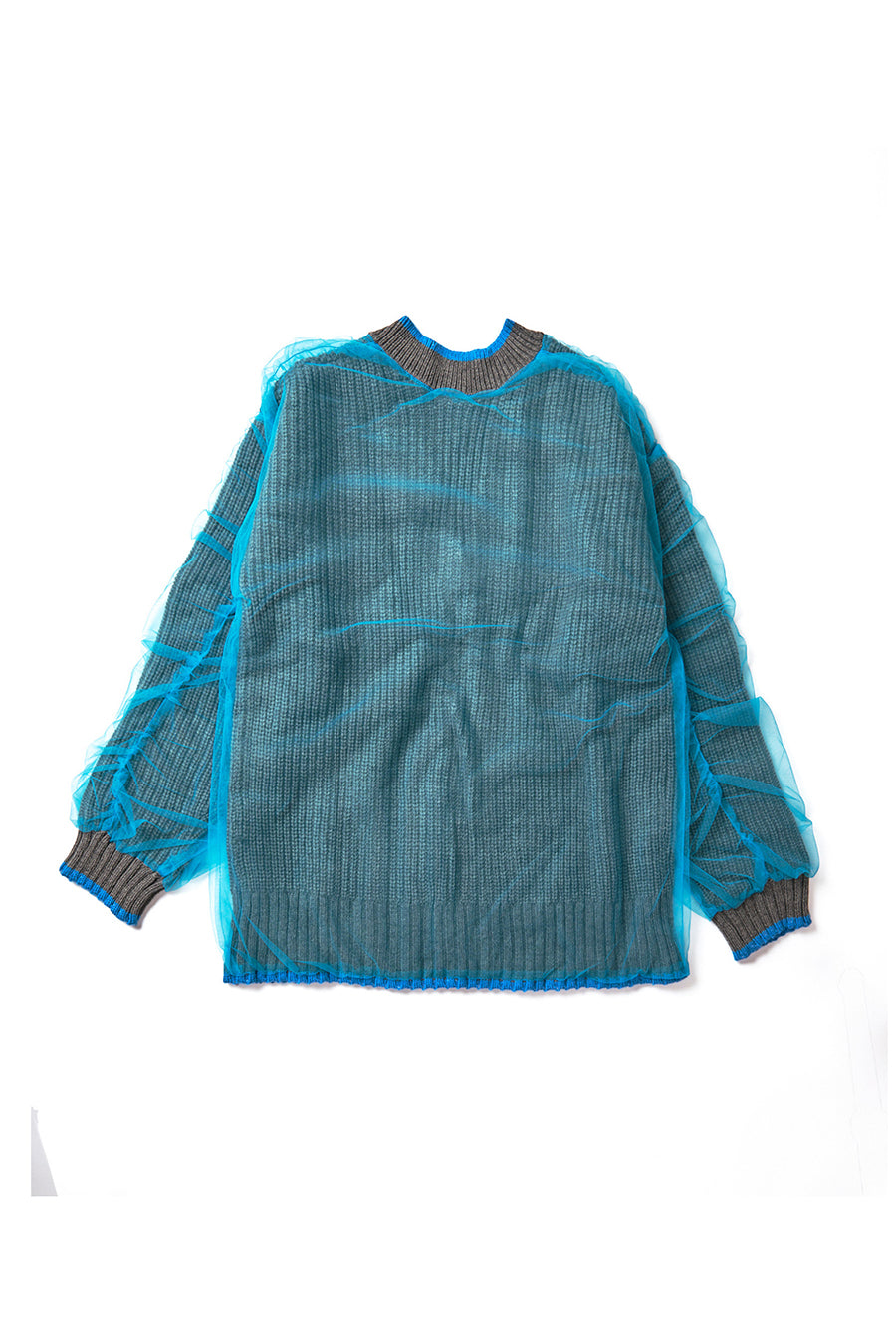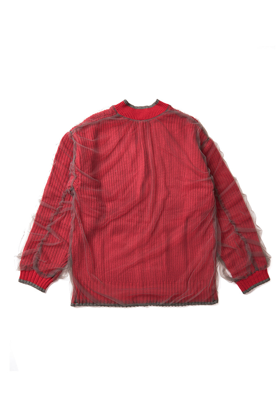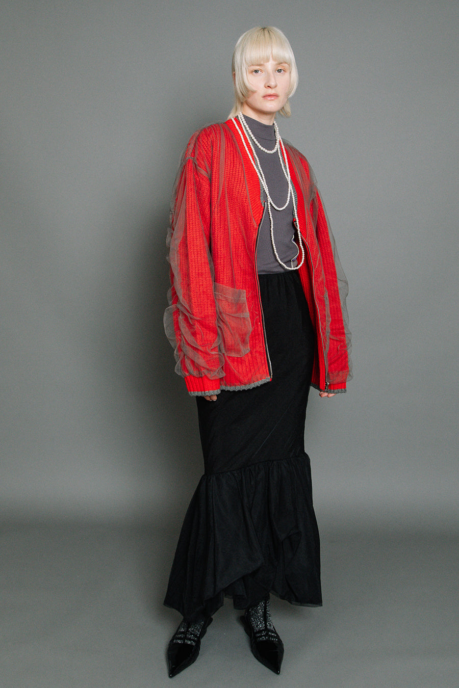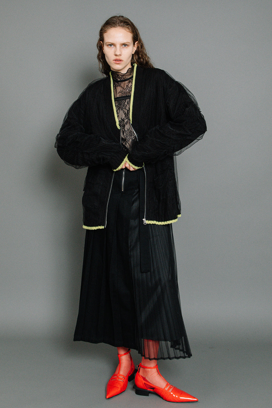 ローゲージでざっくりと編み上げたウール混ニットに、ソフトな肌触りのチュールを重ねたカーディガン。