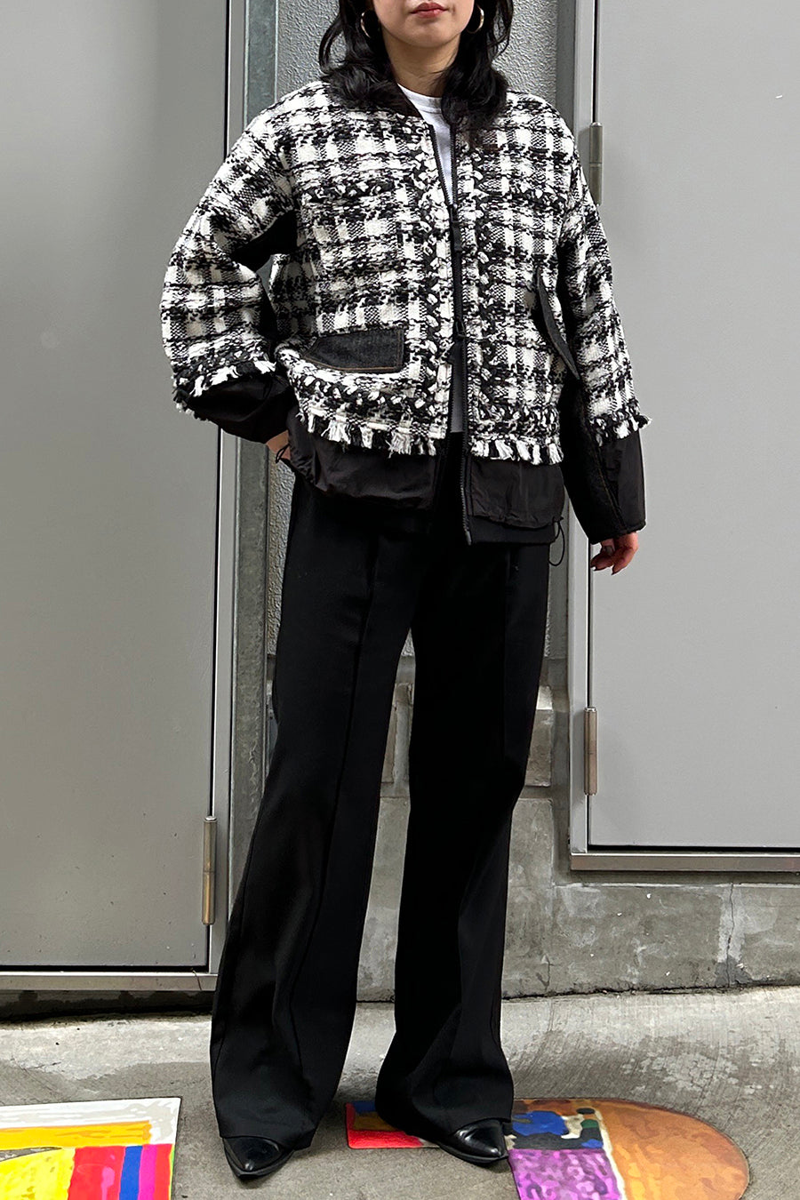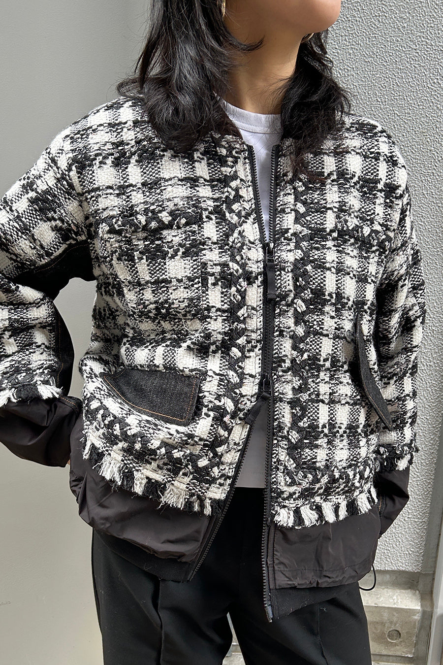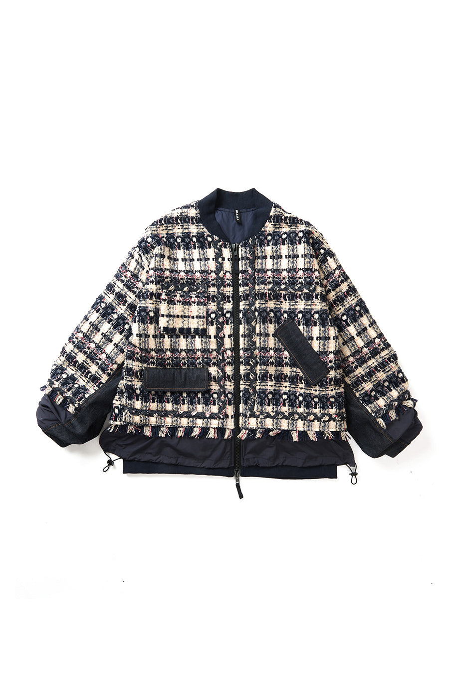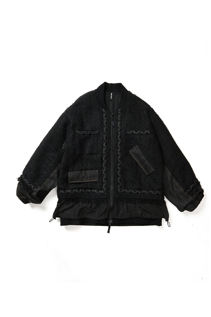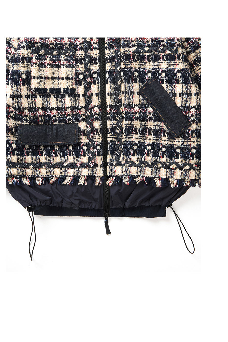 フロントはダブルジップなので、下から開けても◎エレガントなツイードジャケットにカジュアルさ、異素材がミックスされ、前面中綿入りで防寒にもすぐれた機能性の高いアウターブルゾン。