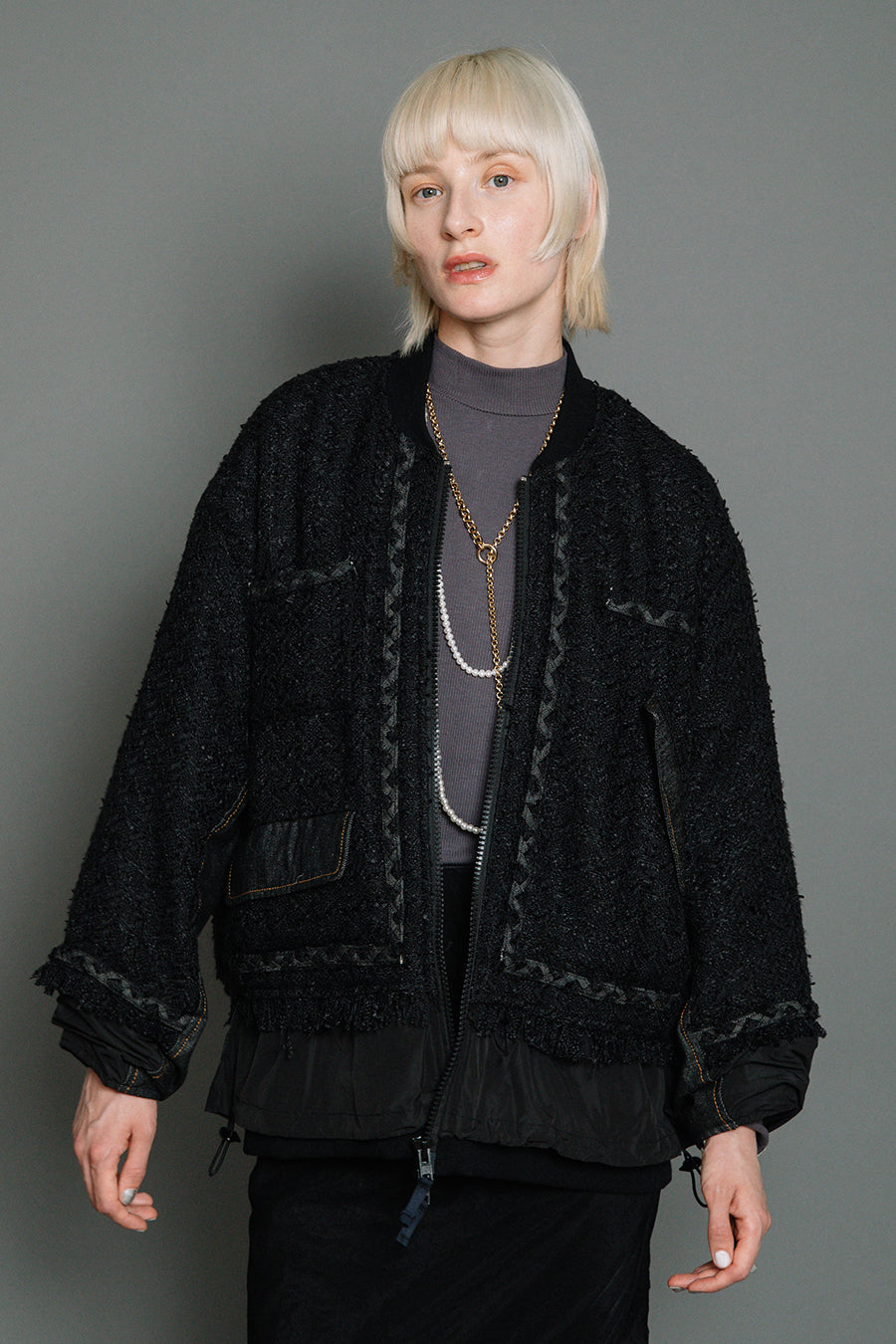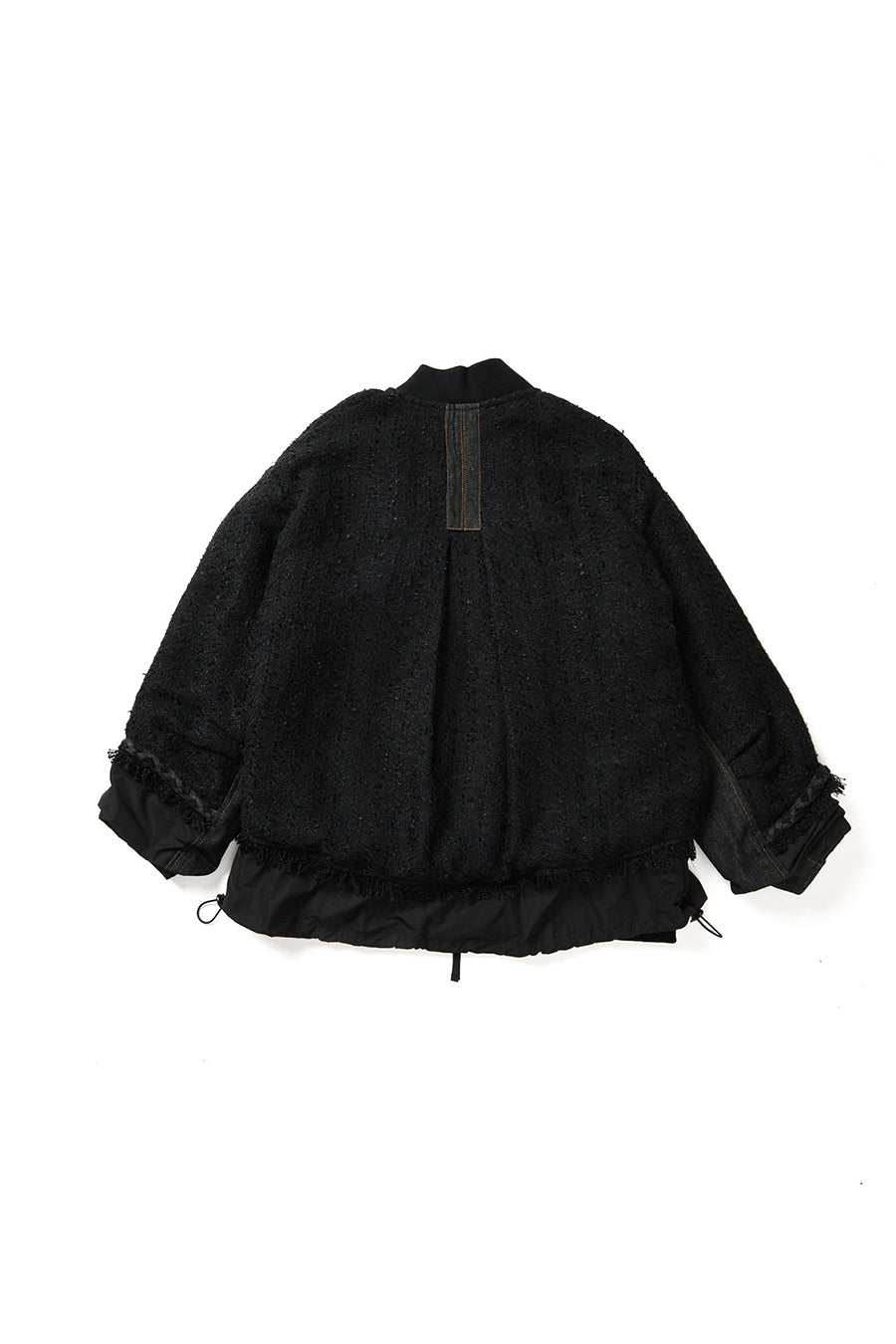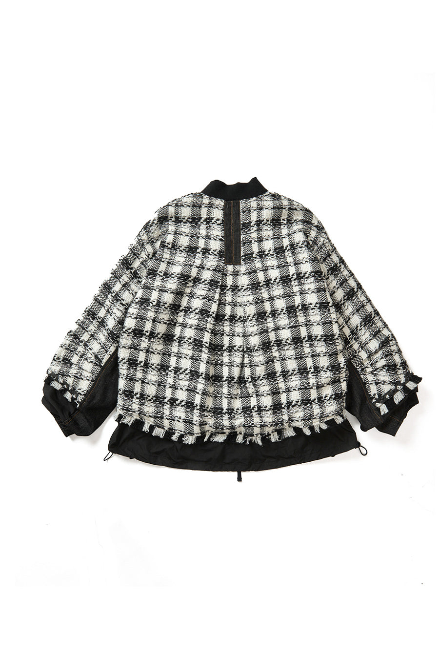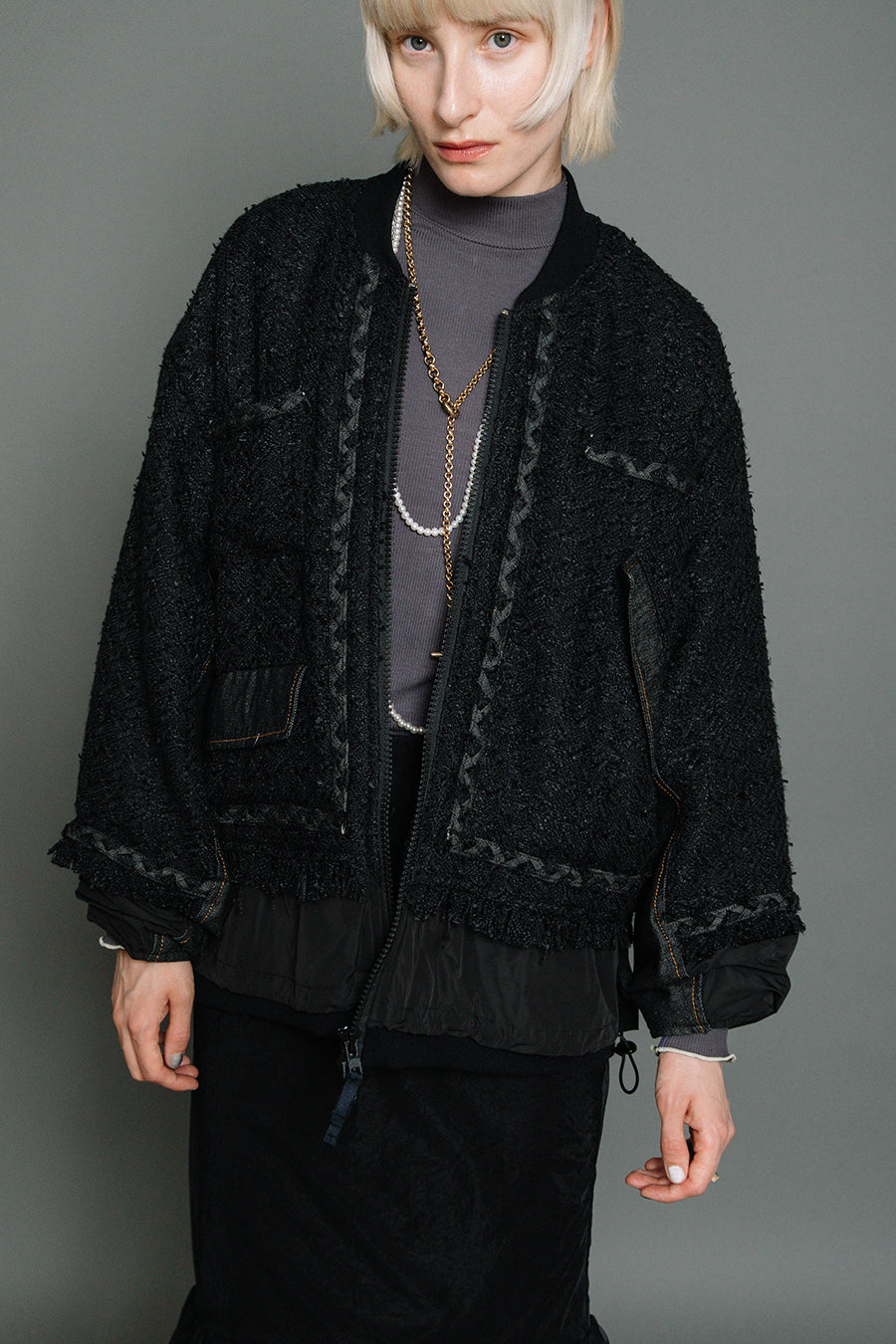 フロントはダブルジップなので、下から開けても◎エレガントなツイードジャケットにカジュアルさ、異素材がミックスされ、前面中綿入りで防寒にもすぐれた機能性の高いアウターブルゾン。