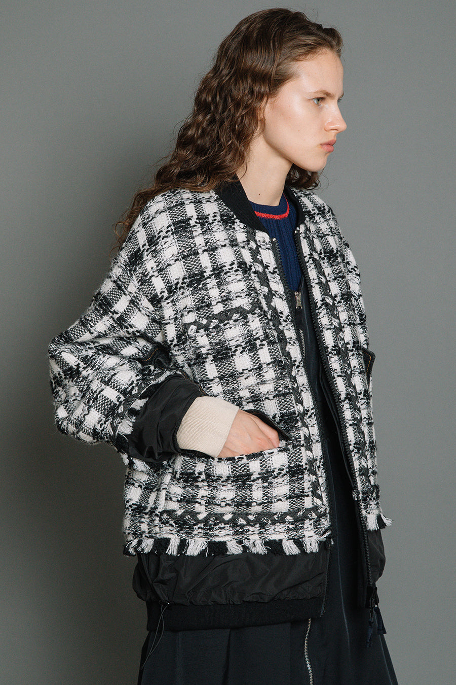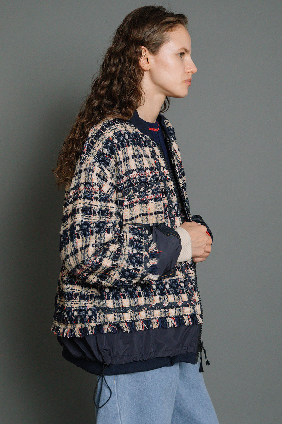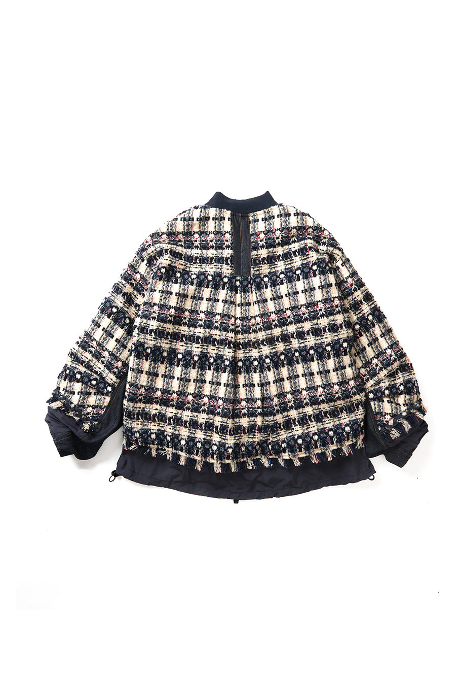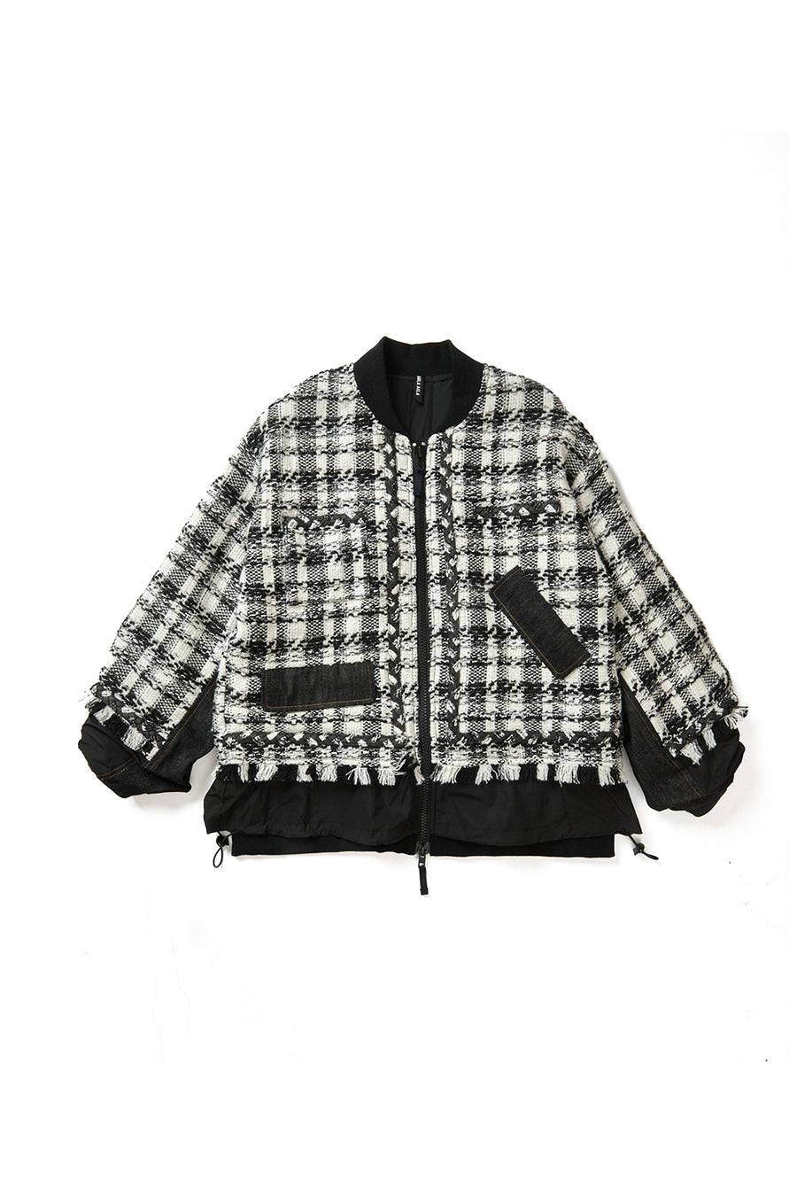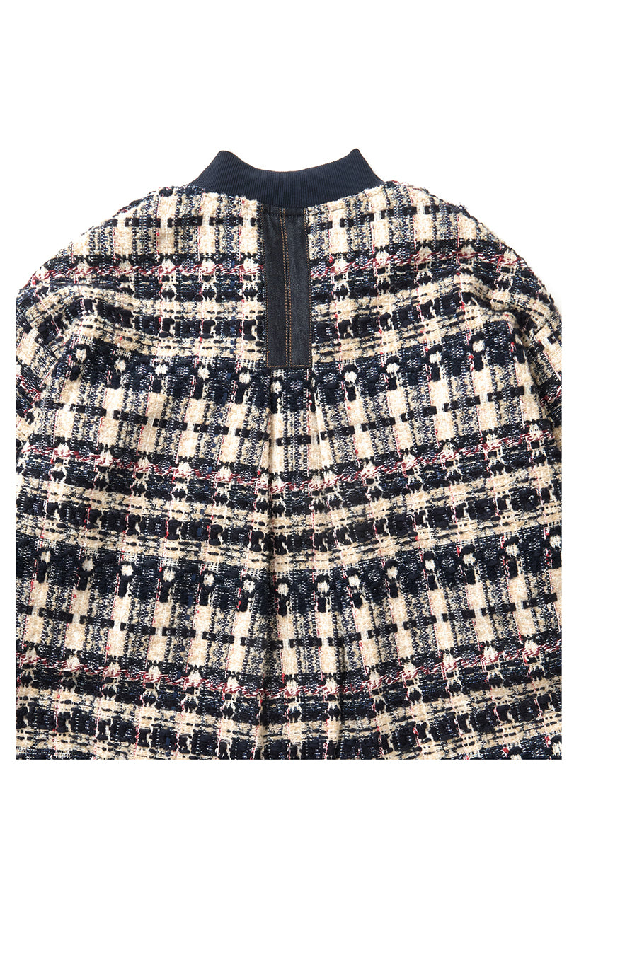 フロントはダブルジップなので、下から開けても◎エレガントなツイードジャケットにカジュアルさ、異素材がミックスされ、前面中綿入りで防寒にもすぐれた機能性の高いアウターブルゾン。