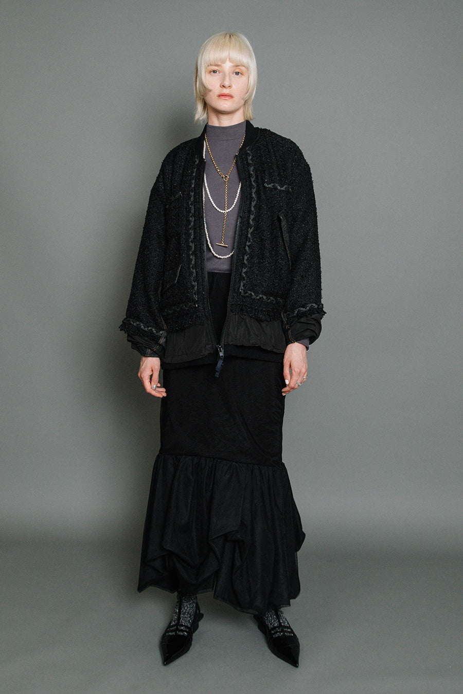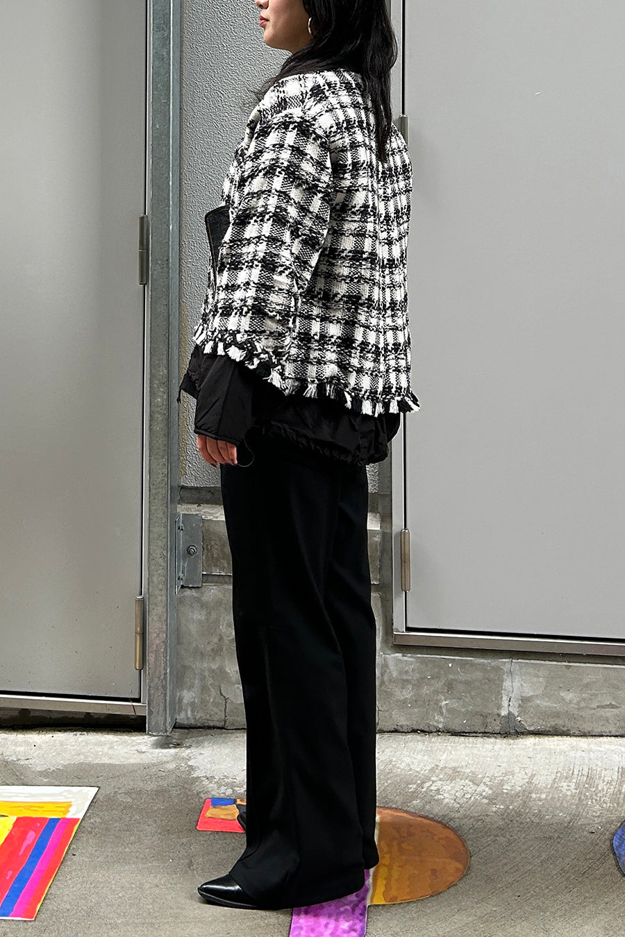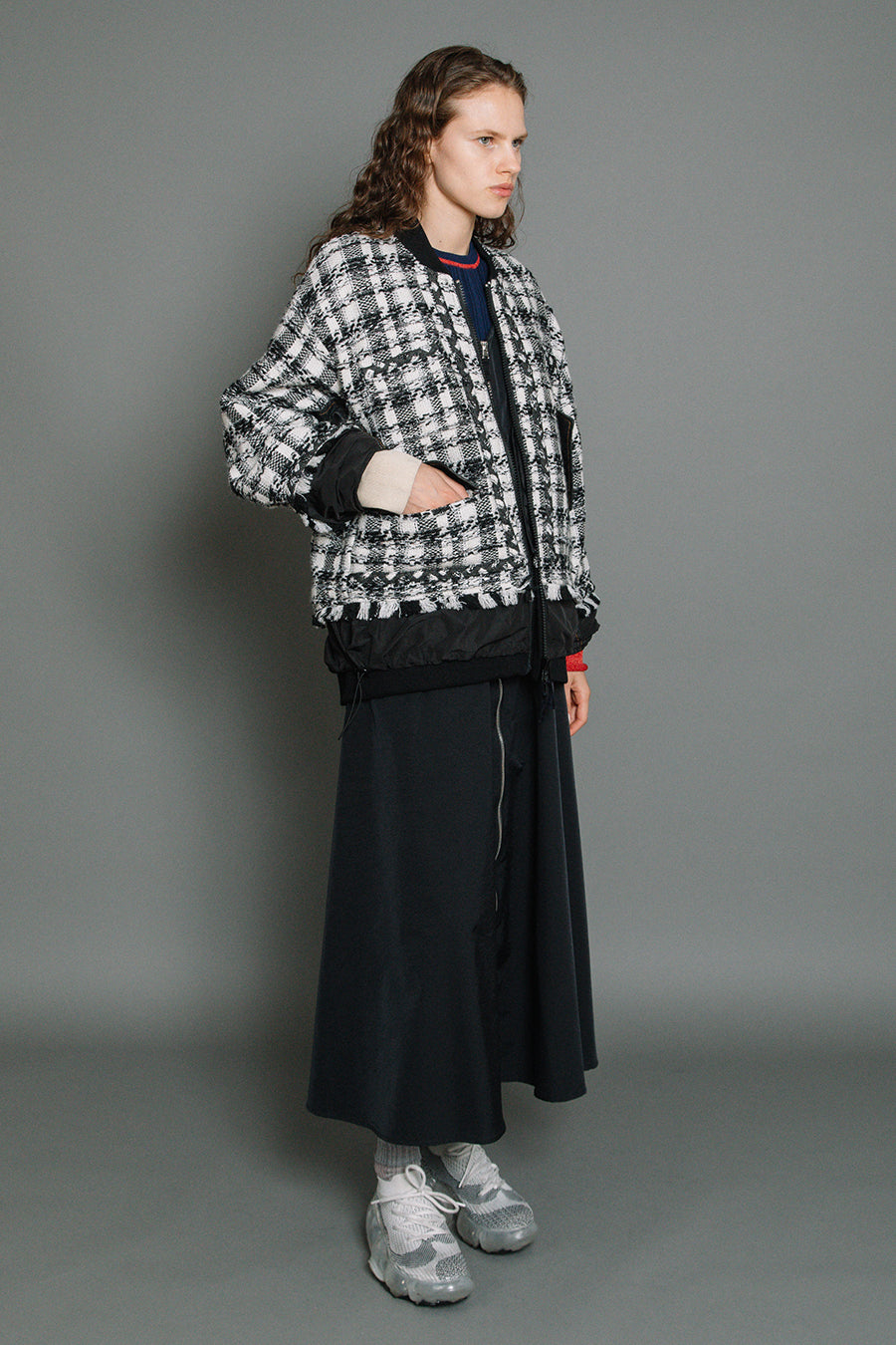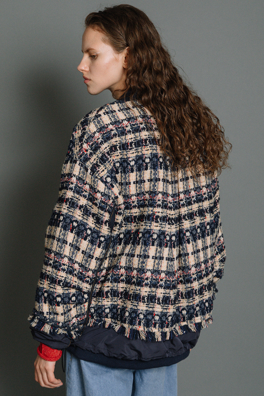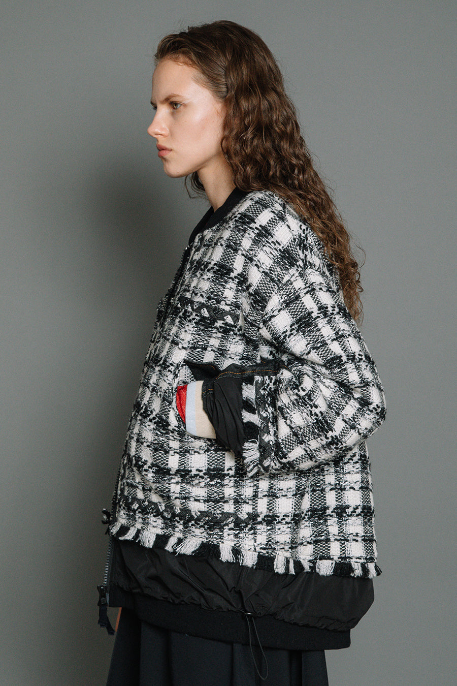 フロントはダブルジップなので、下から開けても◎エレガントなツイードジャケットにカジュアルさ、異素材がミックスされ、前面中綿入りで防寒にもすぐれた機能性の高いアウターブルゾン。