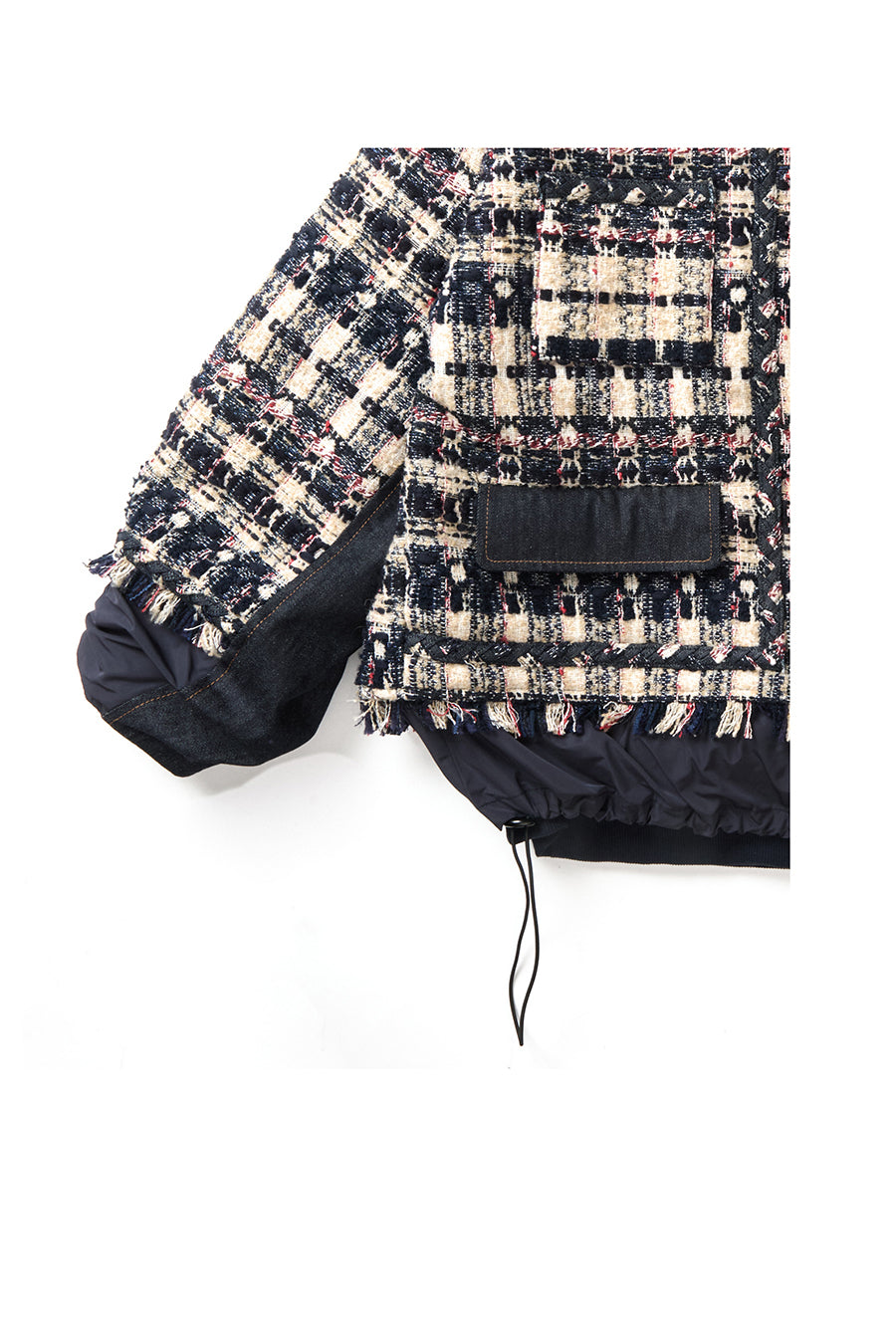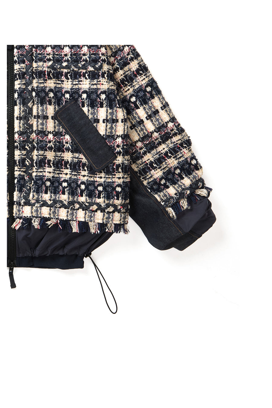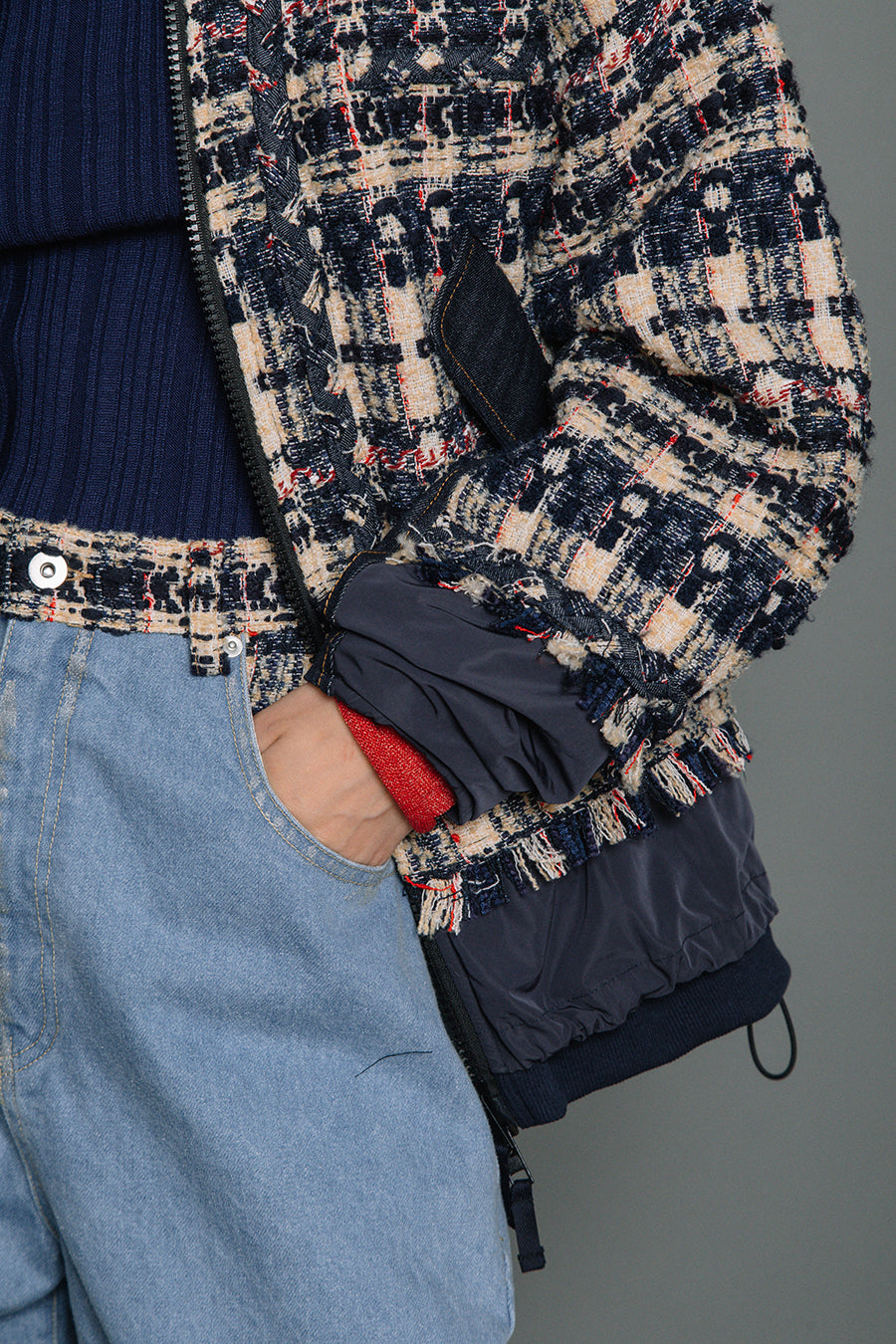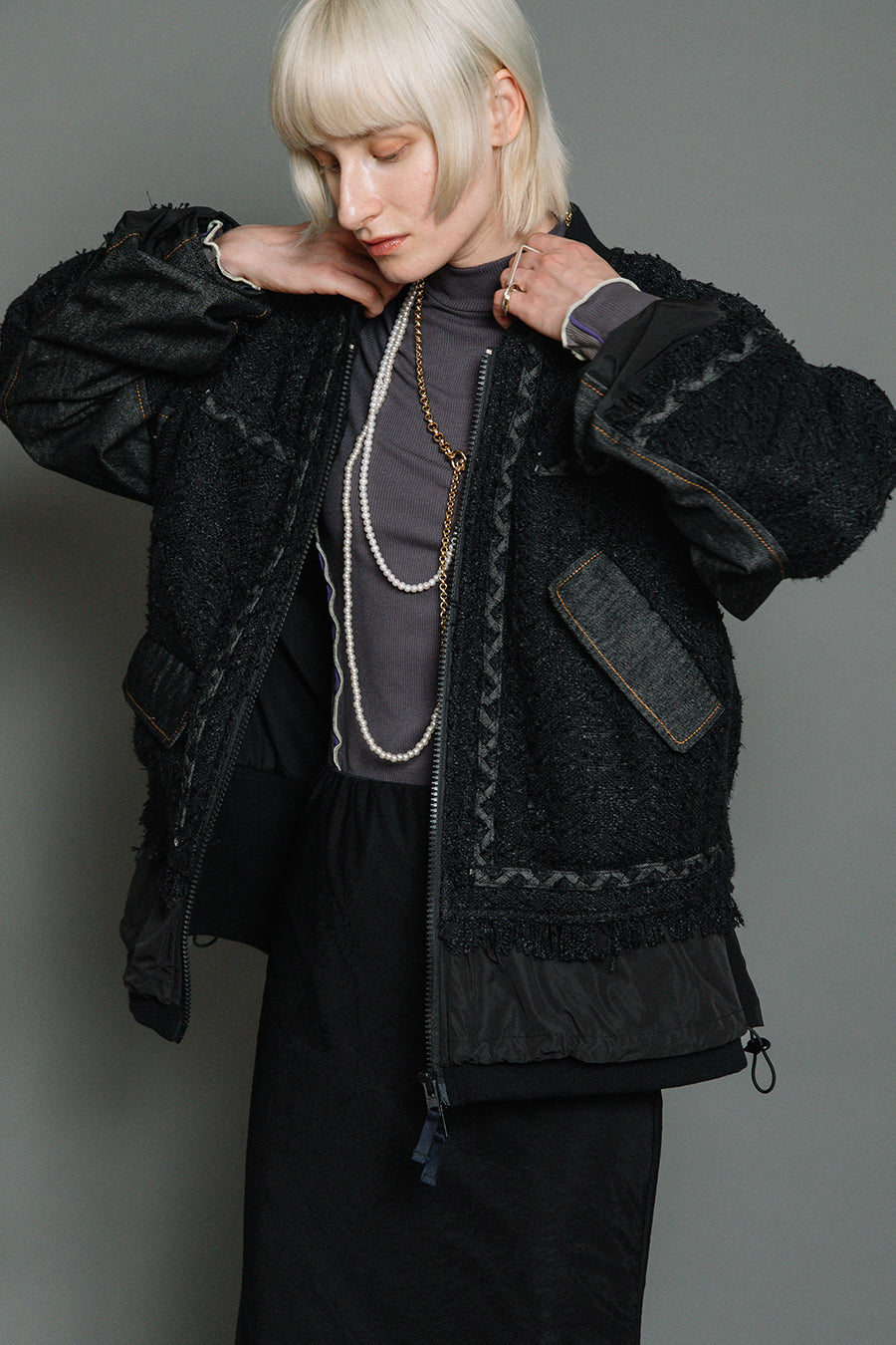 中綿入りツイード、デニム、タフタの異素材のコンビネーションブルゾン。