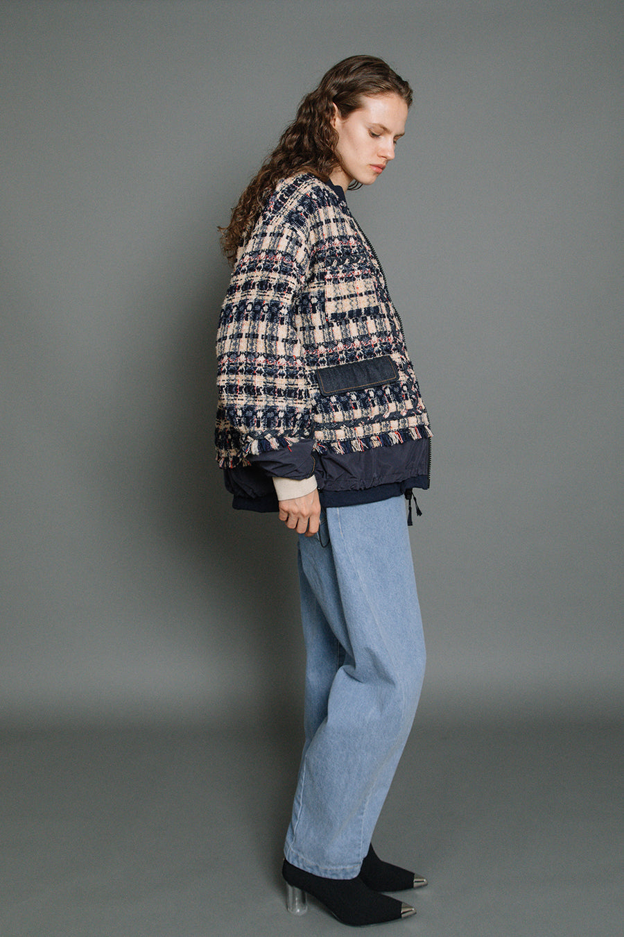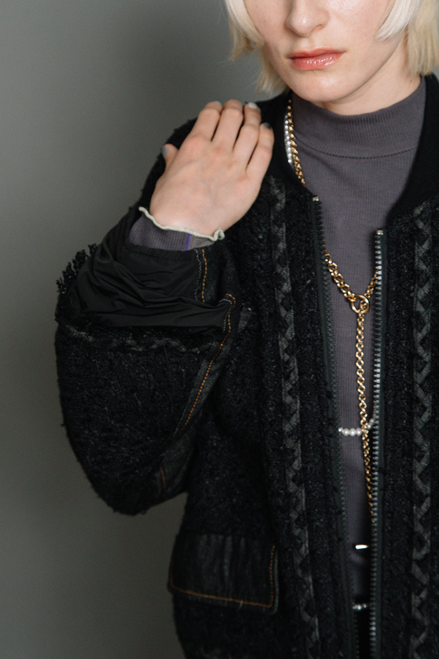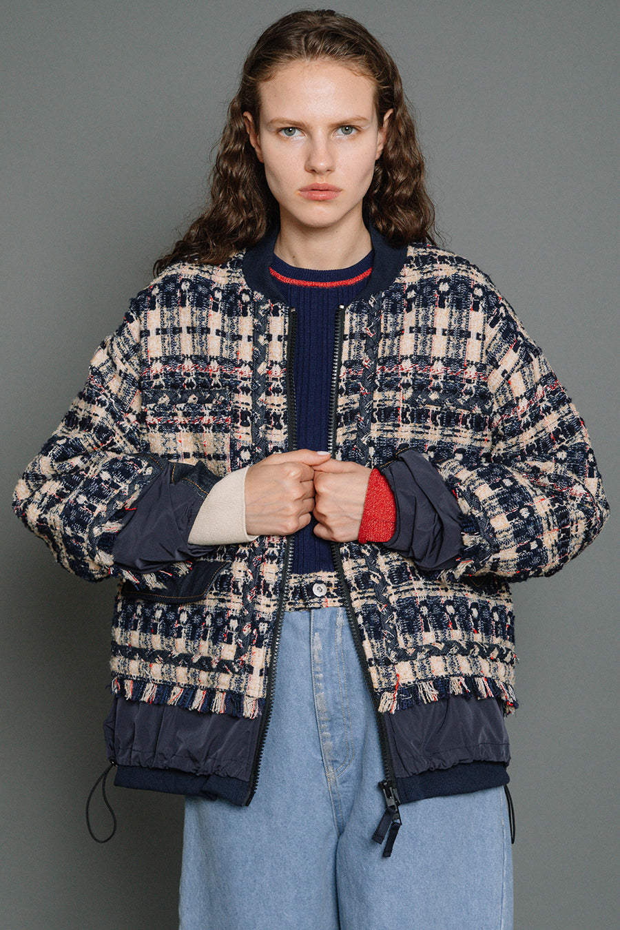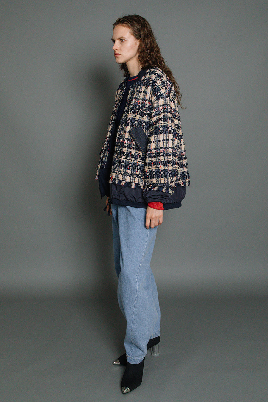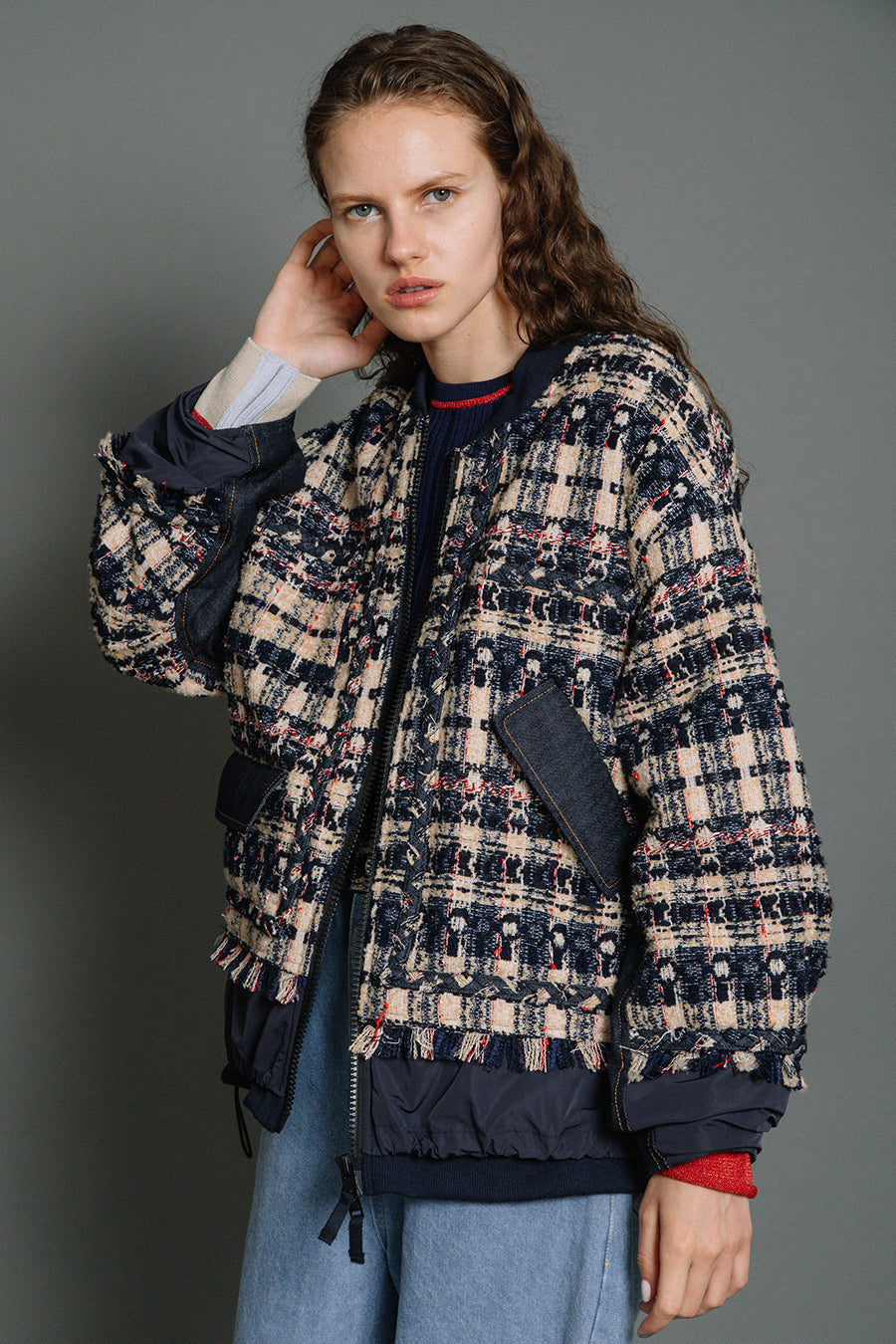 中綿入りツイード、デニム、タフタの異素材のコンビネーションブルゾン。