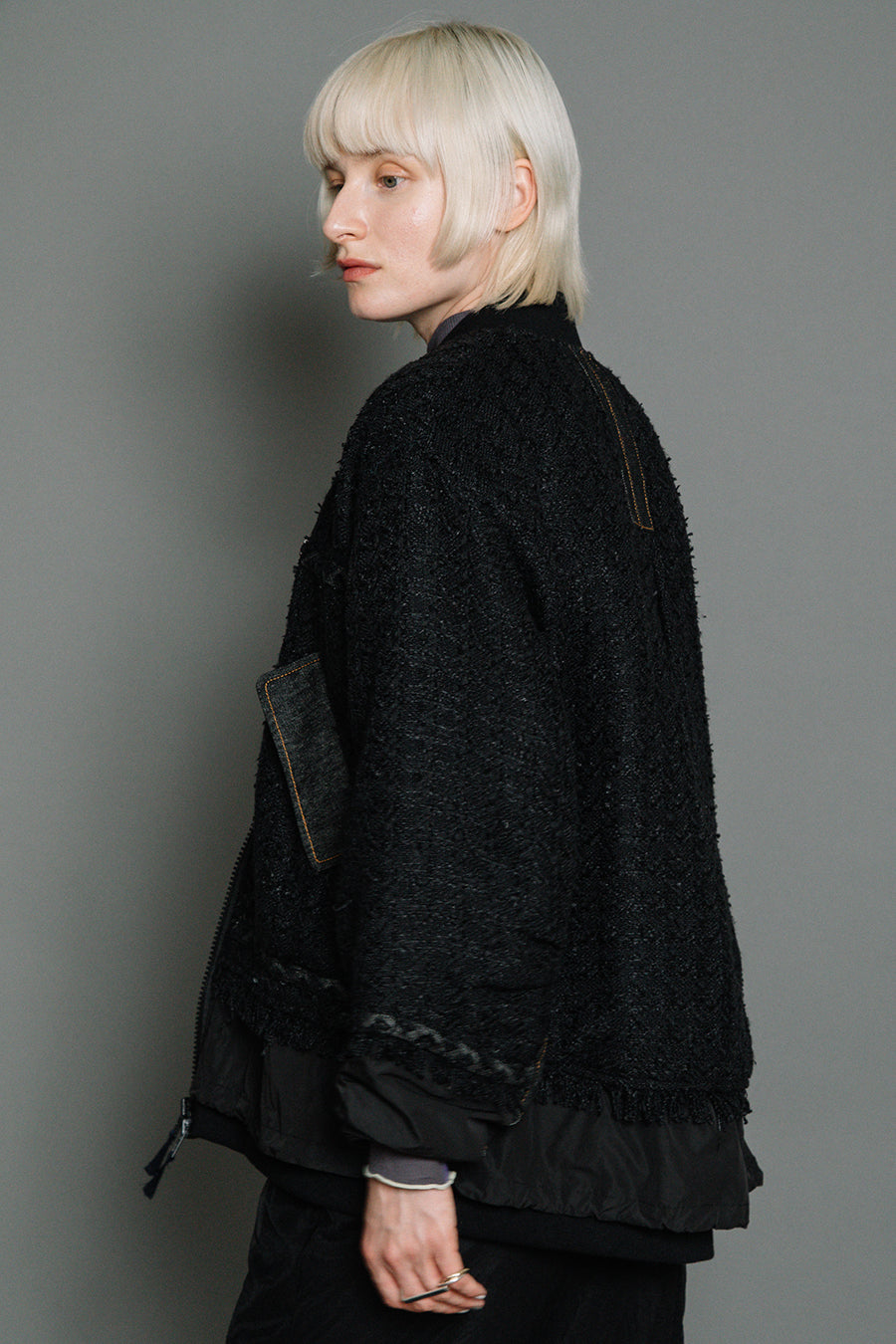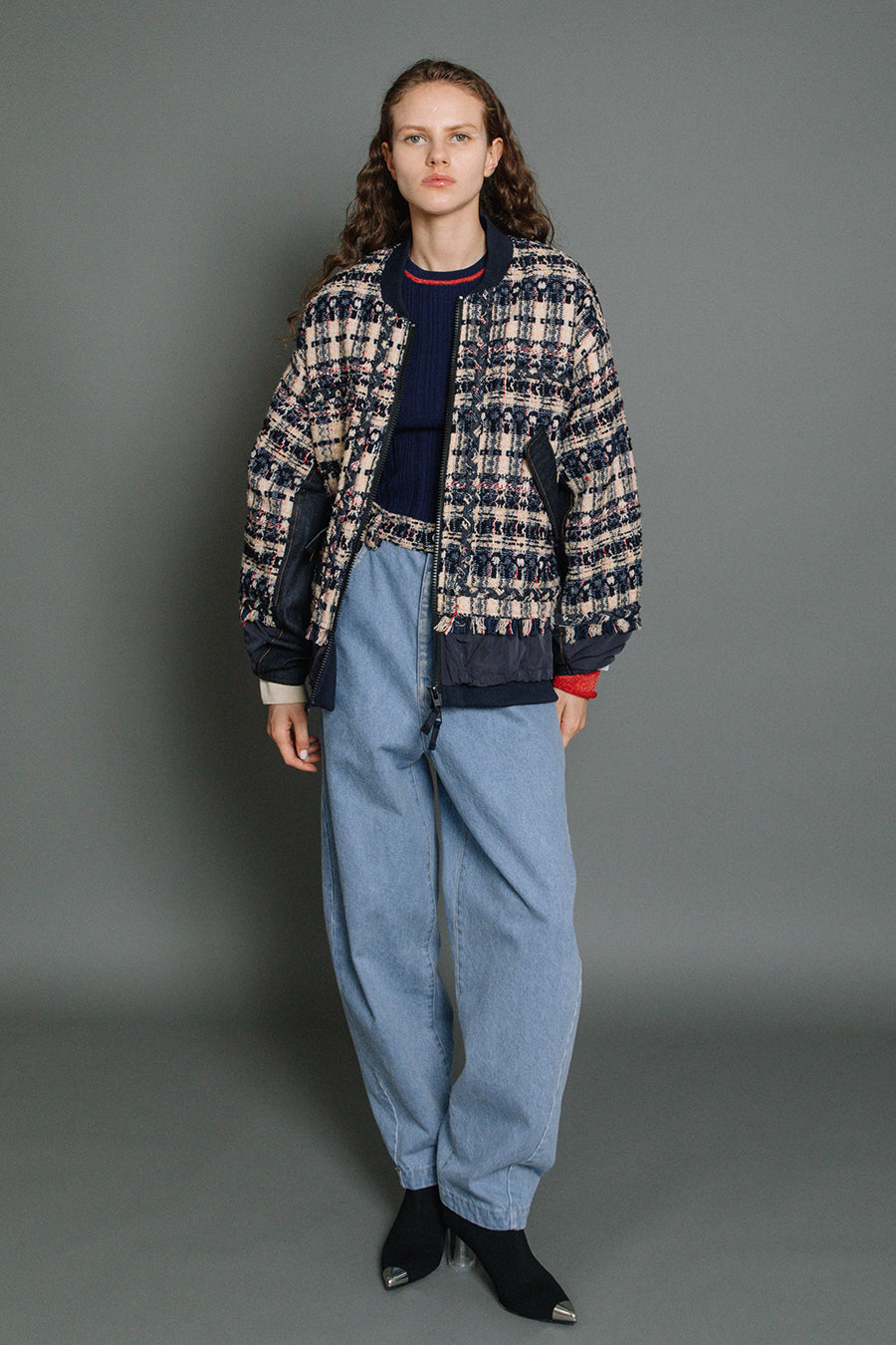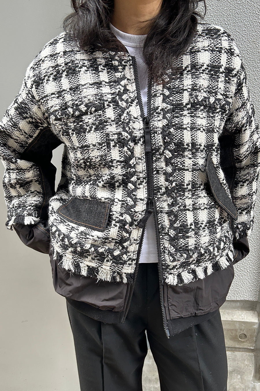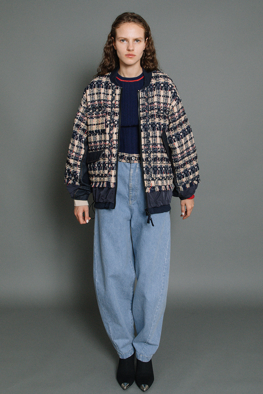 中綿入りツイード、デニム、タフタの異素材のコンビネーションブルゾン。