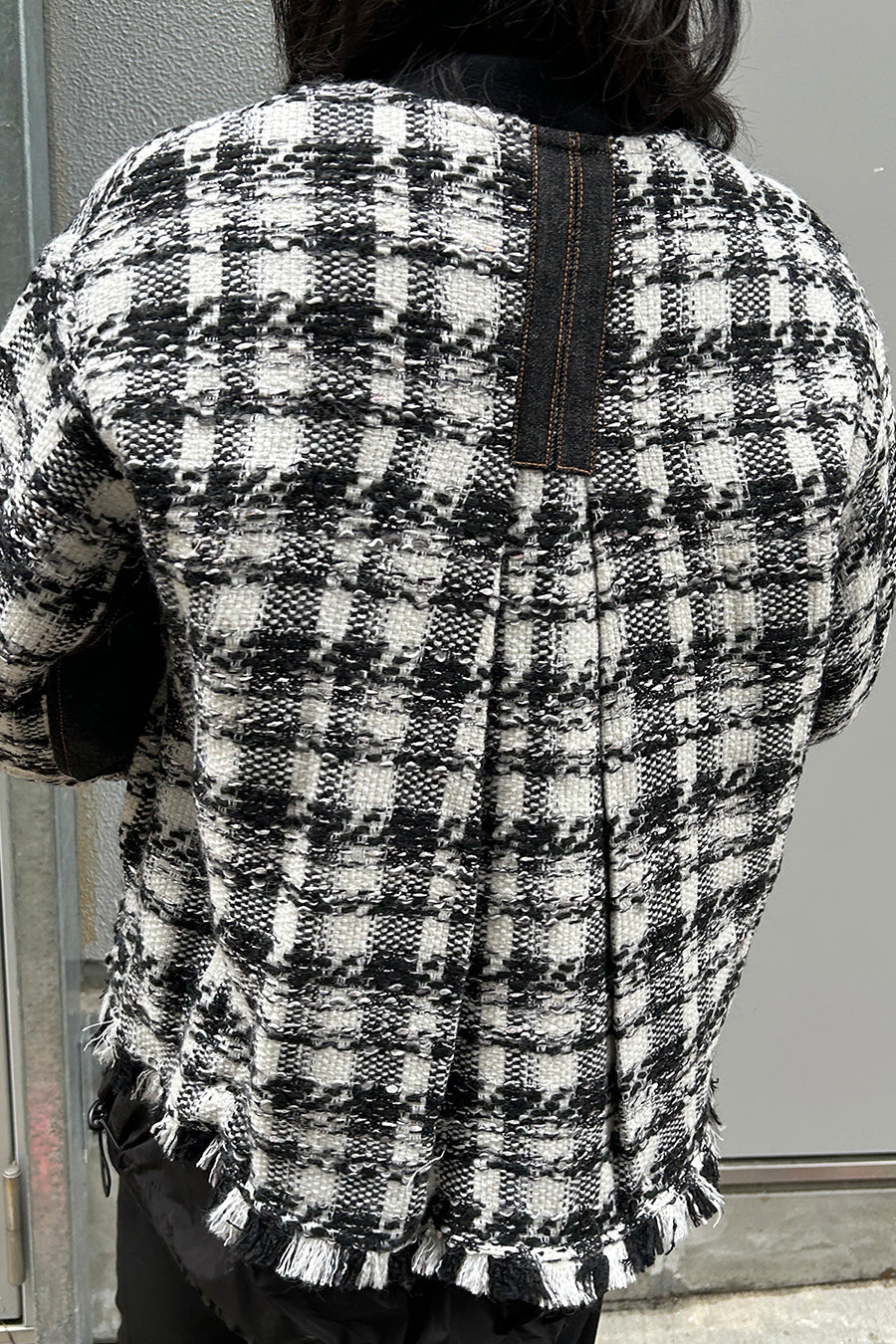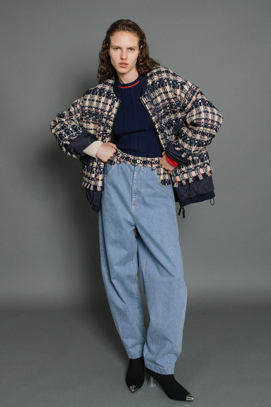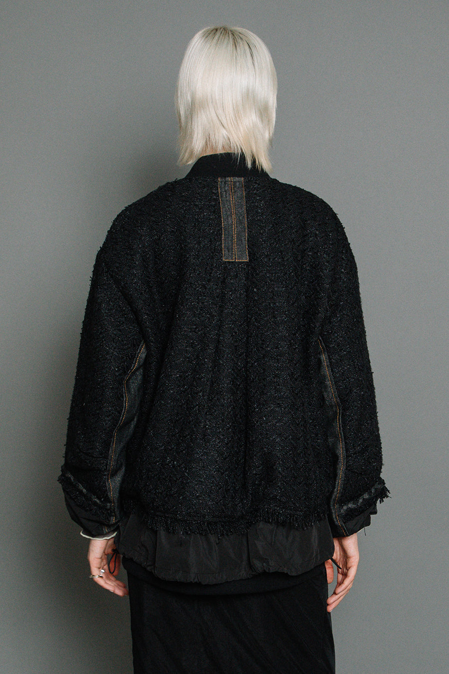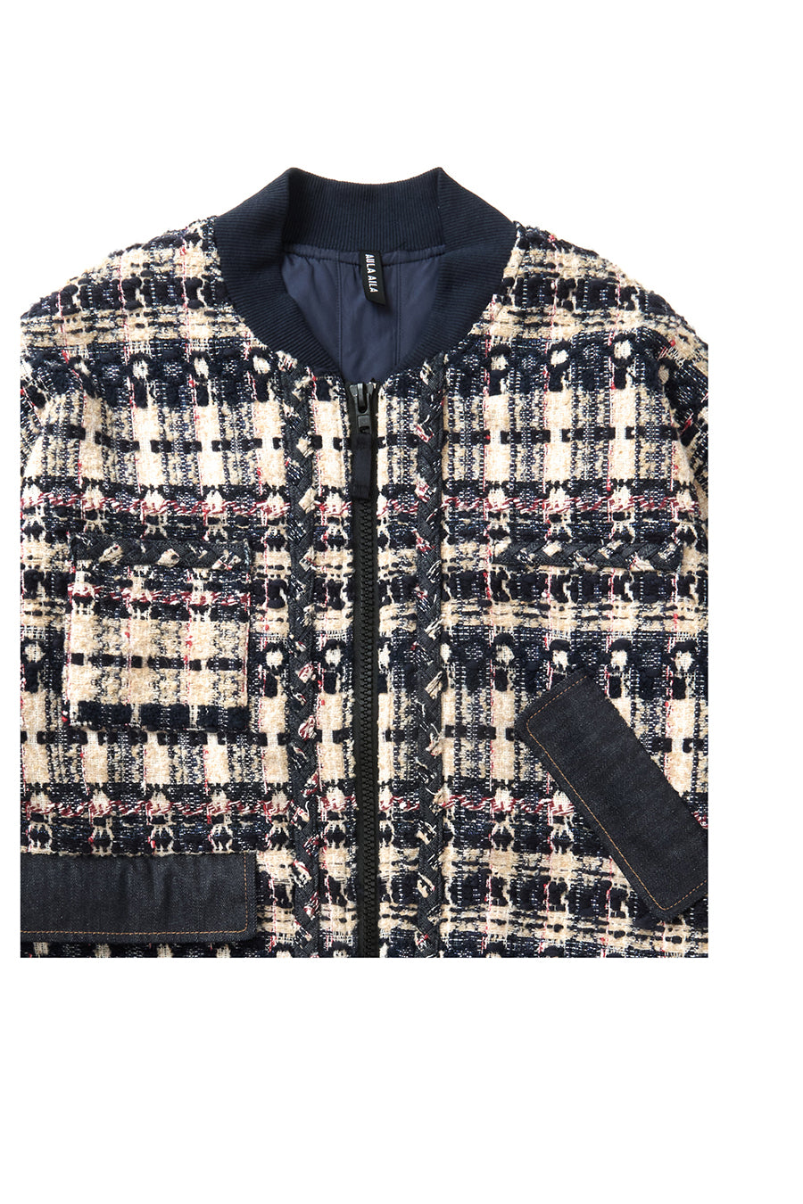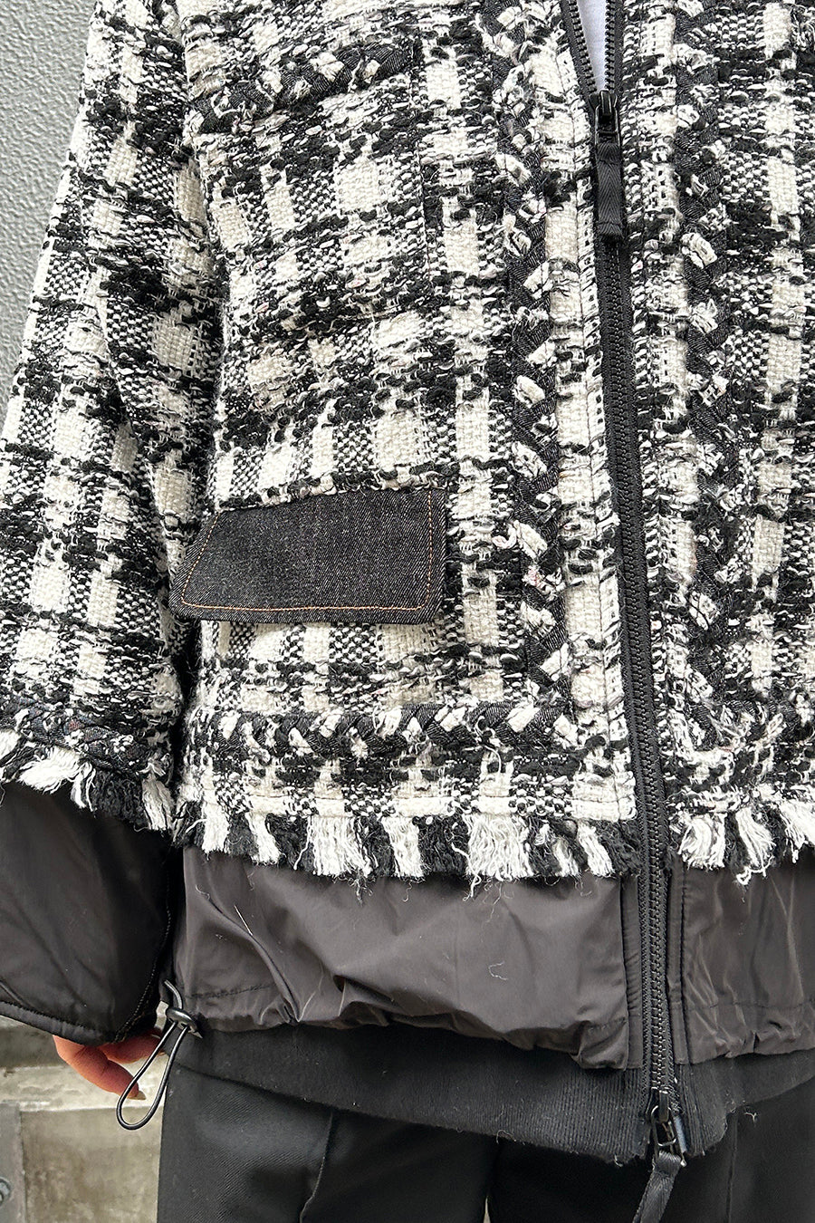 中綿入りツイード、デニム、タフタの異素材のコンビネーションブルゾン。