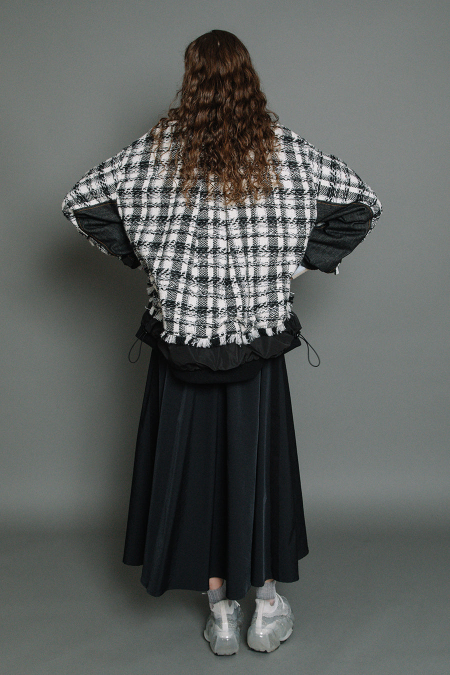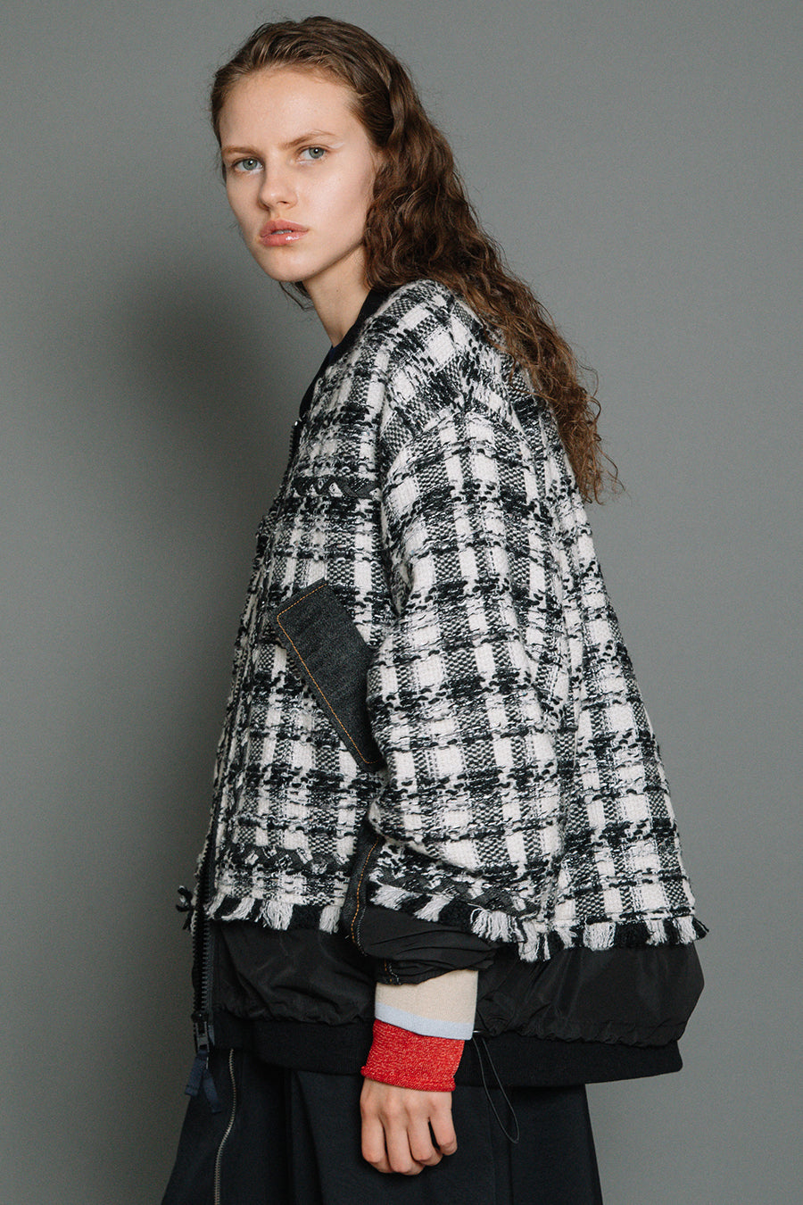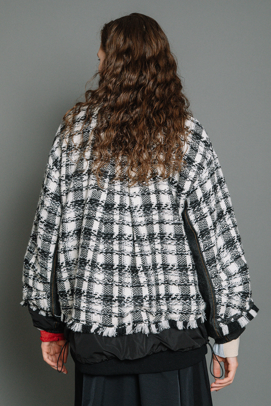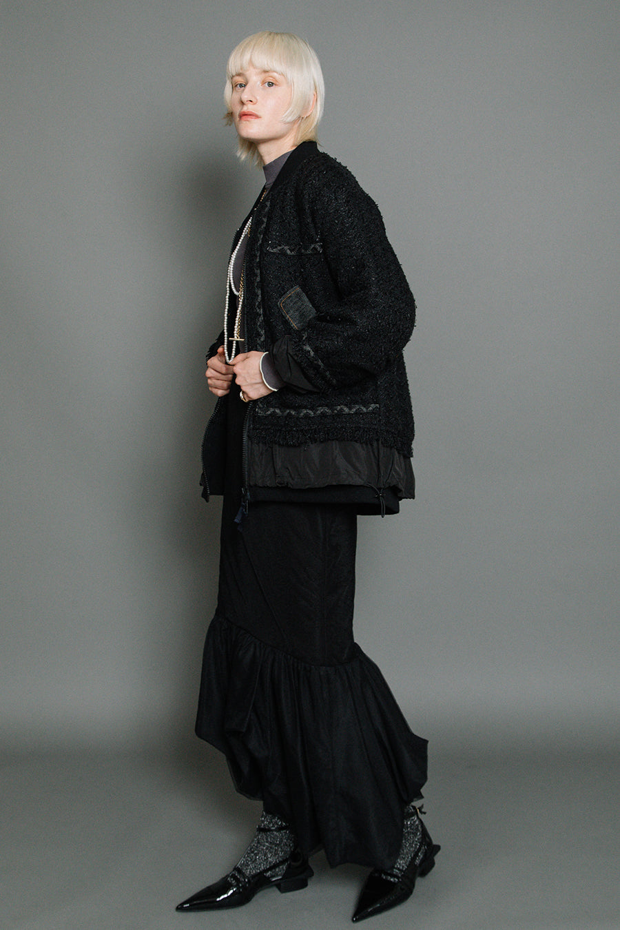 中綿入りツイード、デニム、タフタの異素材のコンビネーションブルゾン。