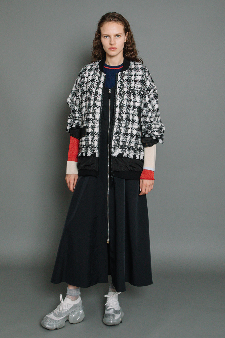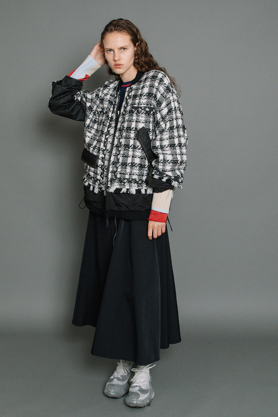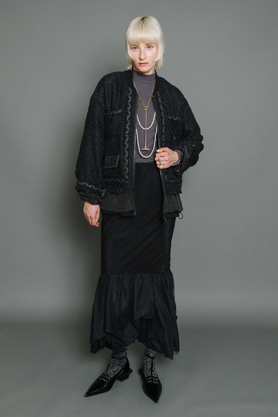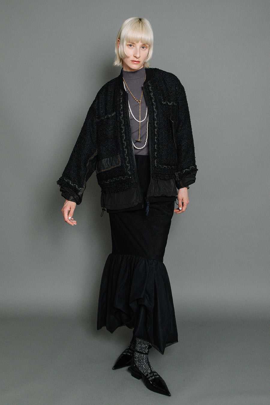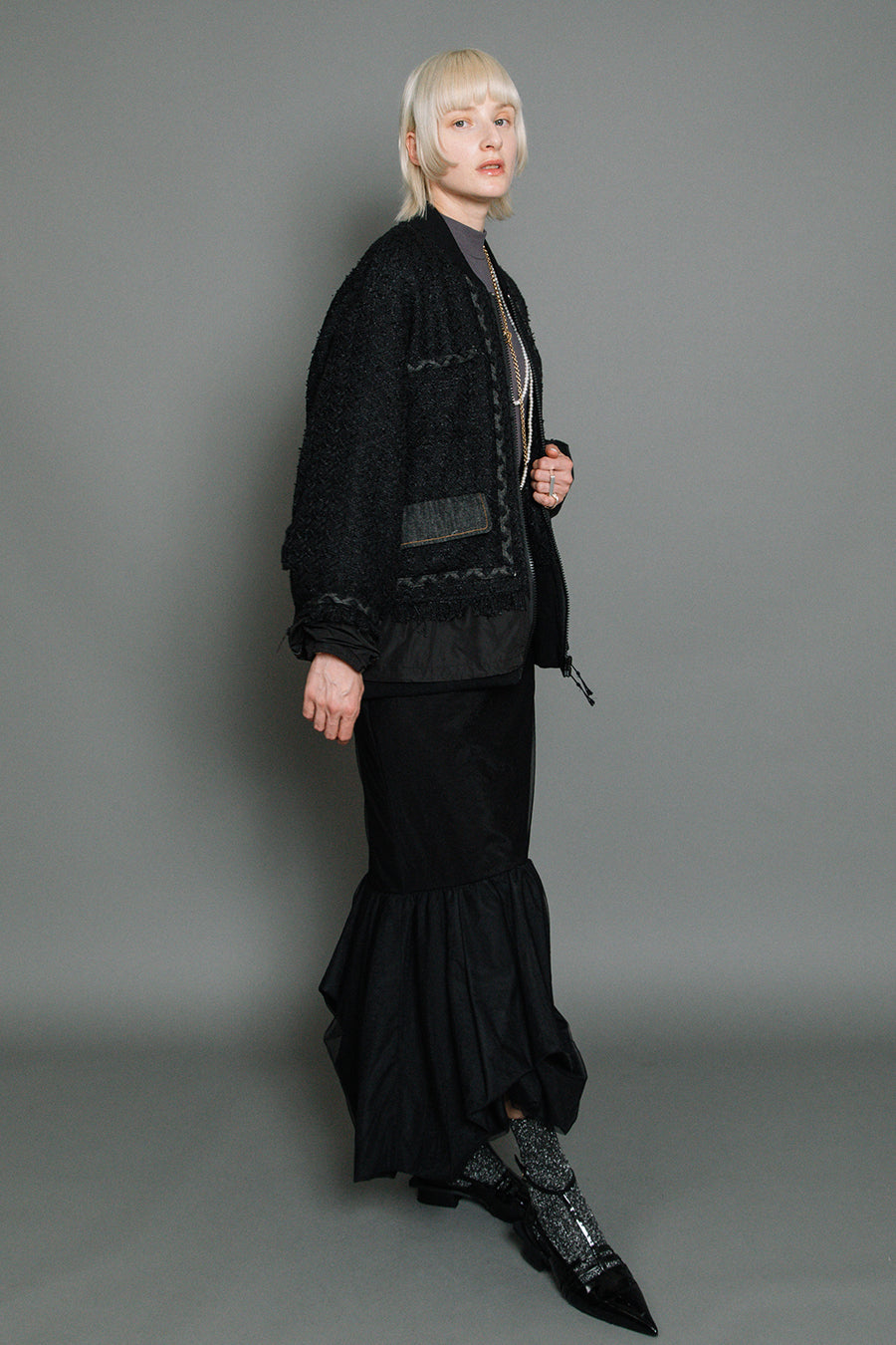 中綿入りツイード、デニム、タフタの異素材のコンビネーションブルゾン。
