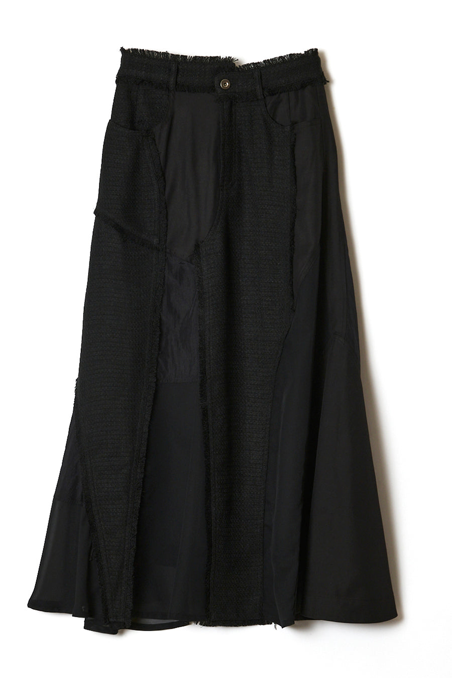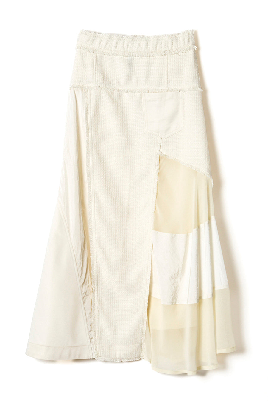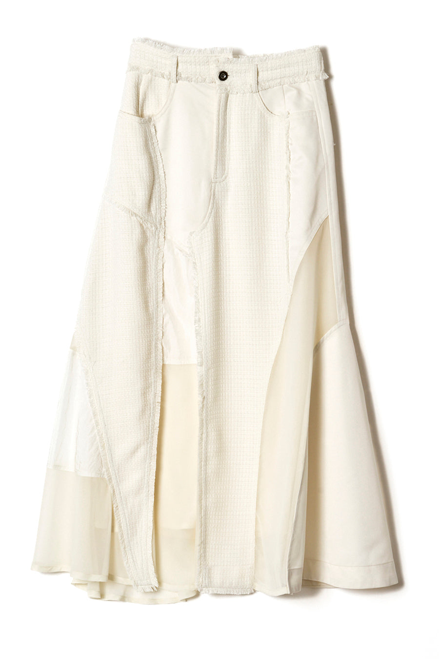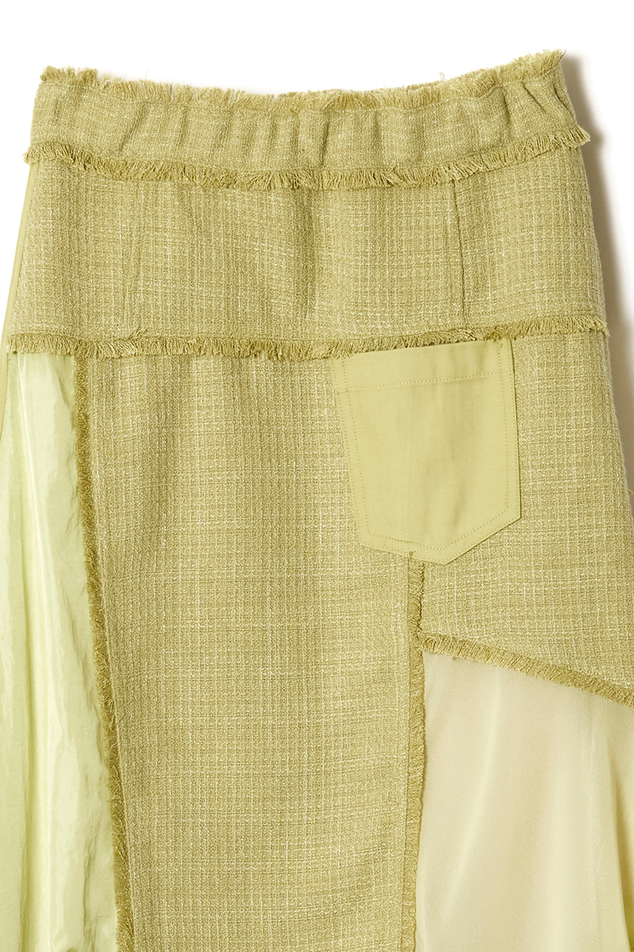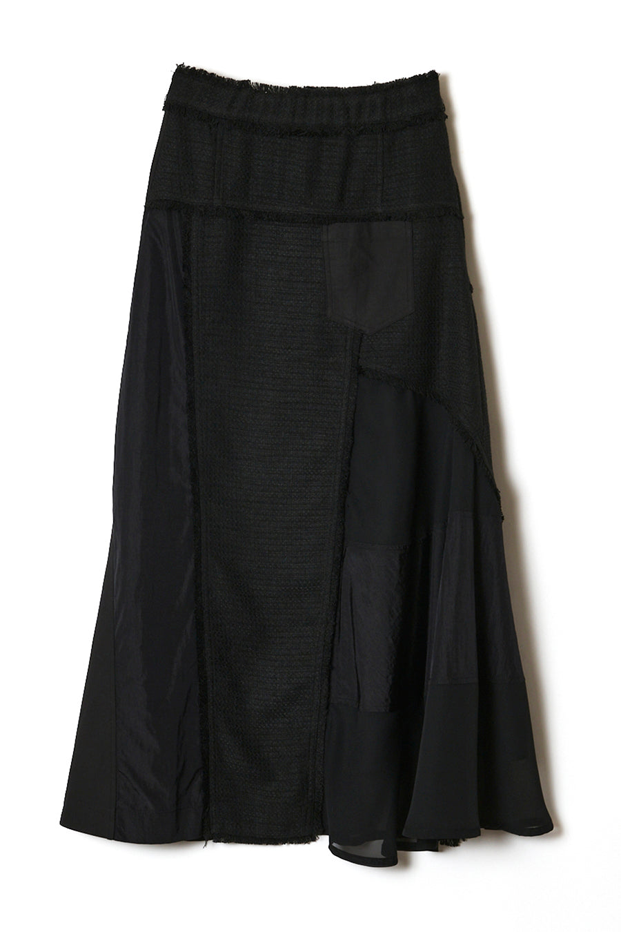 サマーツイード、ナイロンツイル、タフタ、シフォンの4素材をコンビネーションしたフレアースカート。エレガントに見えがちなツイードをナイロンツイルと掛け合わせることでエッジの効いたモードな印象に。表情の違う生地を切り替えた、他にはないアシンメトリーデザイン。夏にも着れるサマーツイードとシフォンやタフタを組み合わせることでシアー感のある軽やかなスカートに仕上がっている。ロングシーズン着用可能な生地感で、