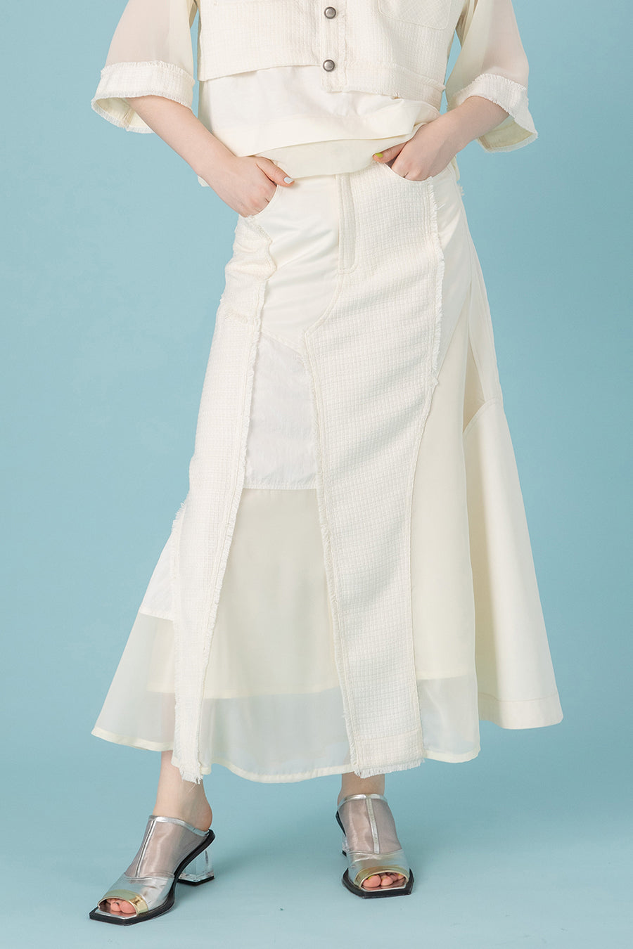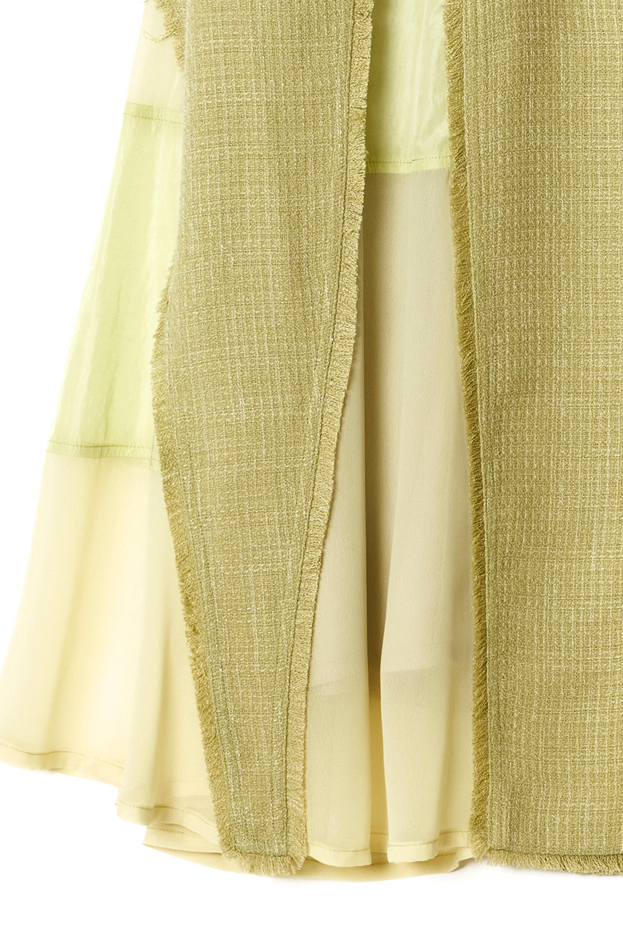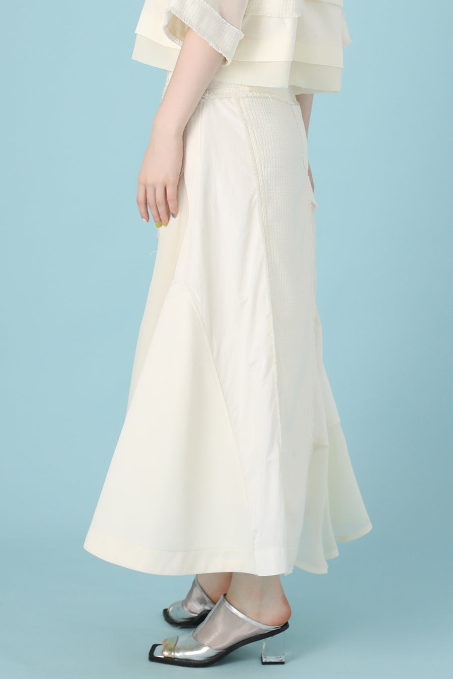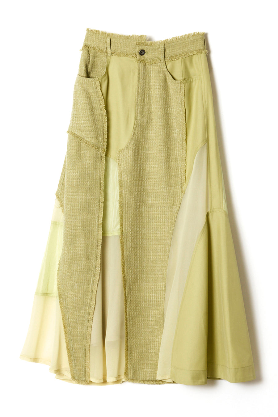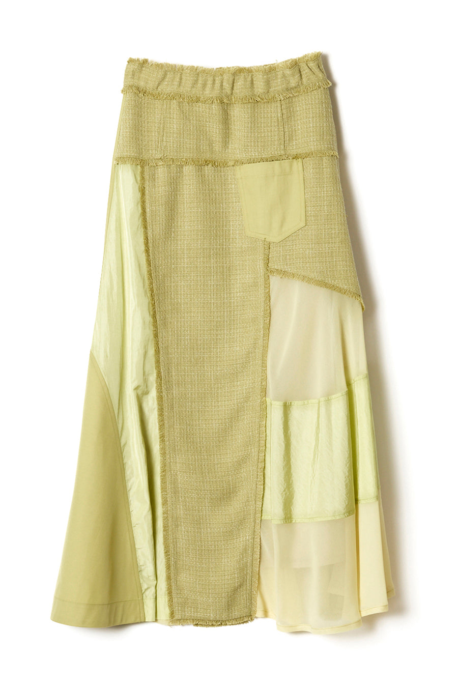 サマーツイード、ナイロンツイル、タフタ、シフォンの4素材をコンビネーションしたフレアースカート。エレガントに見えがちなツイードをナイロンツイルと掛け合わせることでエッジの効いたモードな印象に。表情の違う生地を切り替えた、他にはないアシンメトリーデザイン。夏にも着れるサマーツイードとシフォンやタフタを組み合わせることでシアー感のある軽やかなスカートに仕上がっている。ロングシーズン着用可能な生地感で、
