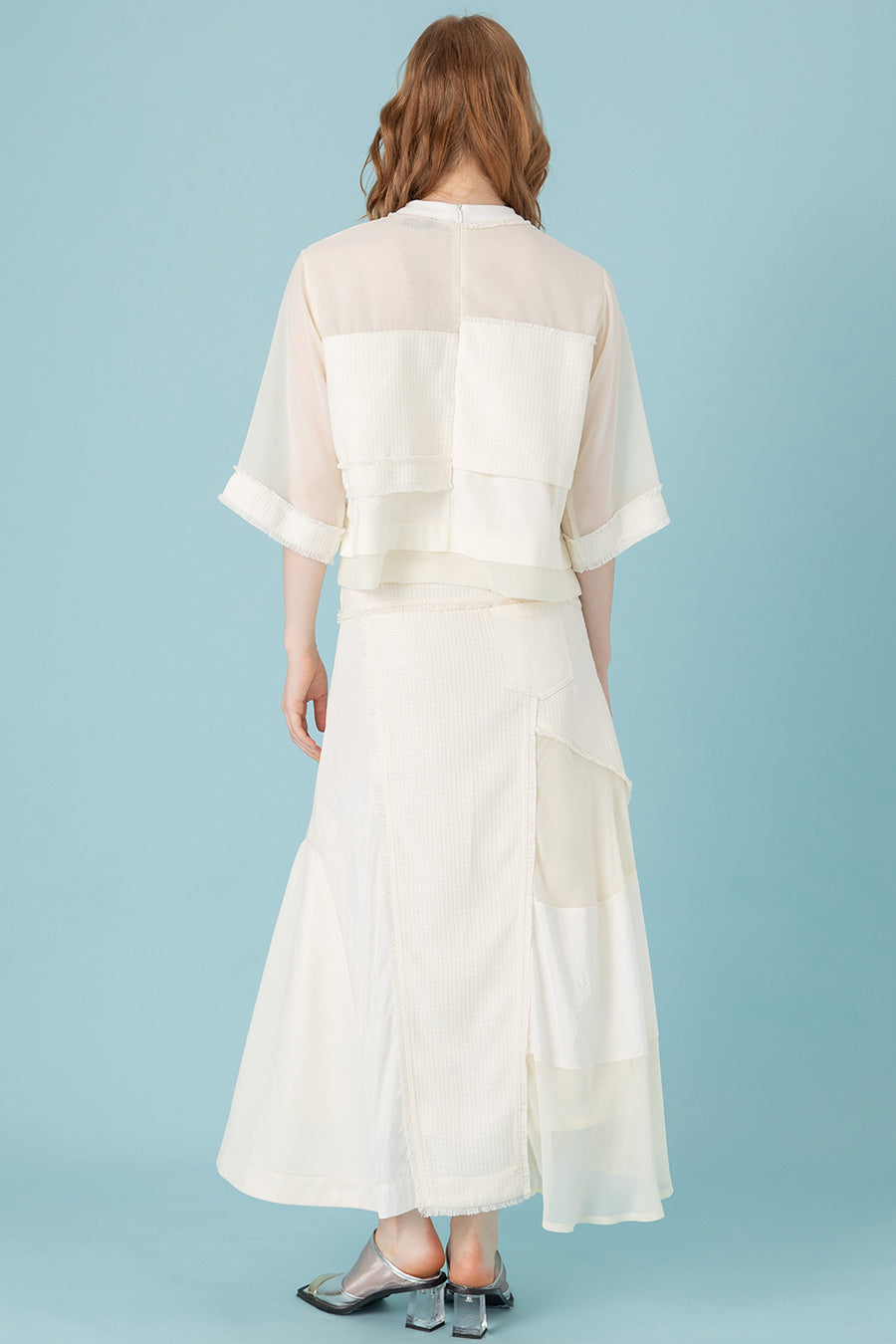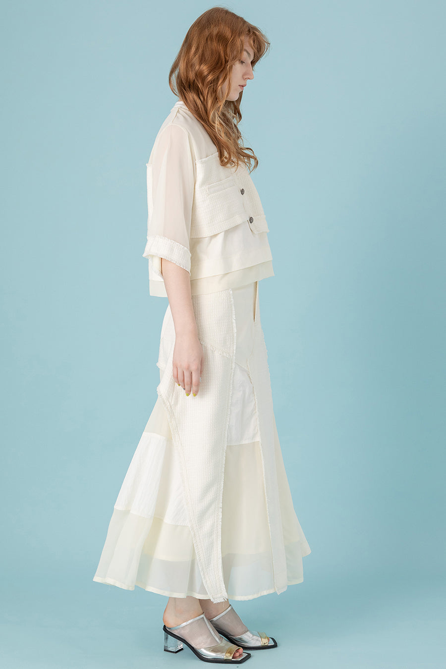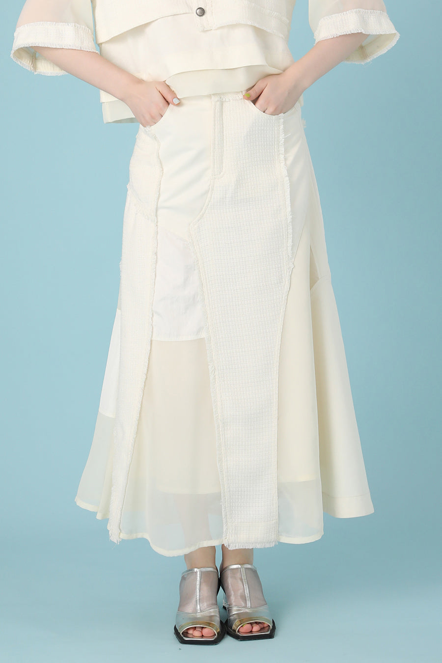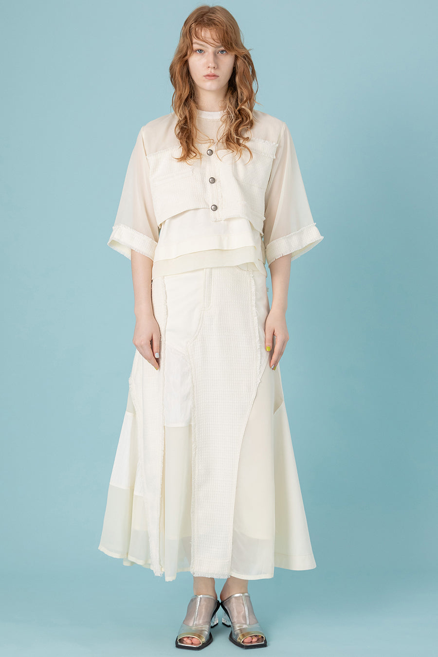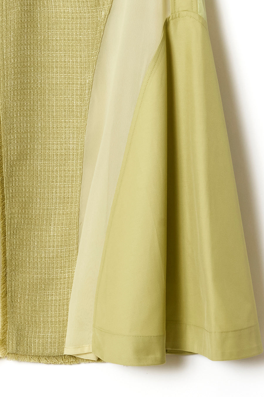 サマーツイード、ナイロンツイル、タフタ、シフォンの4素材をコンビネーションしたフレアースカート。エレガントに見えがちなツイードをナイロンツイルと掛け合わせることでエッジの効いたモードな印象に。表情の違う生地を切り替えた、他にはないアシンメトリーデザイン。夏にも着れるサマーツイードとシフォンやタフタを組み合わせることでシアー感のある軽やかなスカートに仕上がっている。ロングシーズン着用可能な生地感で、