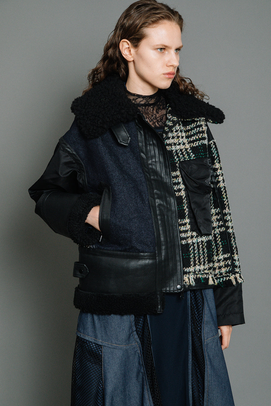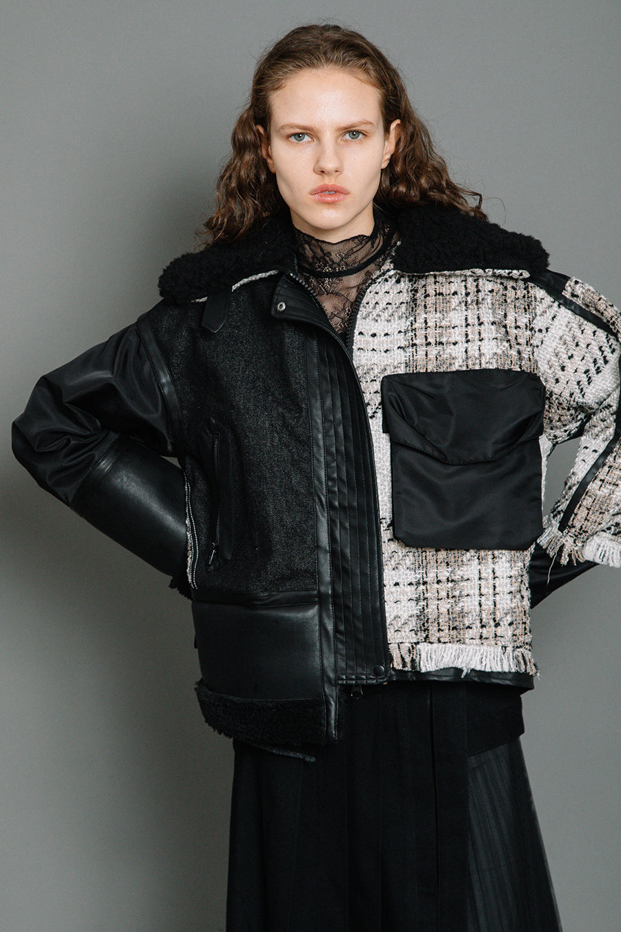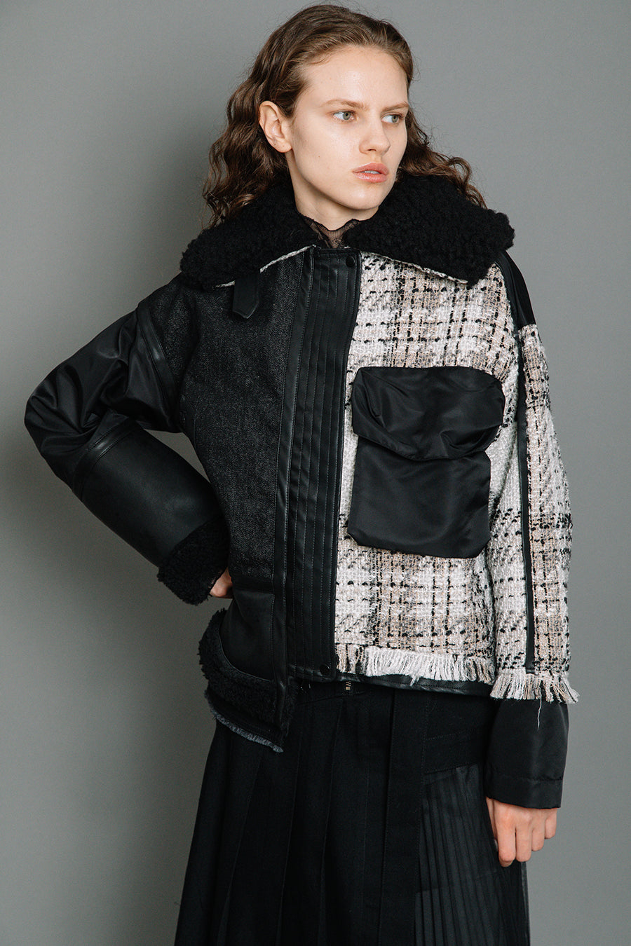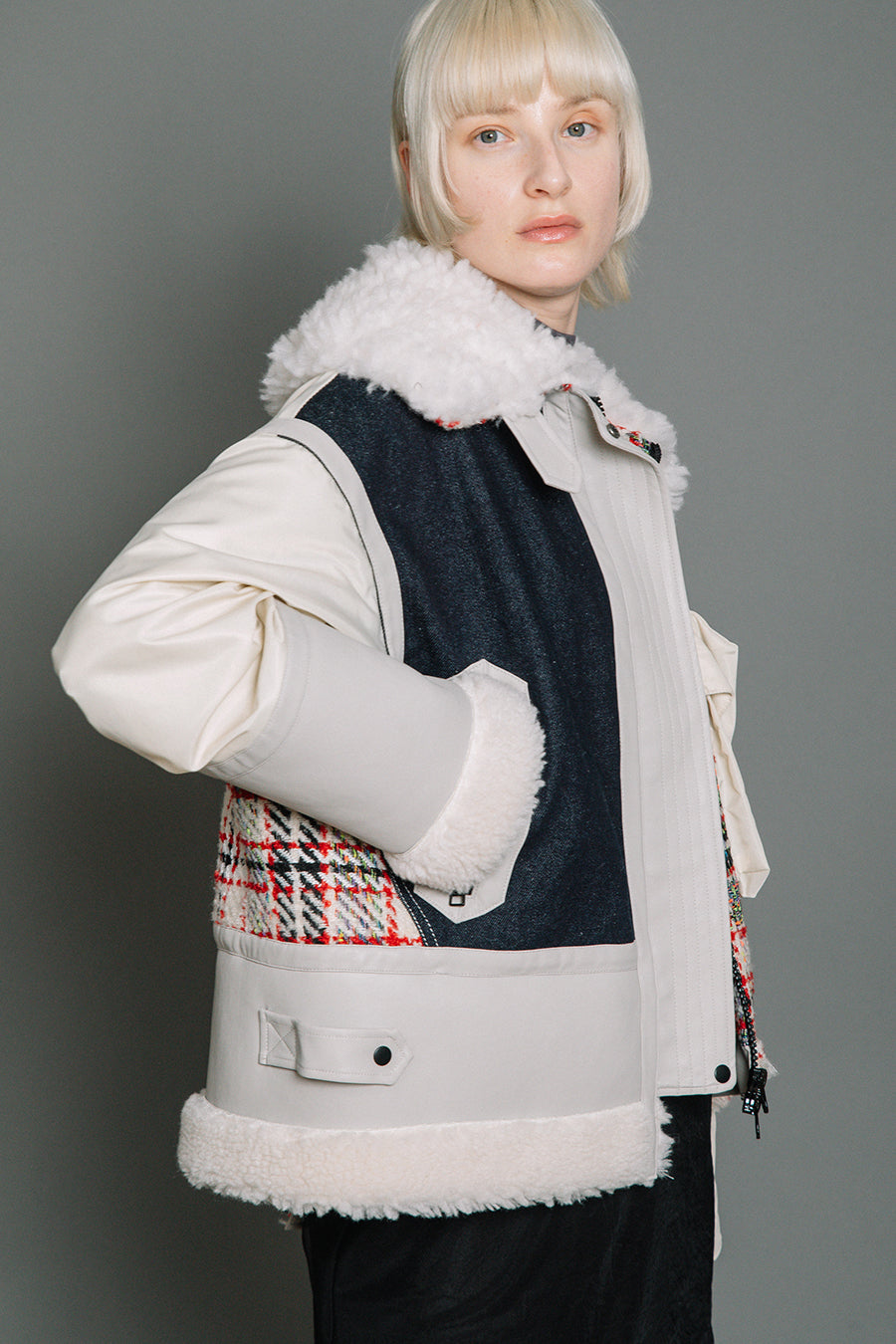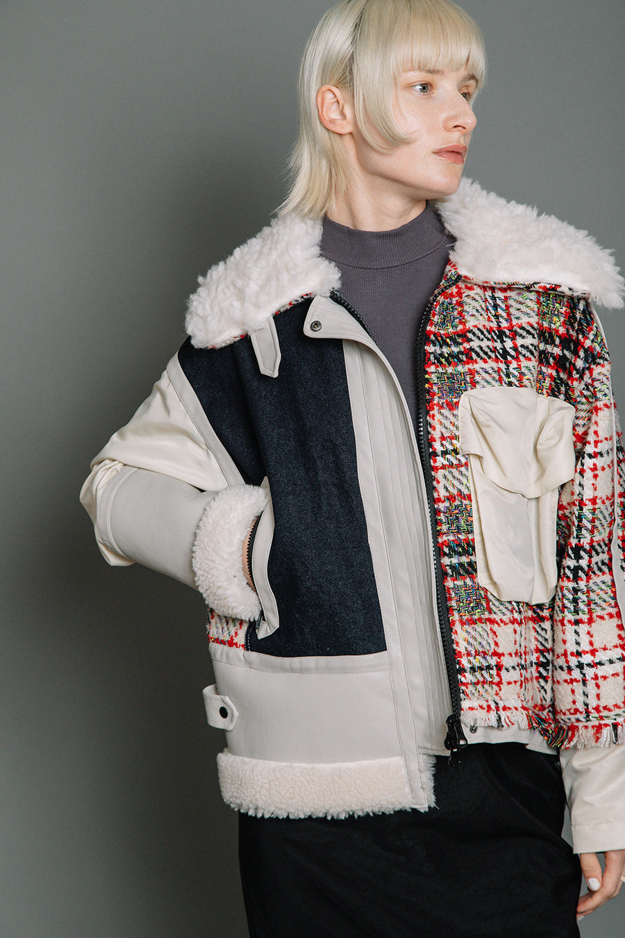 今シーズンは、ツイード、デニム、レザーボアムートン、エコレザー、ファー、ナイロンツイルの6素材を使用し、右見頃はB-3風ボンバーブルゾン、左前身頃は立体ビッグポケット付きツイードブルゾン。