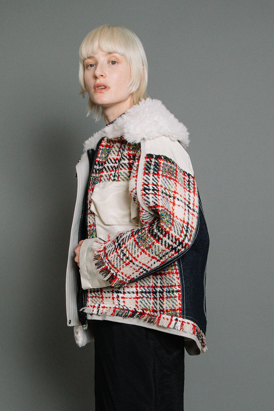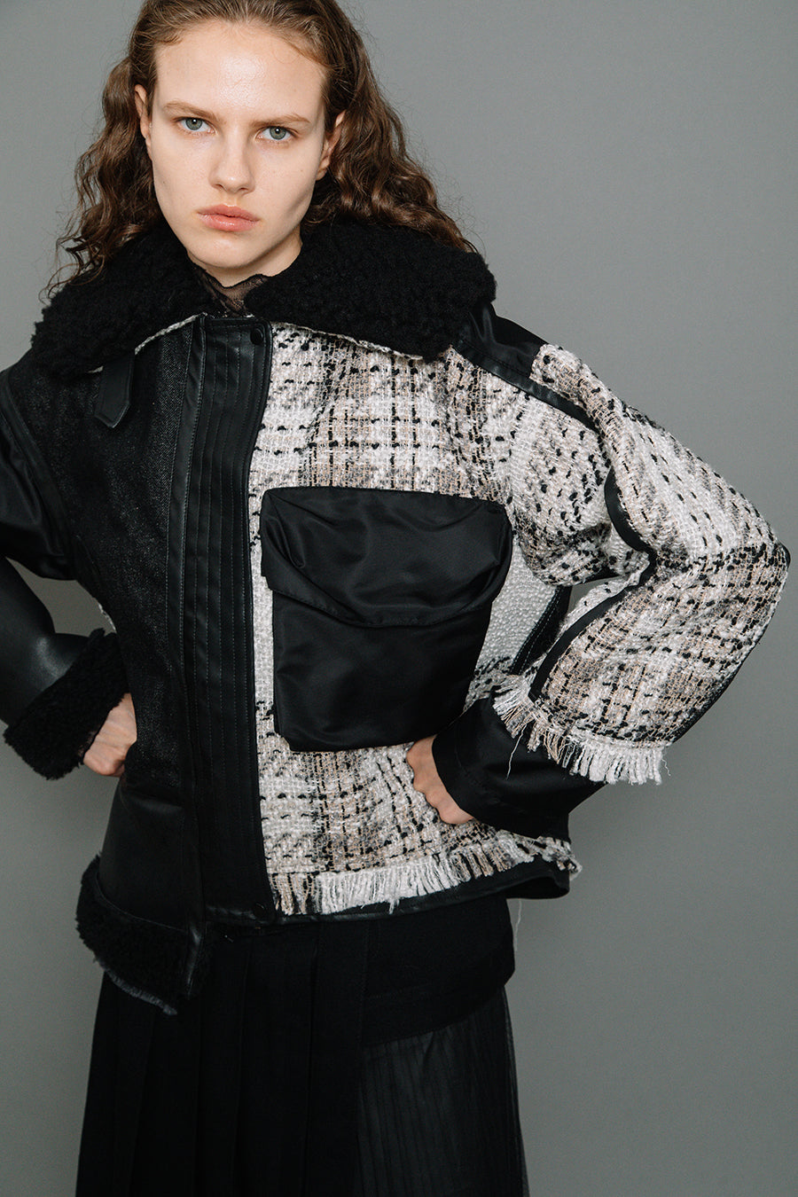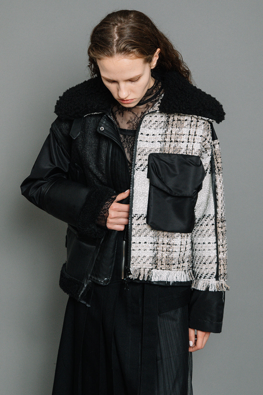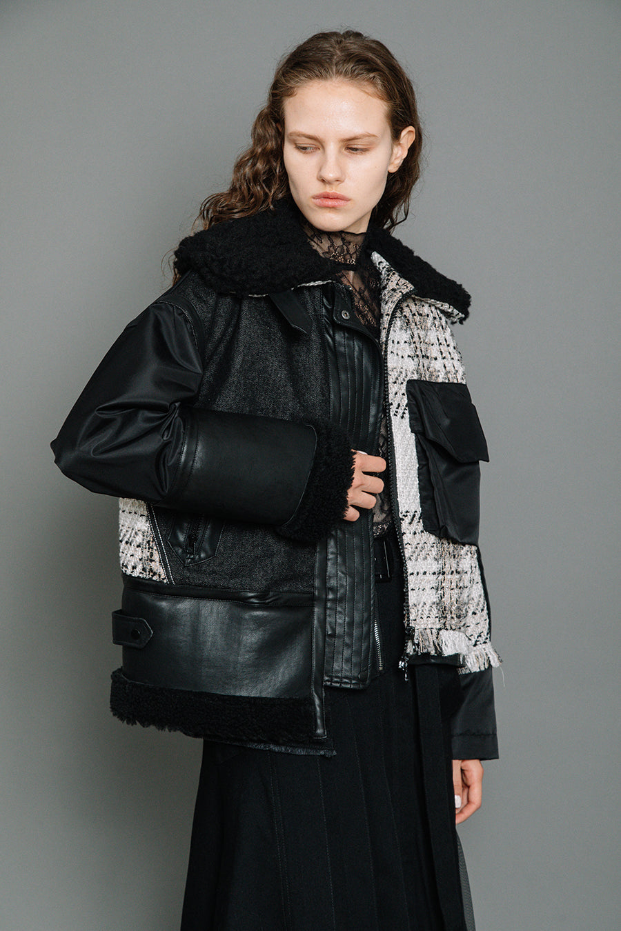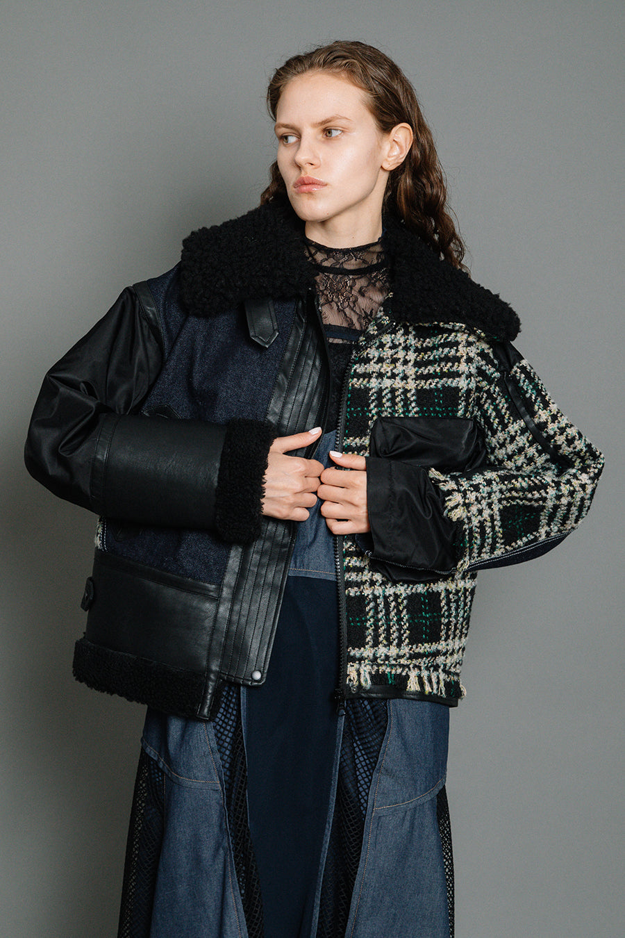 今シーズンは、ツイード、デニム、レザーボアムートン、エコレザー、ファー、ナイロンツイルの6素材を使用し、右見頃はB-3風ボンバーブルゾン、左前身頃は立体ビッグポケット付きツイードブルゾン。
