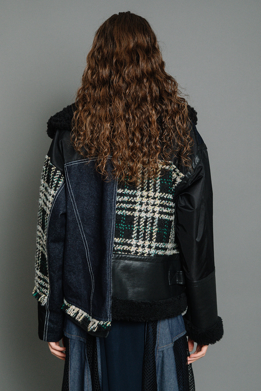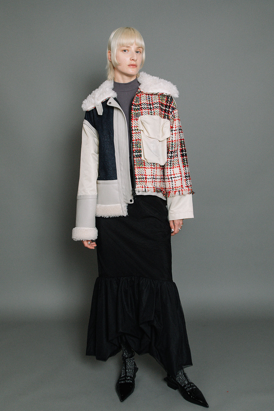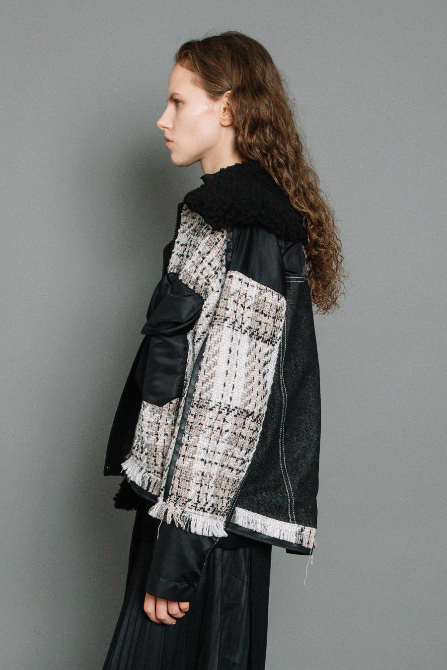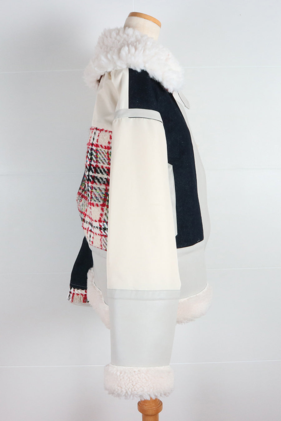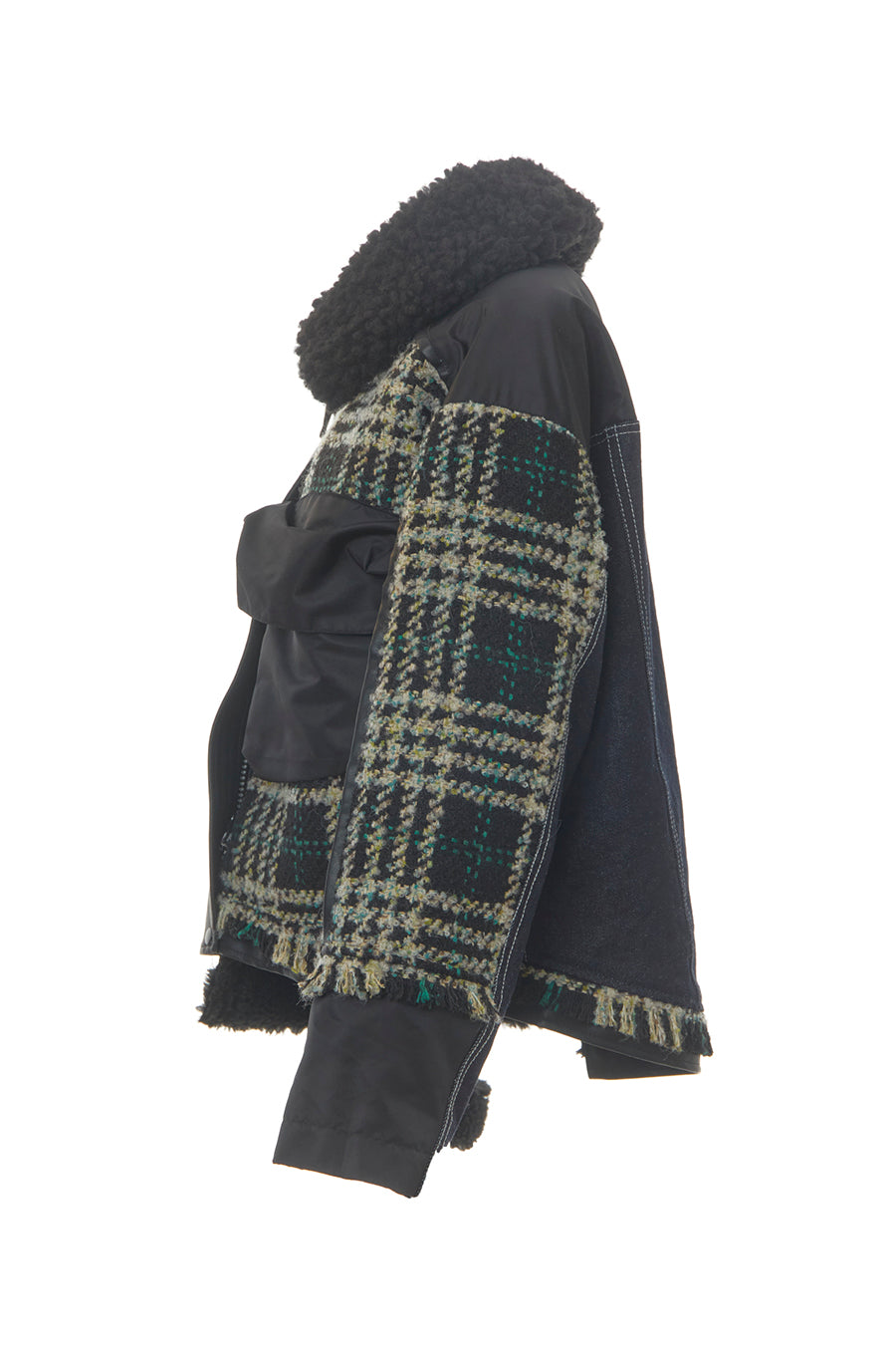 今シーズンは、ツイード、デニム、レザーボアムートン、エコレザー、ファー、ナイロンツイルの6素材を使用し、右見頃はB-3風ボンバーブルゾン、左前身頃は立体ビッグポケット付きツイードブルゾン。