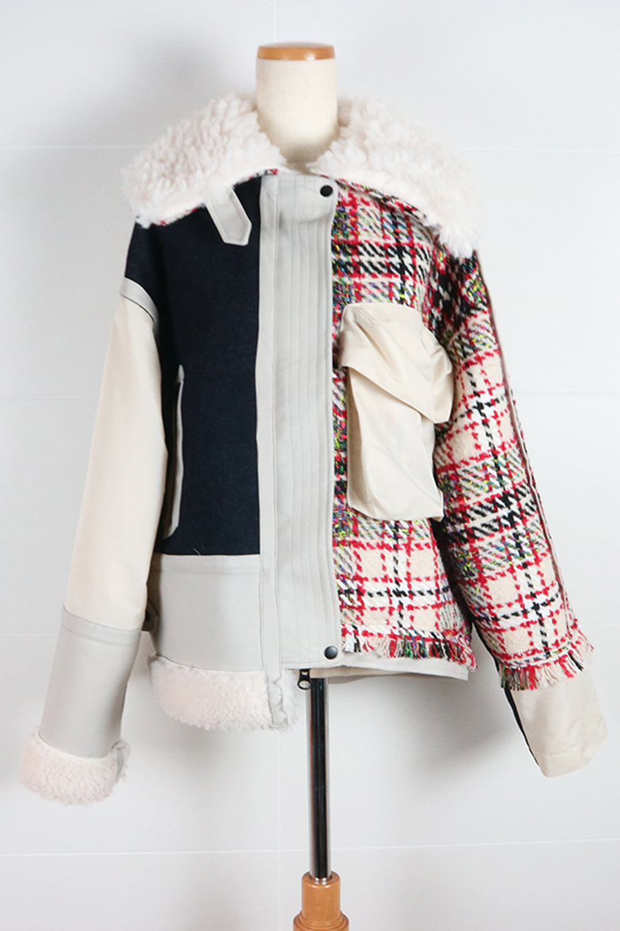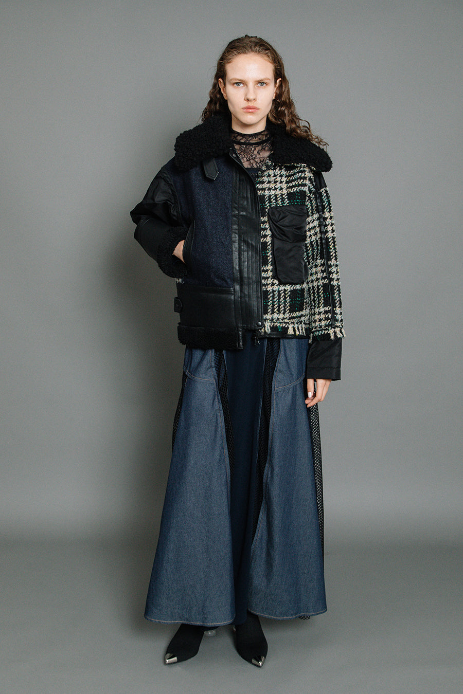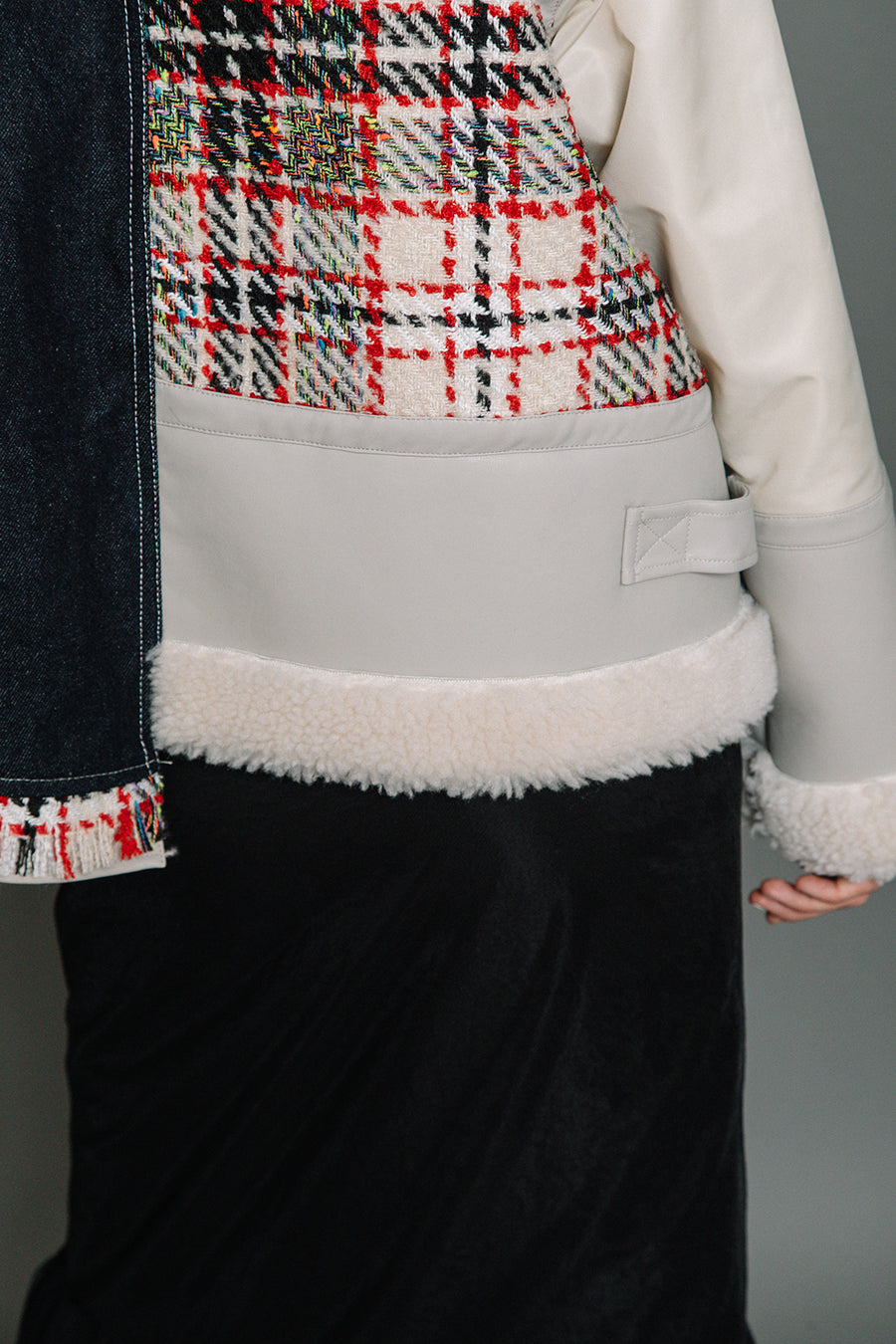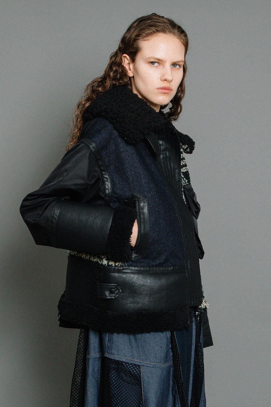 今シーズンは、ツイード、デニム、レザーボアムートン、エコレザー、ファー、ナイロンツイルの6素材を使用し、右見頃はB-3風ボンバーブルゾン、左前身頃は立体ビッグポケット付きツイードブルゾン。