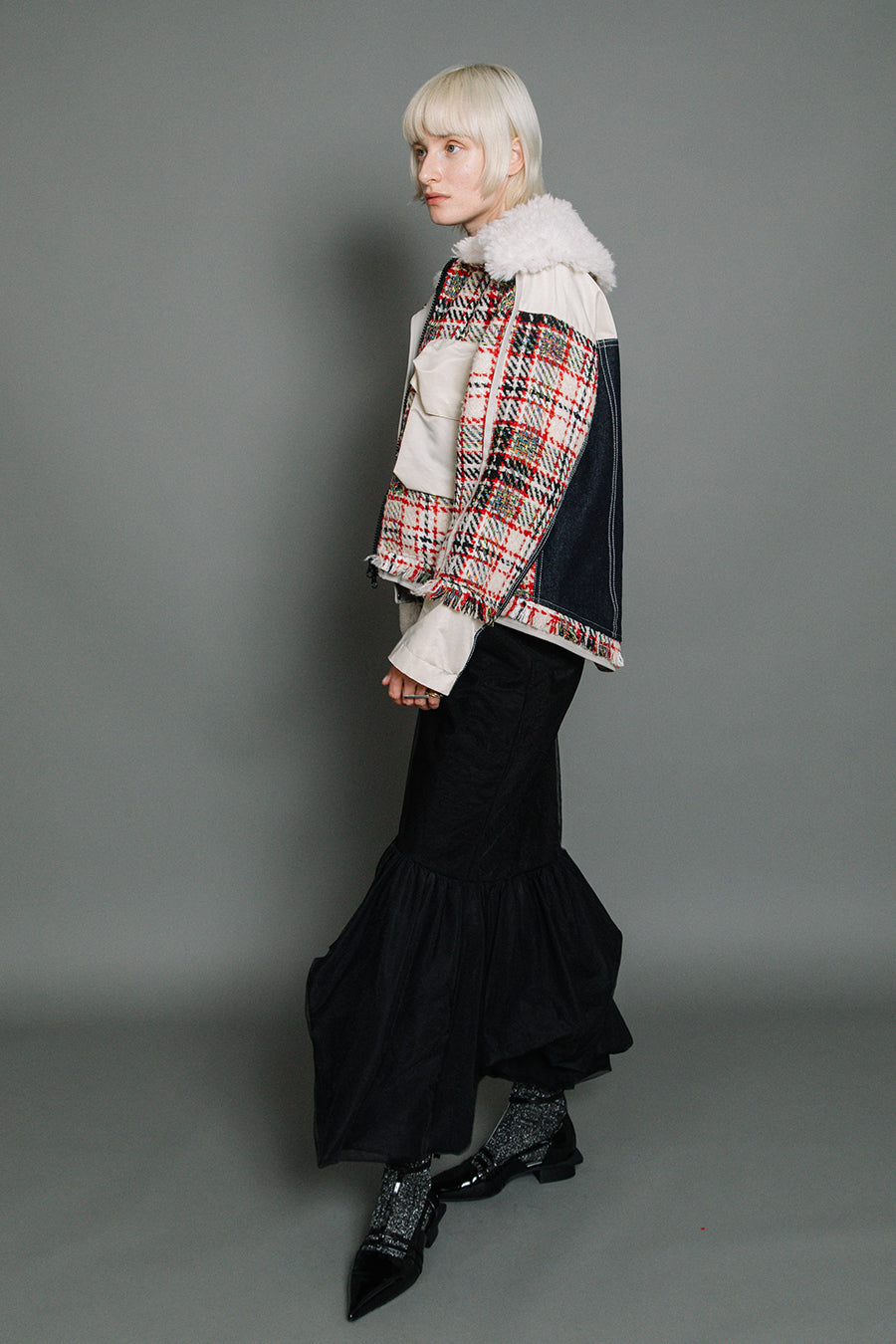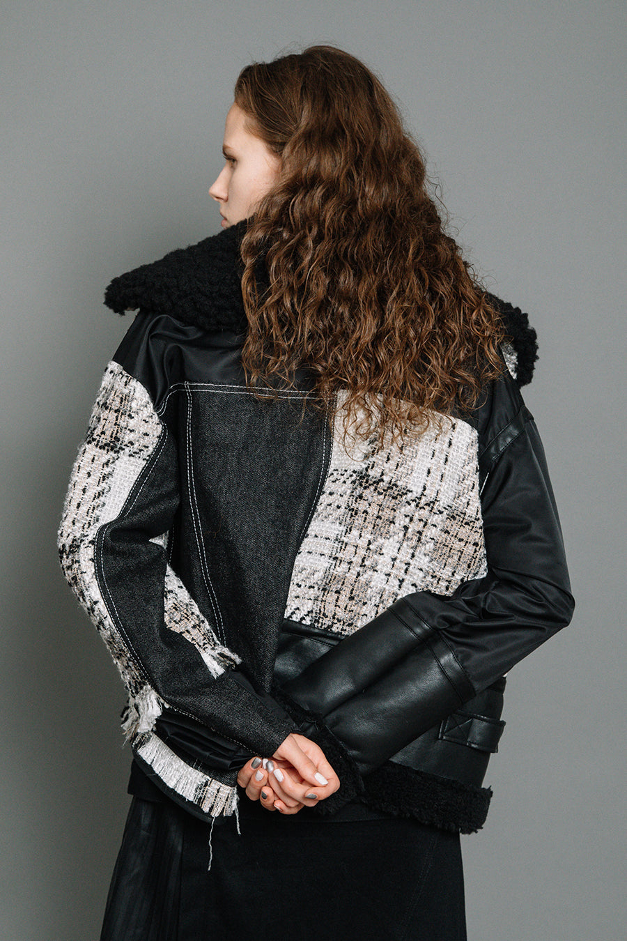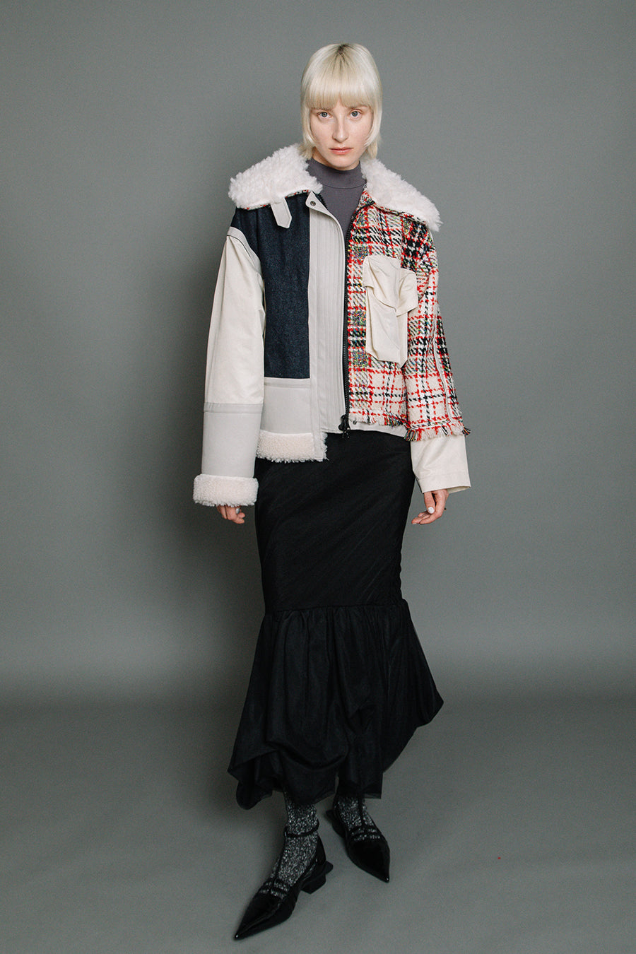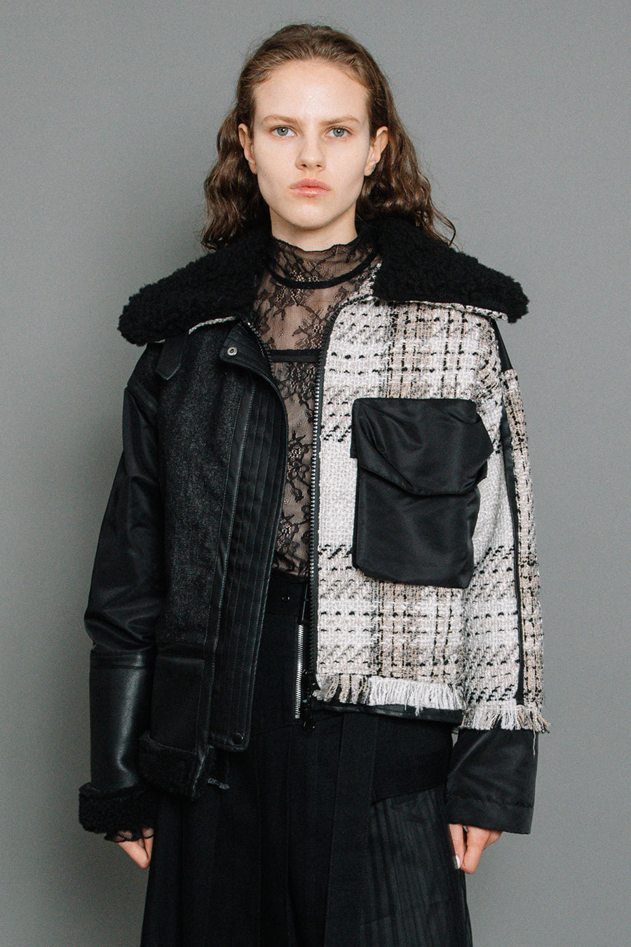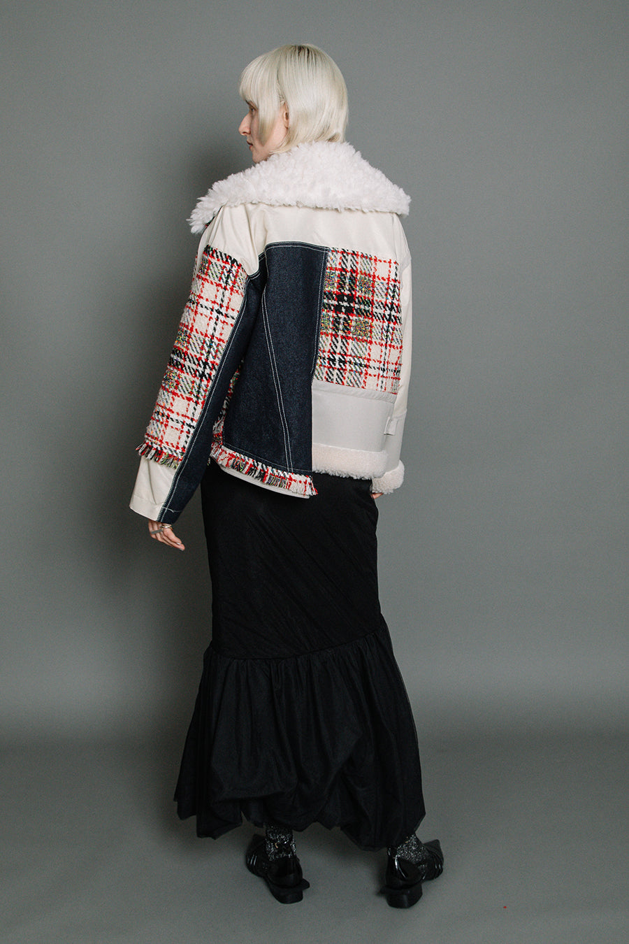 今シーズンは、ツイード、デニム、レザーボアムートン、エコレザー、ファー、ナイロンツイルの6素材を使用し、右見頃はB-3風ボンバーブルゾン、左前身頃は立体ビッグポケット付きツイードブルゾン。
