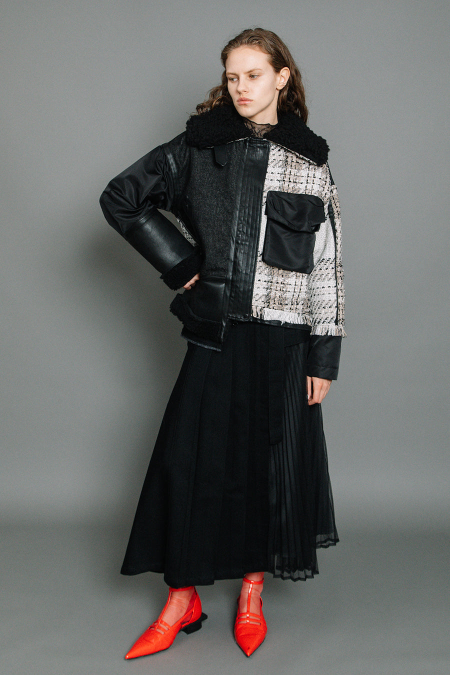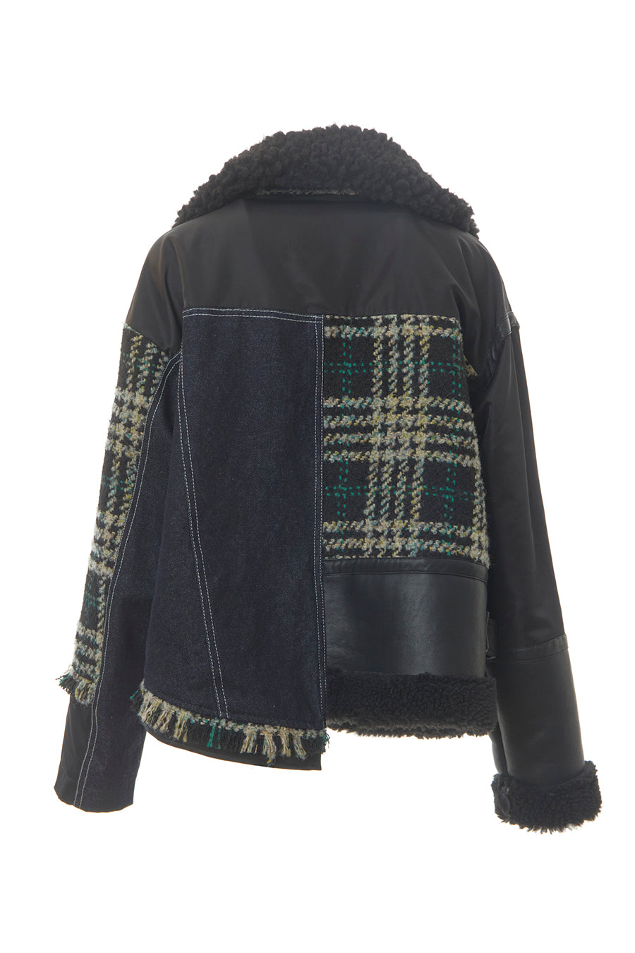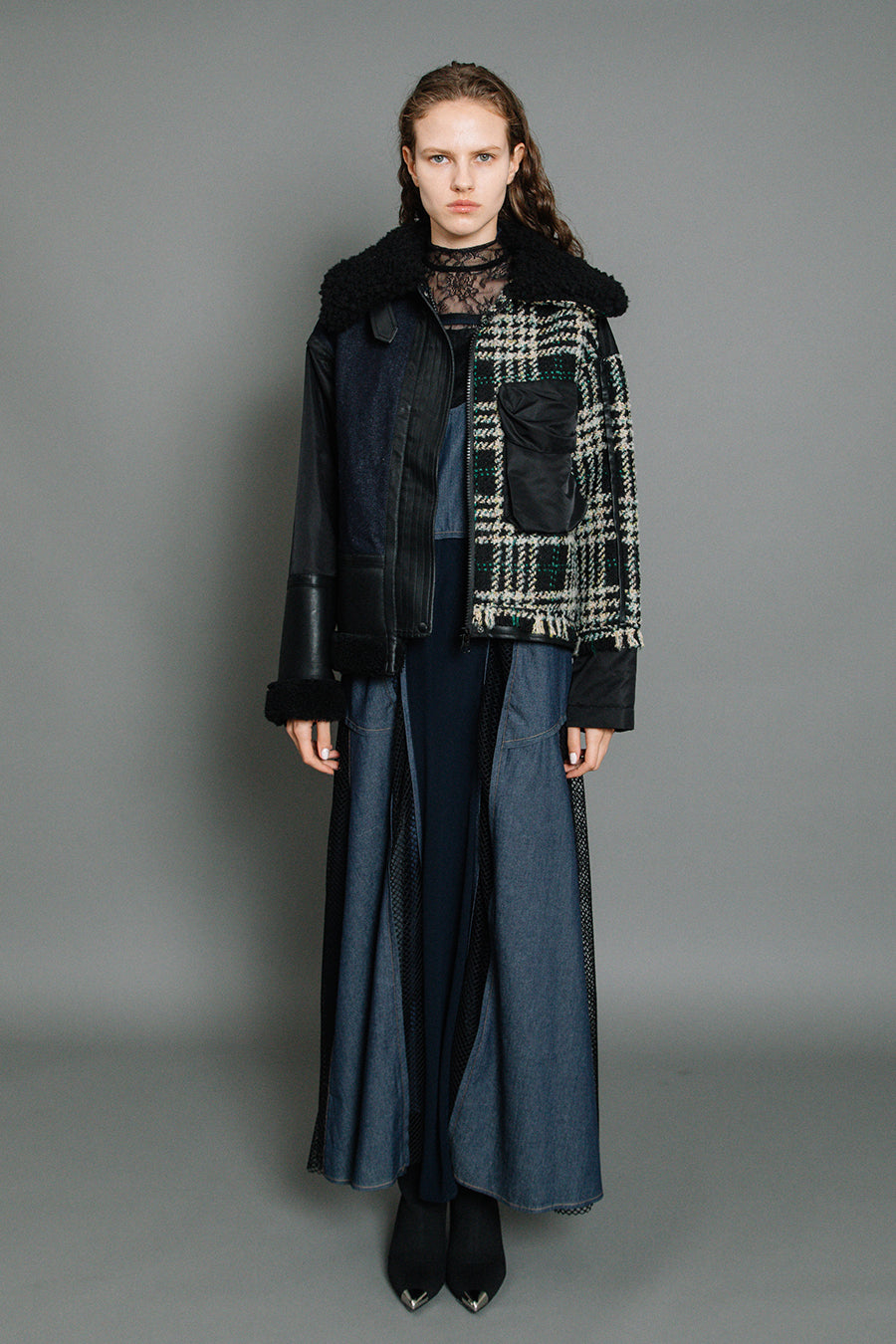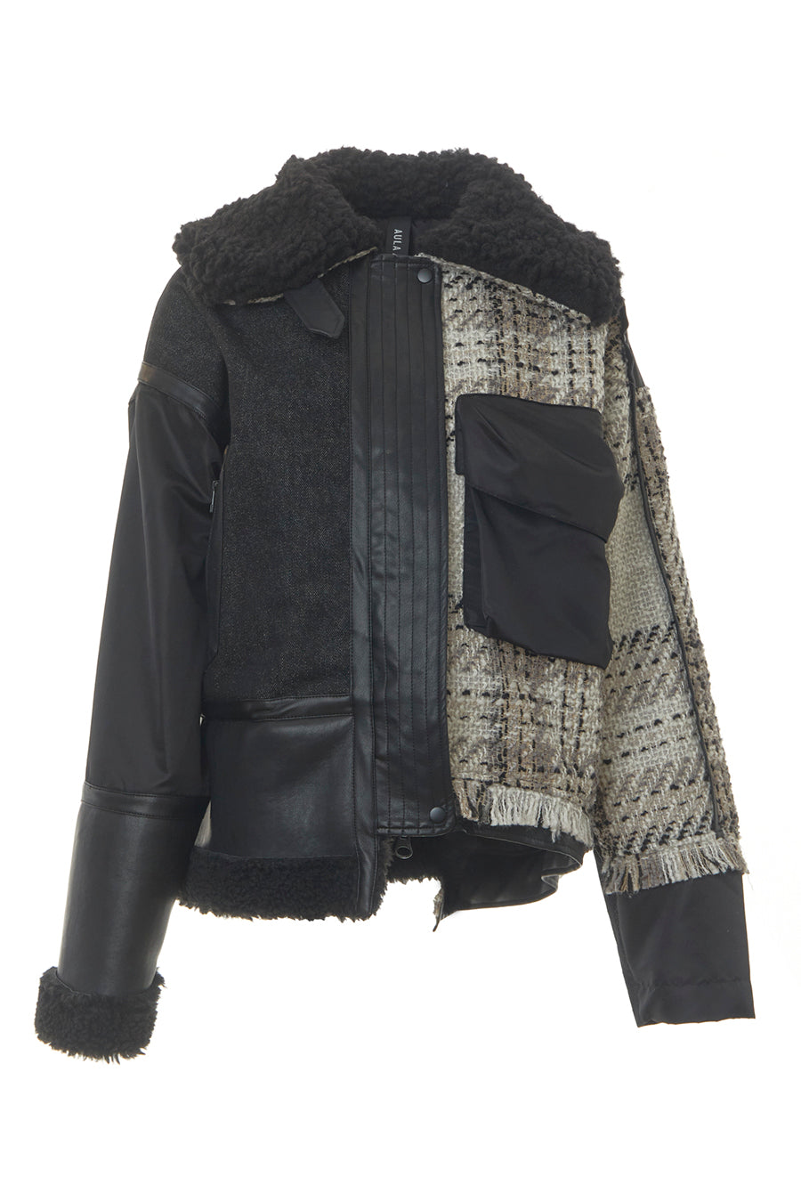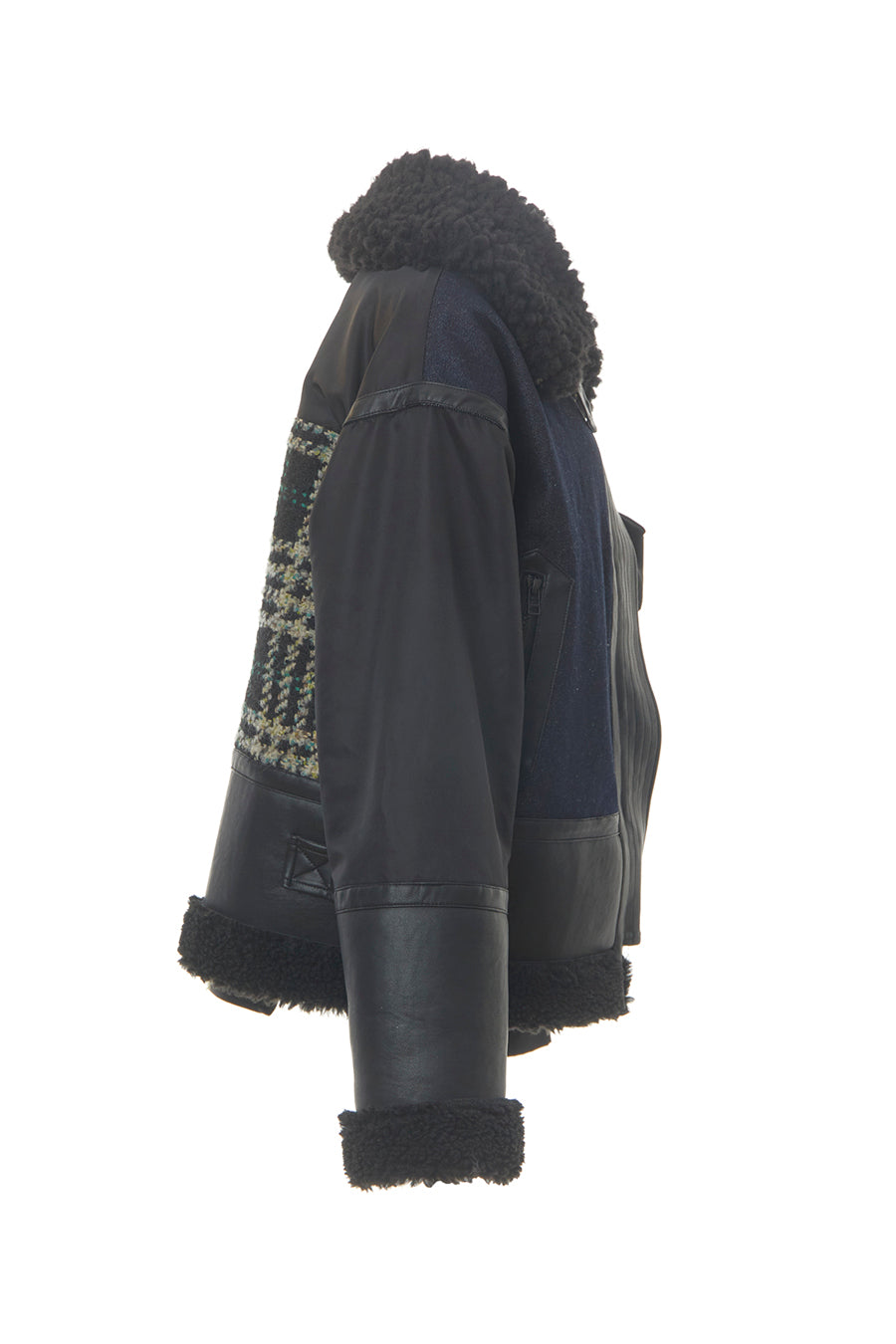 今シーズンは、ツイード、デニム、レザーボアムートン、エコレザー、ファー、ナイロンツイルの6素材を使用し、右見頃はB-3風ボンバーブルゾン、左前身頃は立体ビッグポケット付きツイードブルゾン。