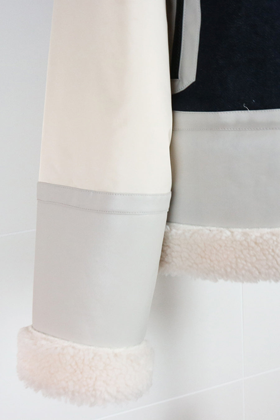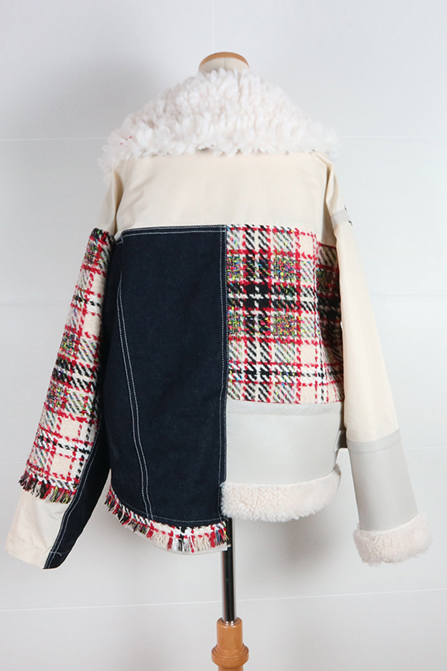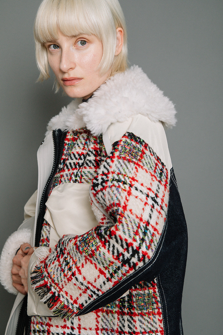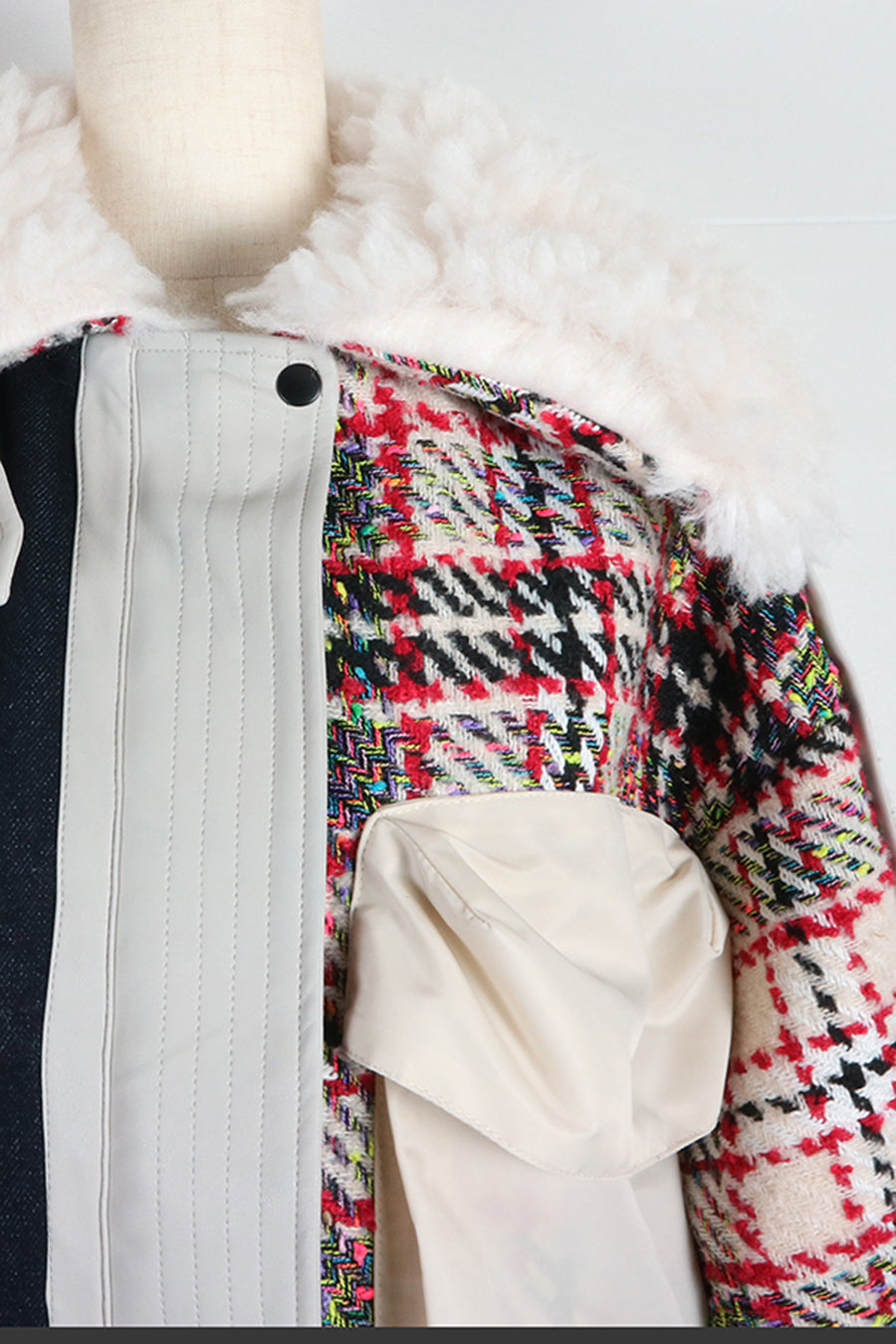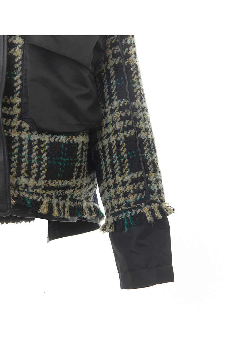 今シーズンは、ツイード、デニム、レザーボアムートン、エコレザー、ファー、ナイロンツイルの6素材を使用し、右見頃はB-3風ボンバーブルゾン、左前身頃は立体ビッグポケット付きツイードブルゾン。