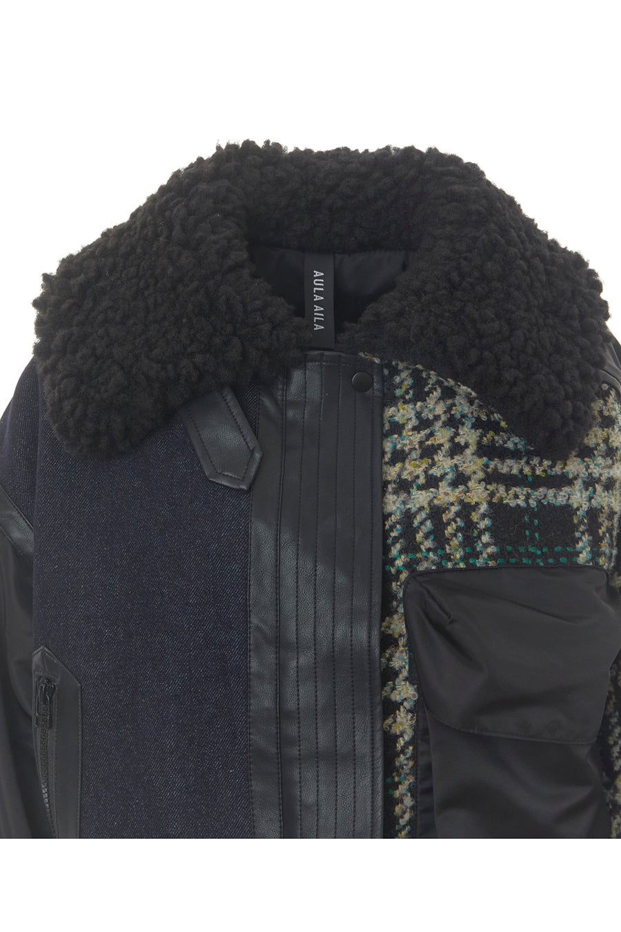 後ろ見頃はデニムGジャンで、大きなファー襟がポイントのデザインに。異素材の40パーツから組み合わされた、他にはないアシンメトリーなデザインが目を惹く、AULA AILAらしいアイテム。